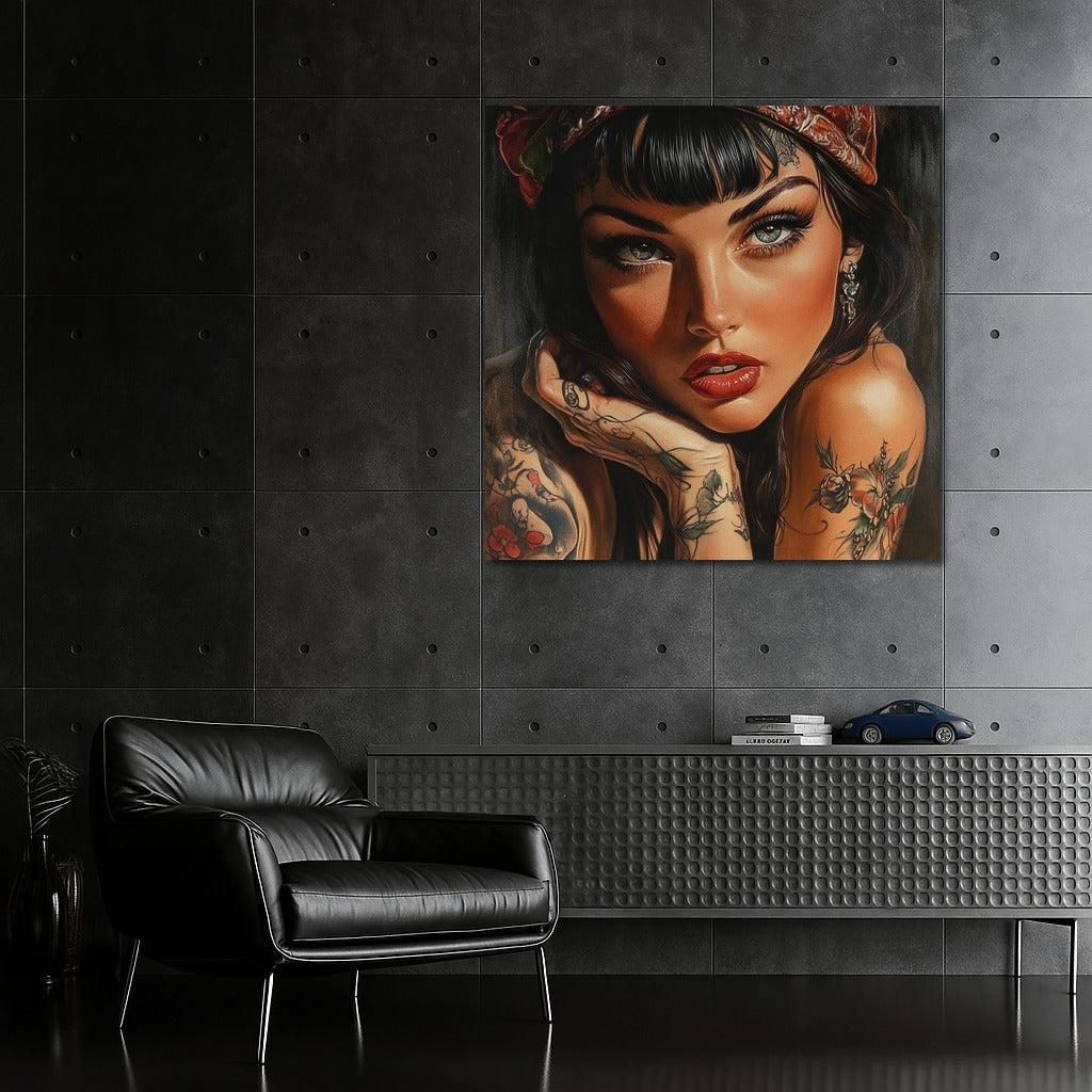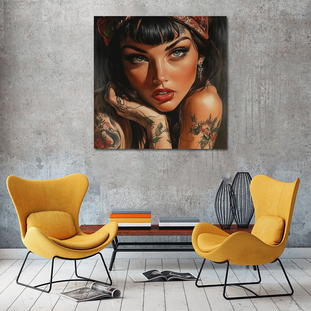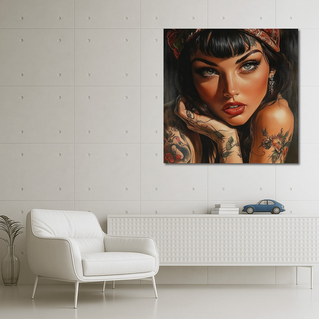 A graceful painting of a girl with expressive eyes and tattoos. This poster will become a bright accent of your wall art. See more from the collection: Wall Art with Women