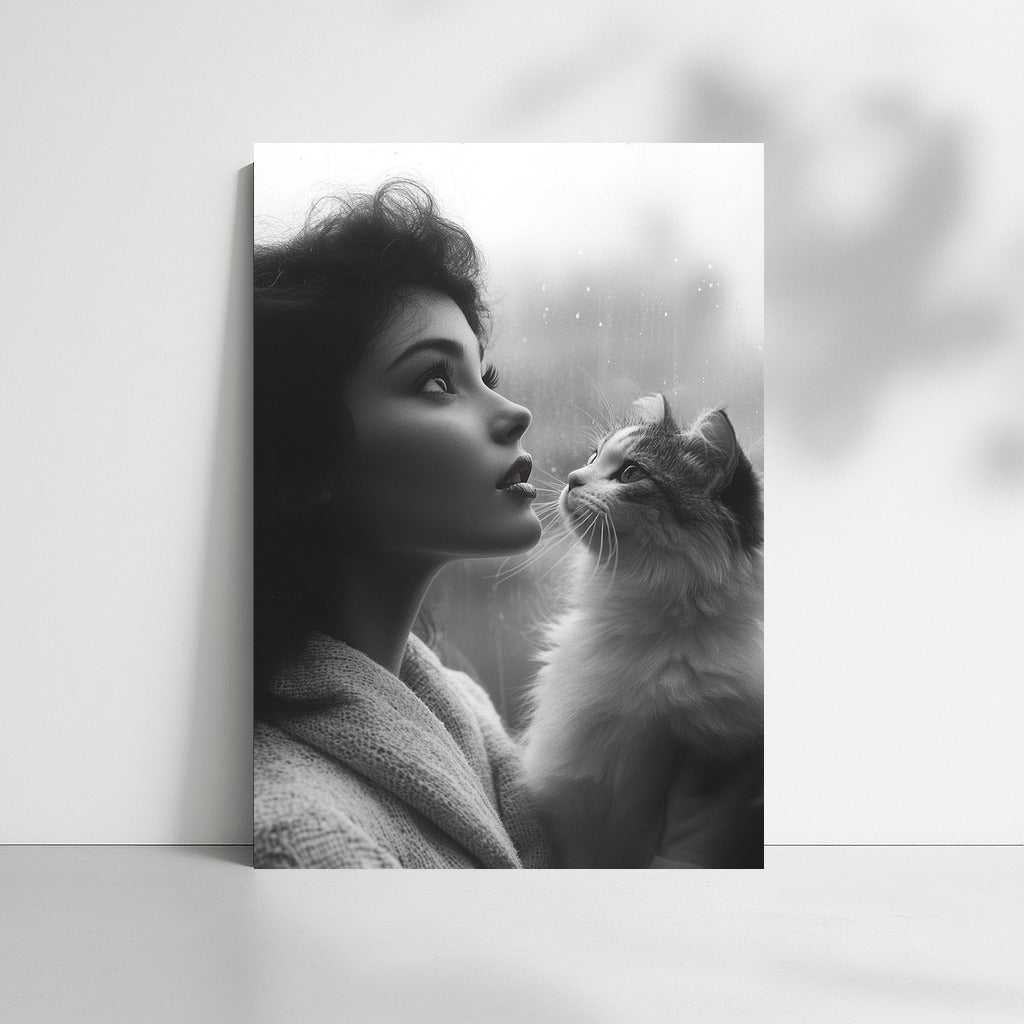 Inspirational poster: a mysterious figure and a cat watching the rain. Perfect wall art for lovers of coziness and dreams. See more from the collection: Black and White Art