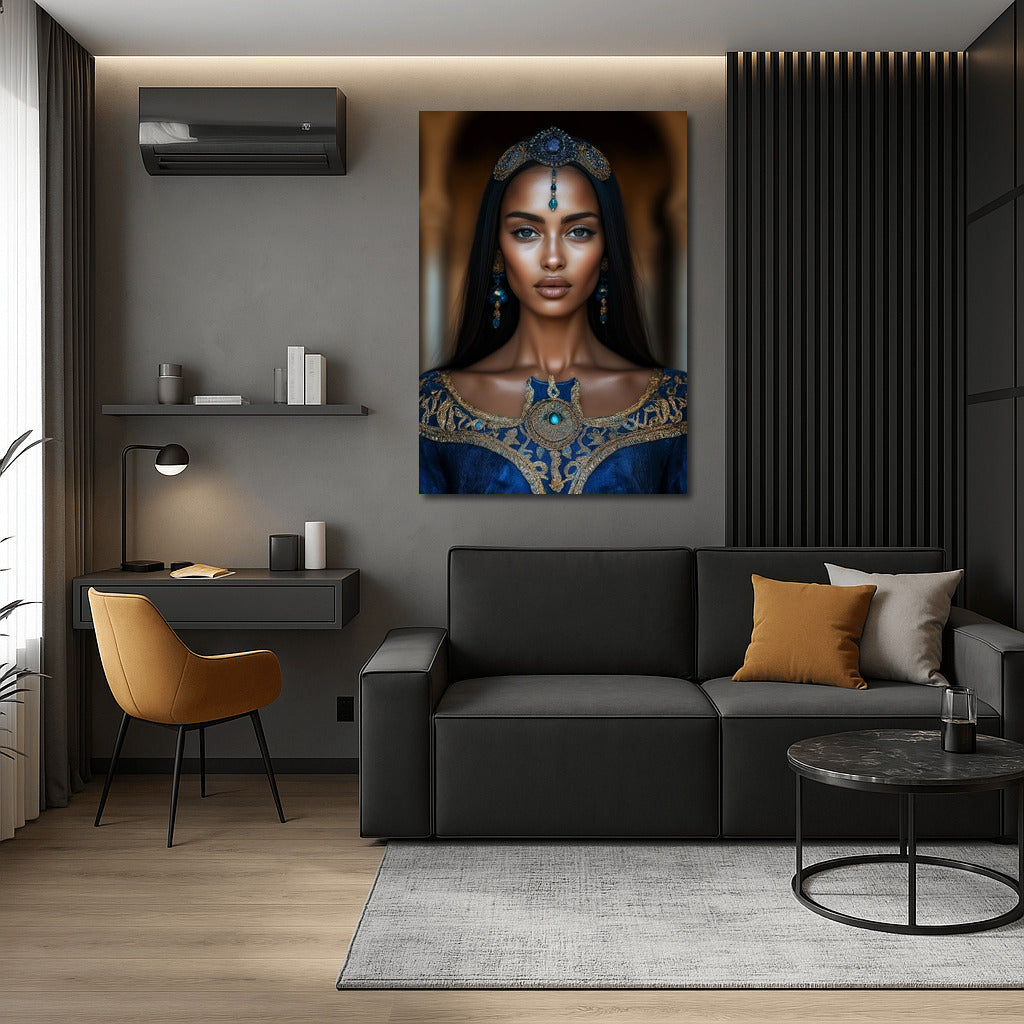 An elegant painting of an image in ethnic attire. Wall art that embodies mystery and culture. See more from the collection: Wall Art with Women