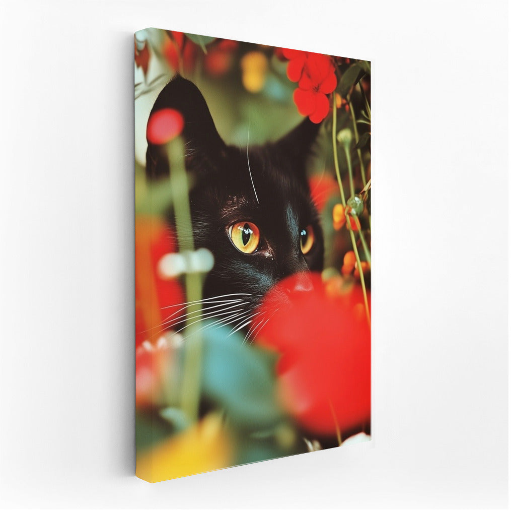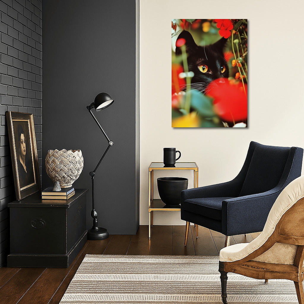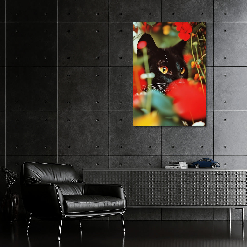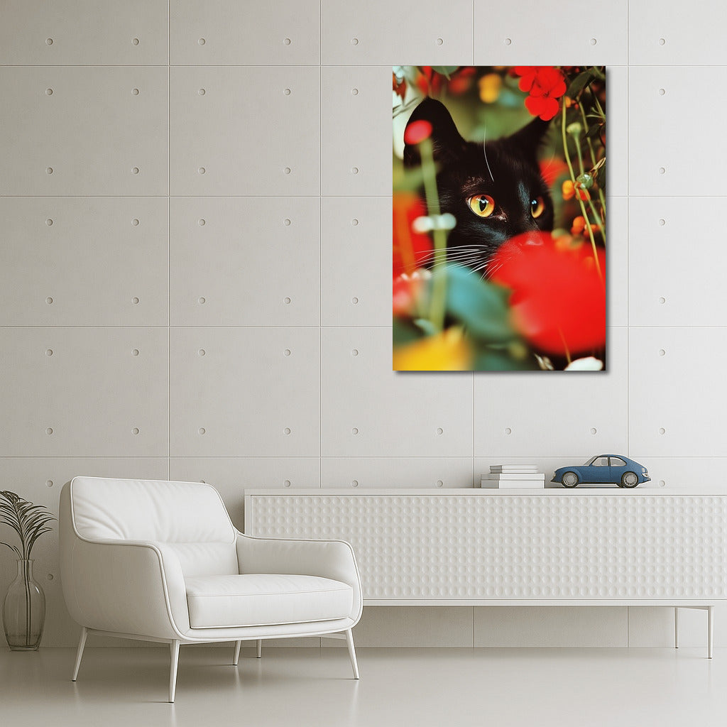 Vivid poster: mysterious look of black cat through magical garden of flowers. Perfect wall art for your home. See more from the collection: Animals Art