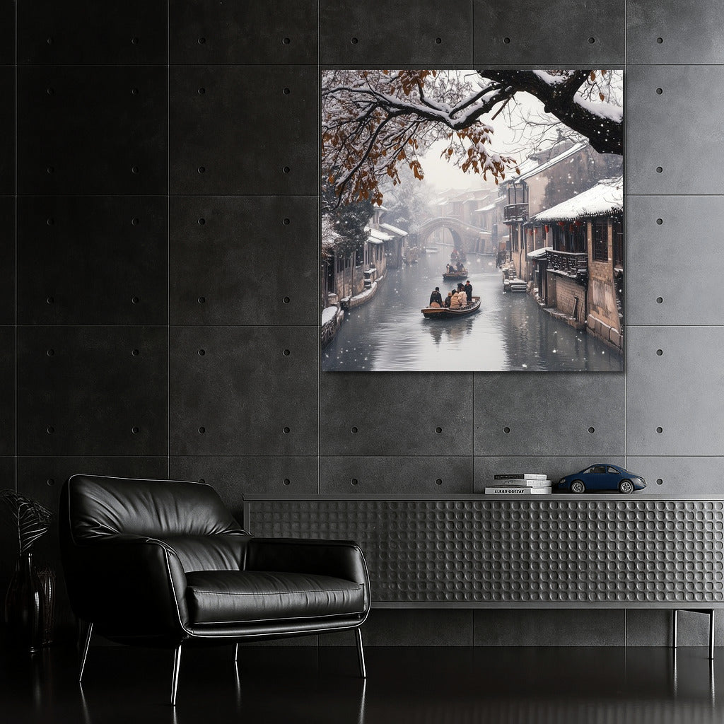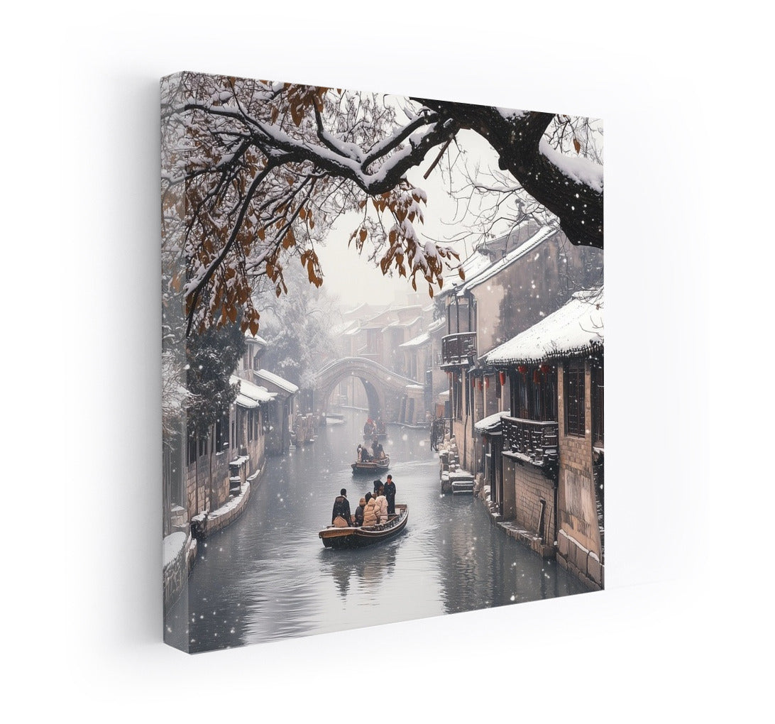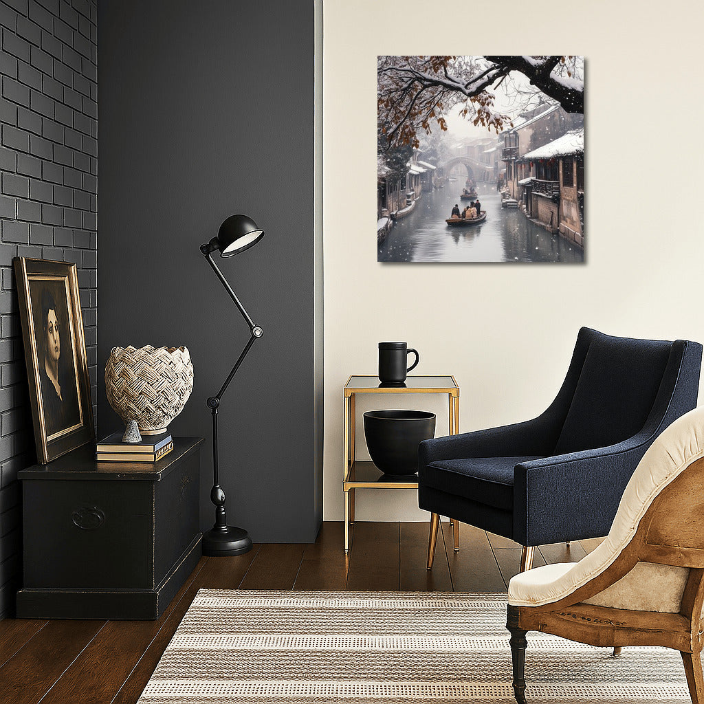 A winter fairy tale comes to life: an old canal, boats and a mysterious atmosphere. This poster will add magic to your home! See more from the collection: Mixed Wall Art