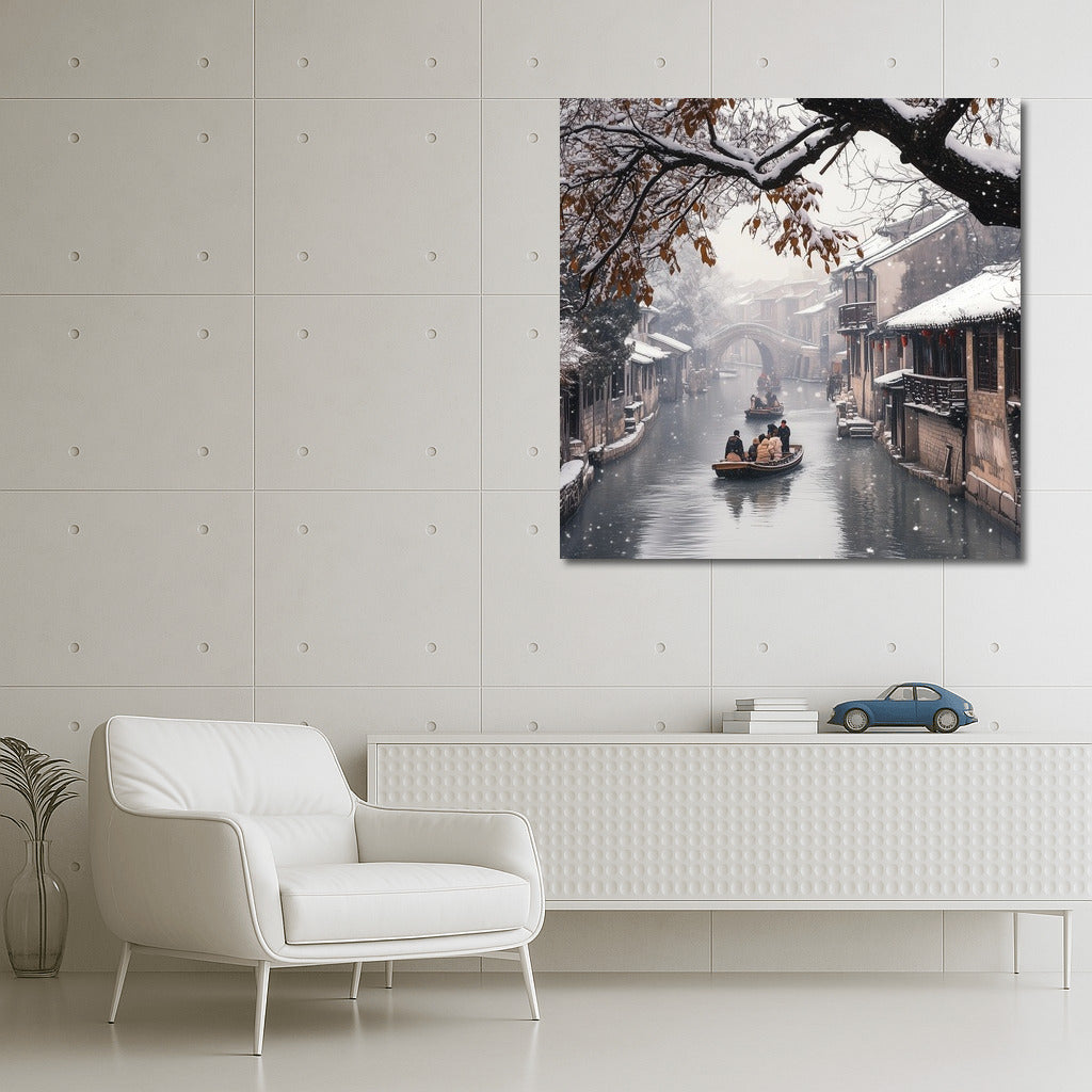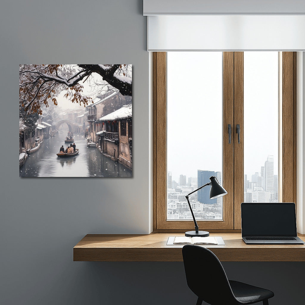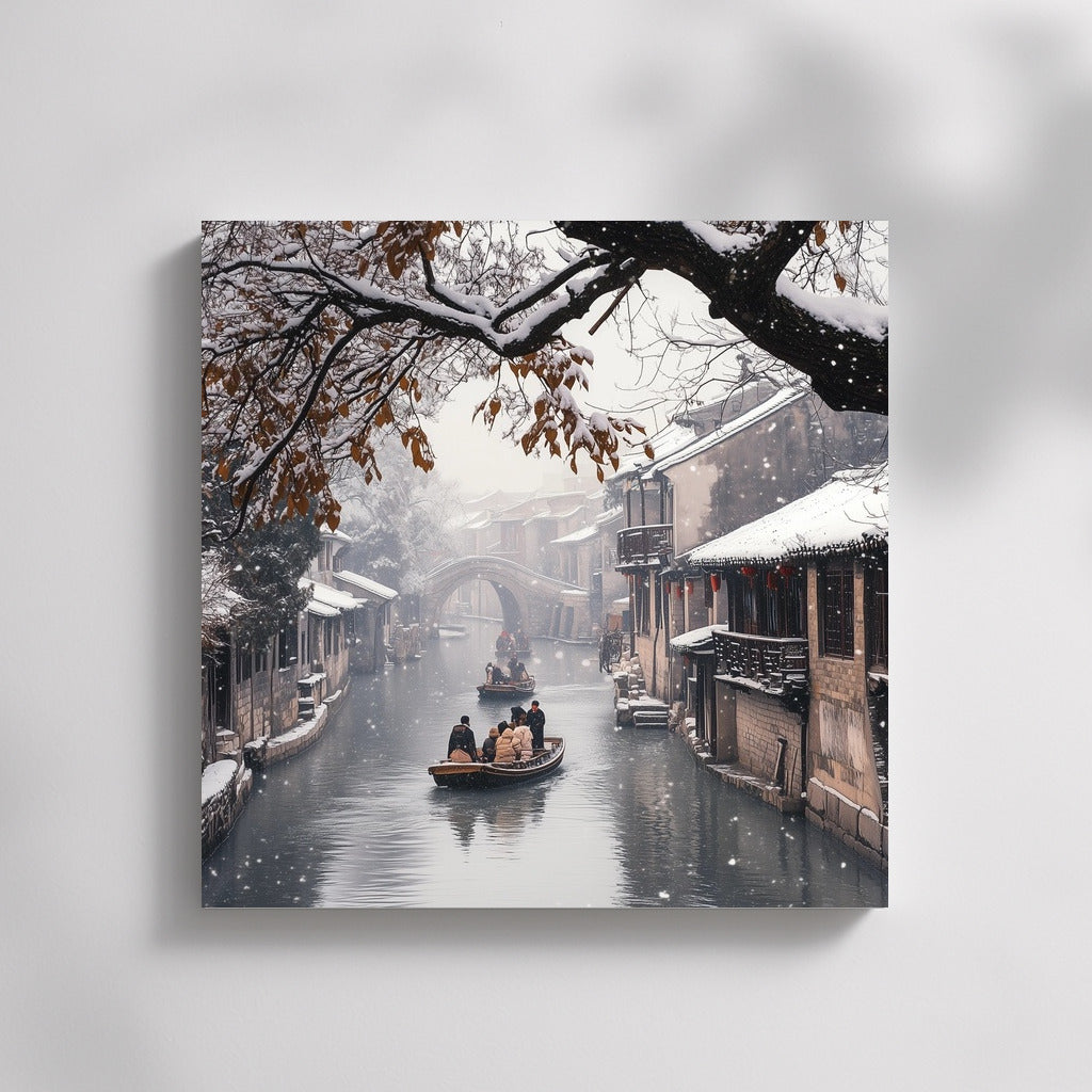 A winter fairy tale comes to life: an old canal, boats and a mysterious atmosphere. This poster will add magic to your home! See more from the collection: Mixed Wall Art