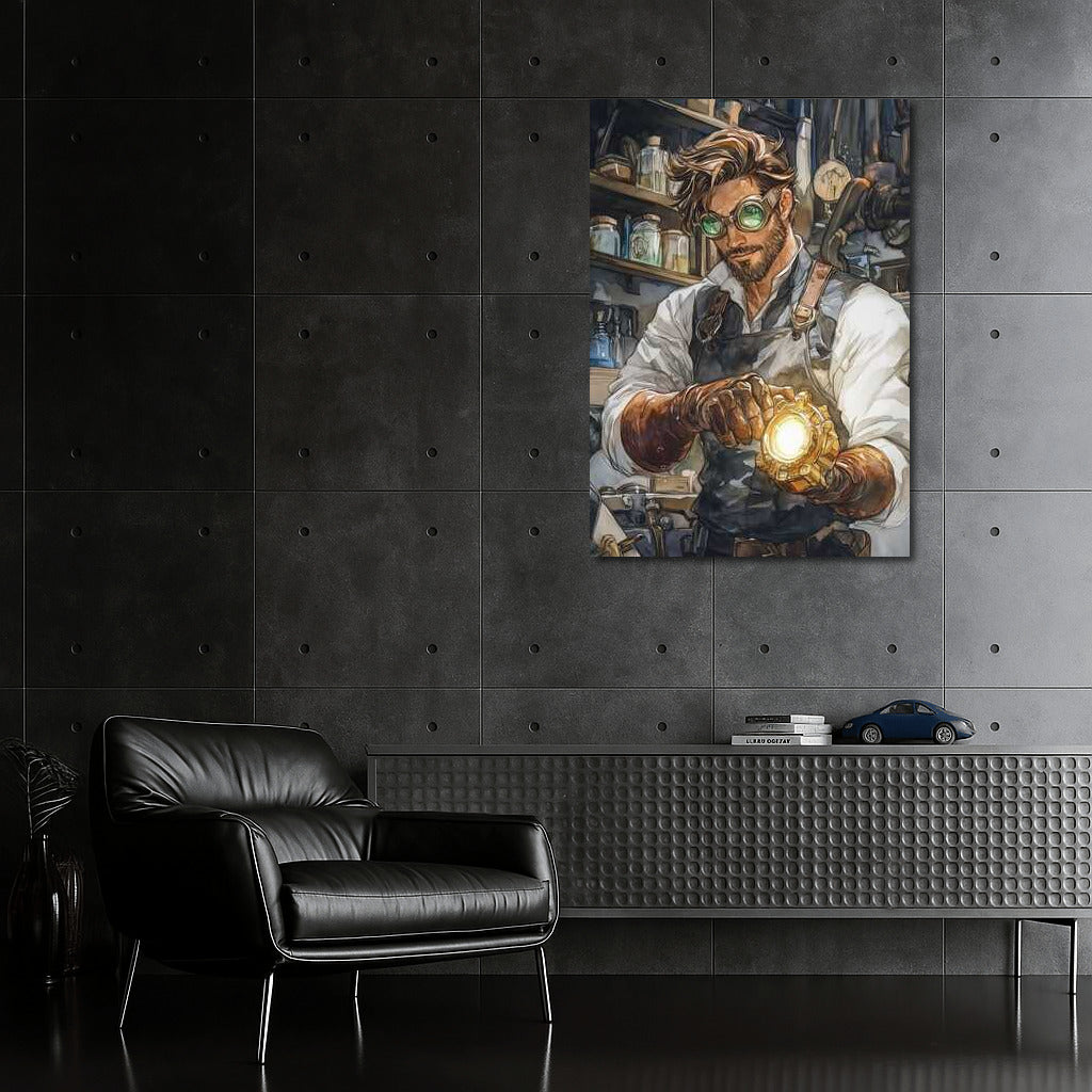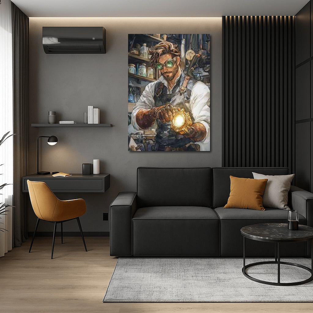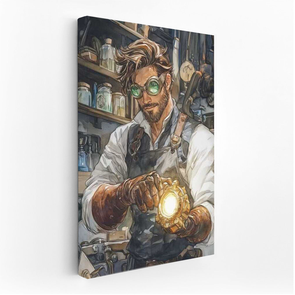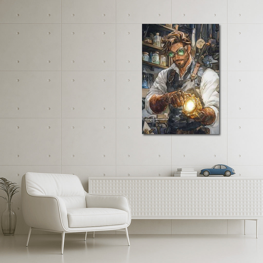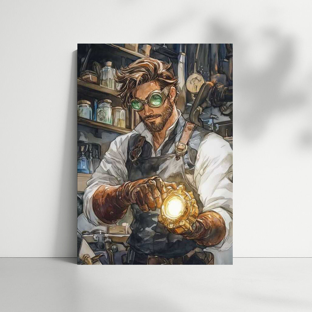 Dive into the world of Steampunk with this exciting poster: a mysterious inventor, the light of technology and magic in every stroke. See more from the collection: Steampunk Art