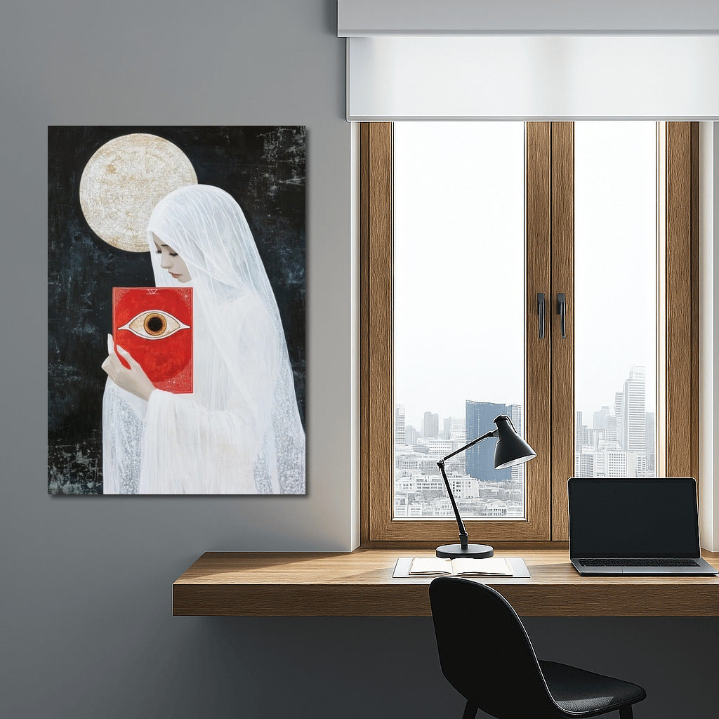 A mysterious figure with a red book against the moon. This poster will create an atmosphere of mysticism and inspiration in your home. See more from the collection: Mixed Wall Art