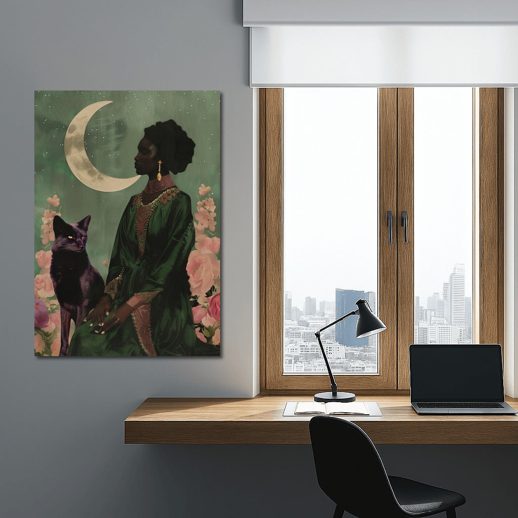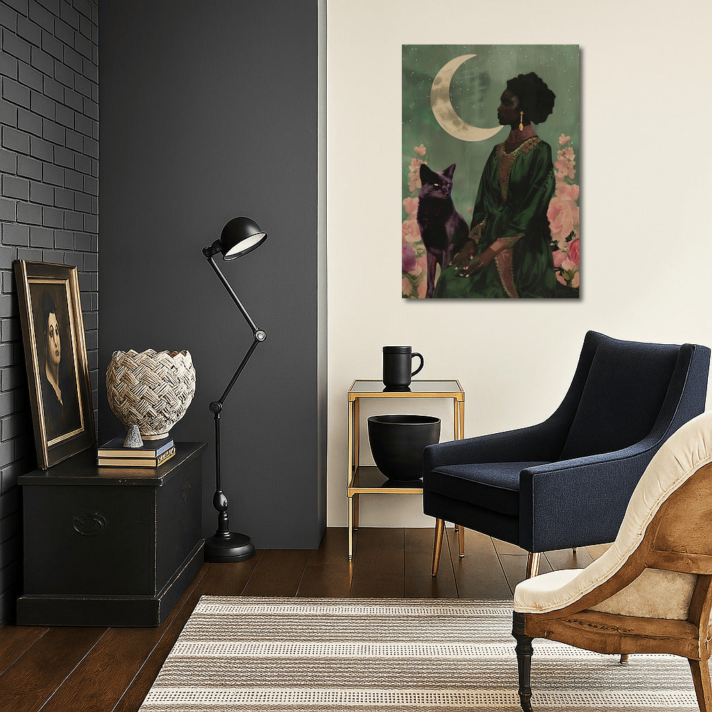 Moonlit night, a mysterious figure and a faithful cat among flowers. Wall art where dreams come alive through a delicate palette. See more from the collection: Mixed Wall Art