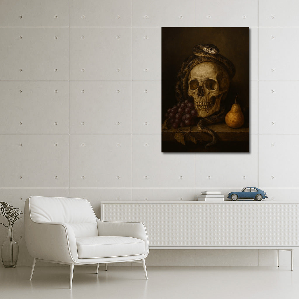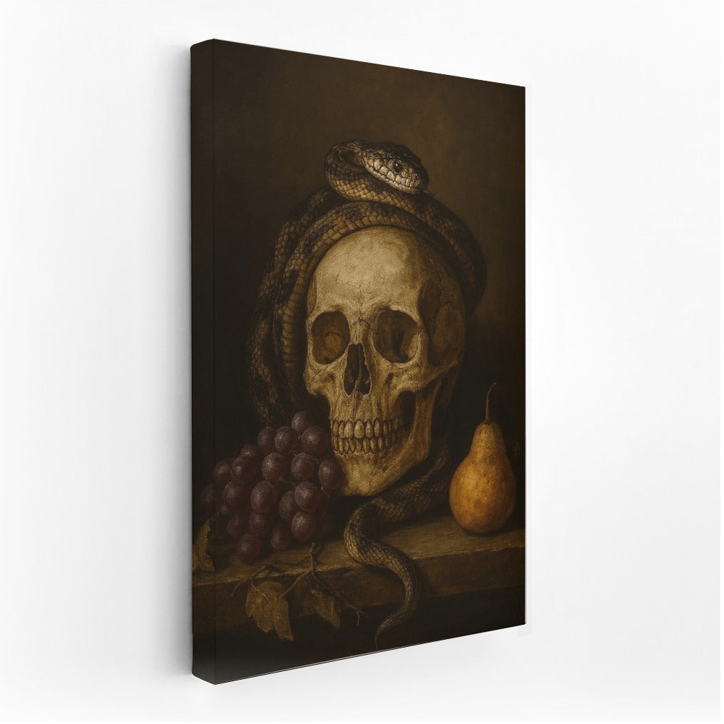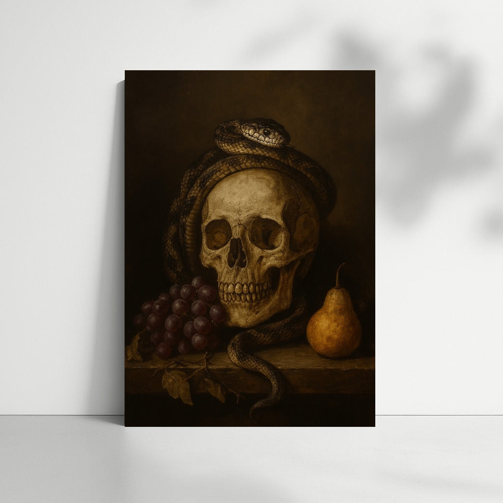 Skull, snake and grapes embody the mysterious atmosphere of Dark Academia. A poster for lovers of mysterious wall art. See more from the collection: Dark Academia Art