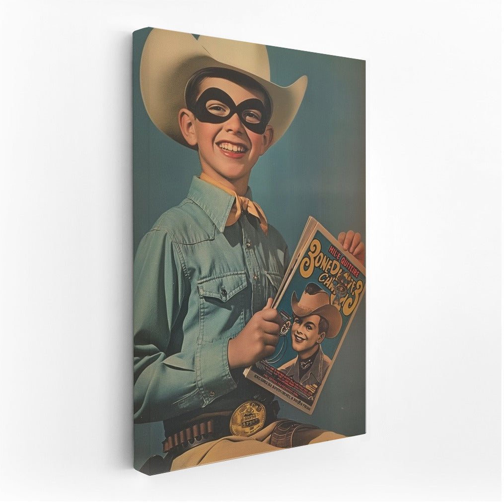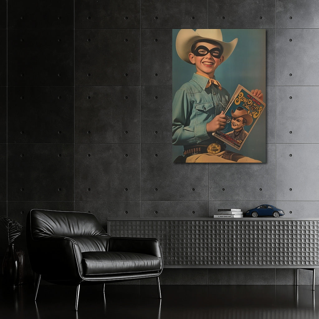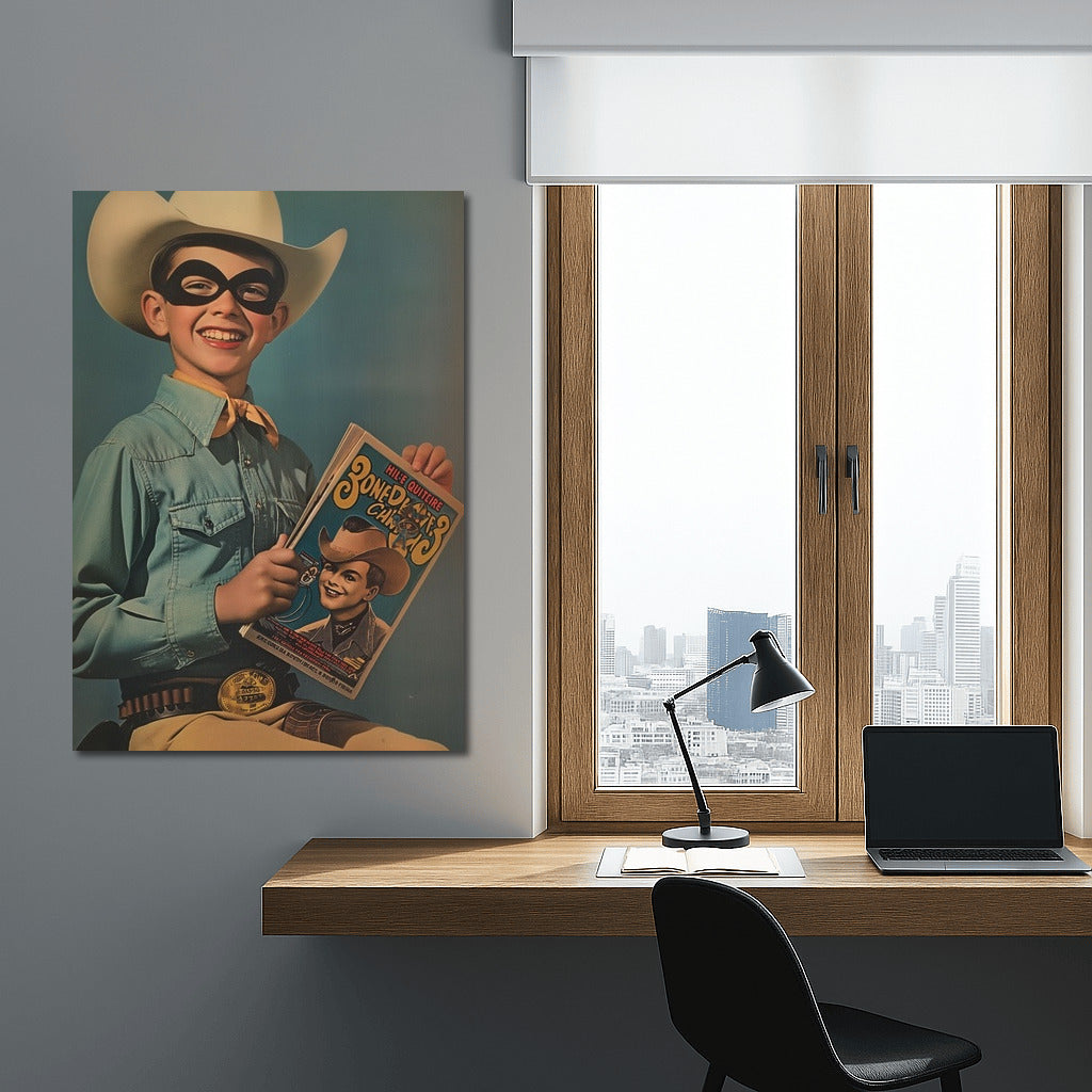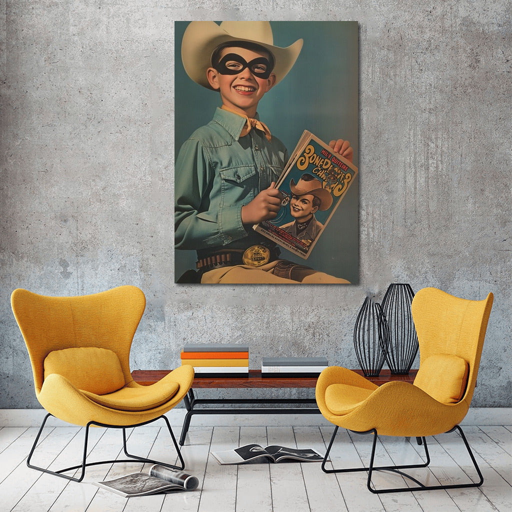 Bright poster with a smiling boy in a hat and mask holding a magazine cover. Wall art for your interior! See more from the collection: Pop Art