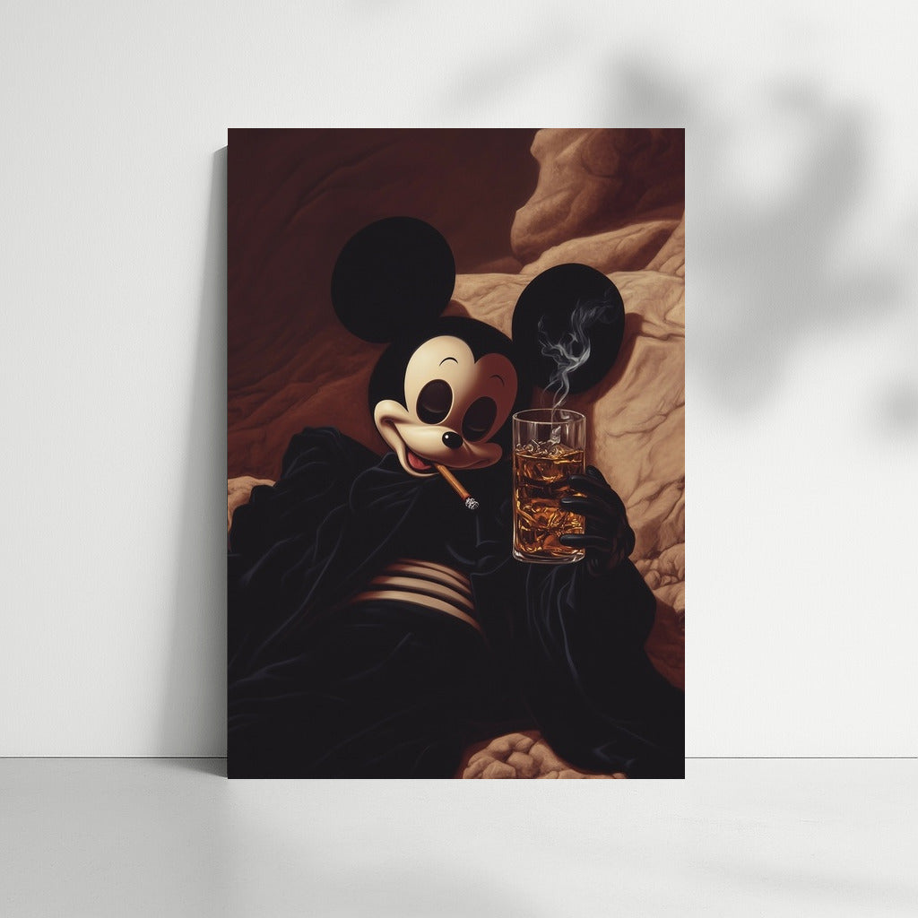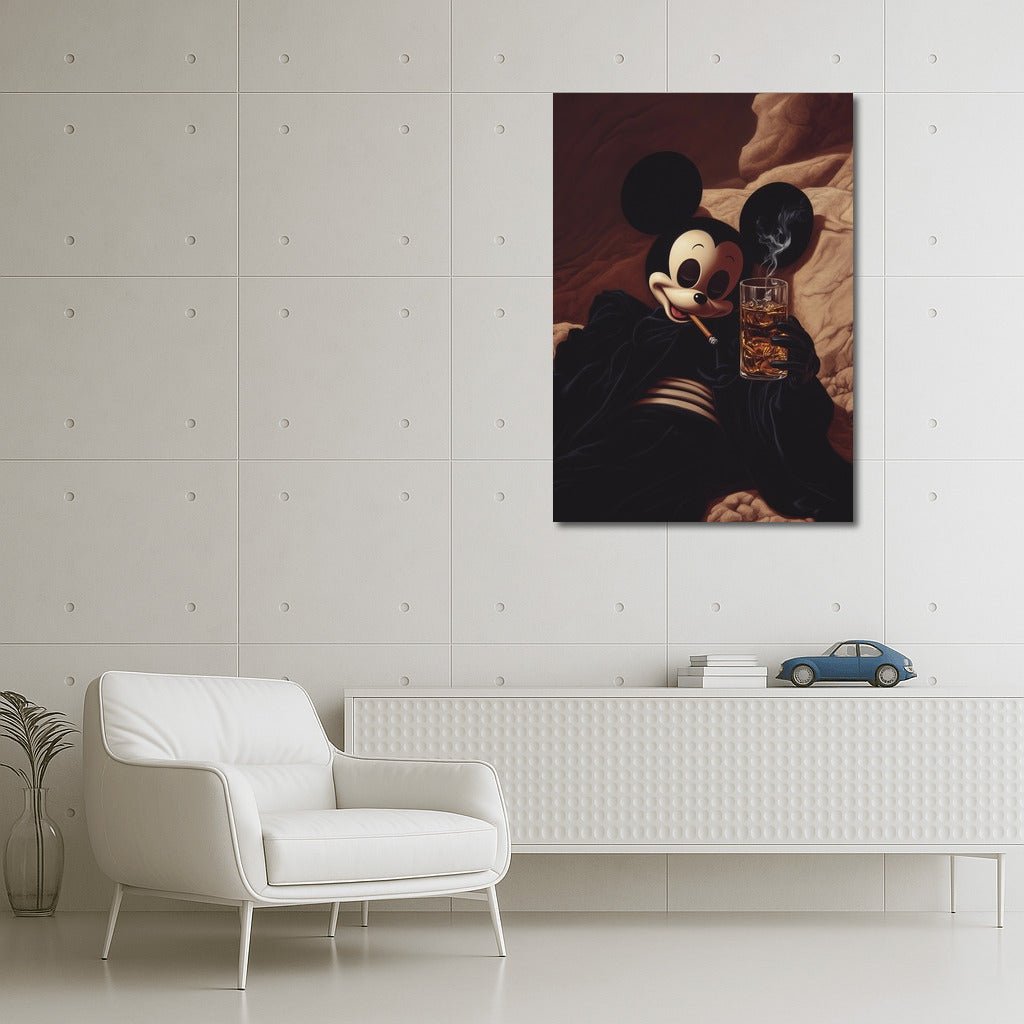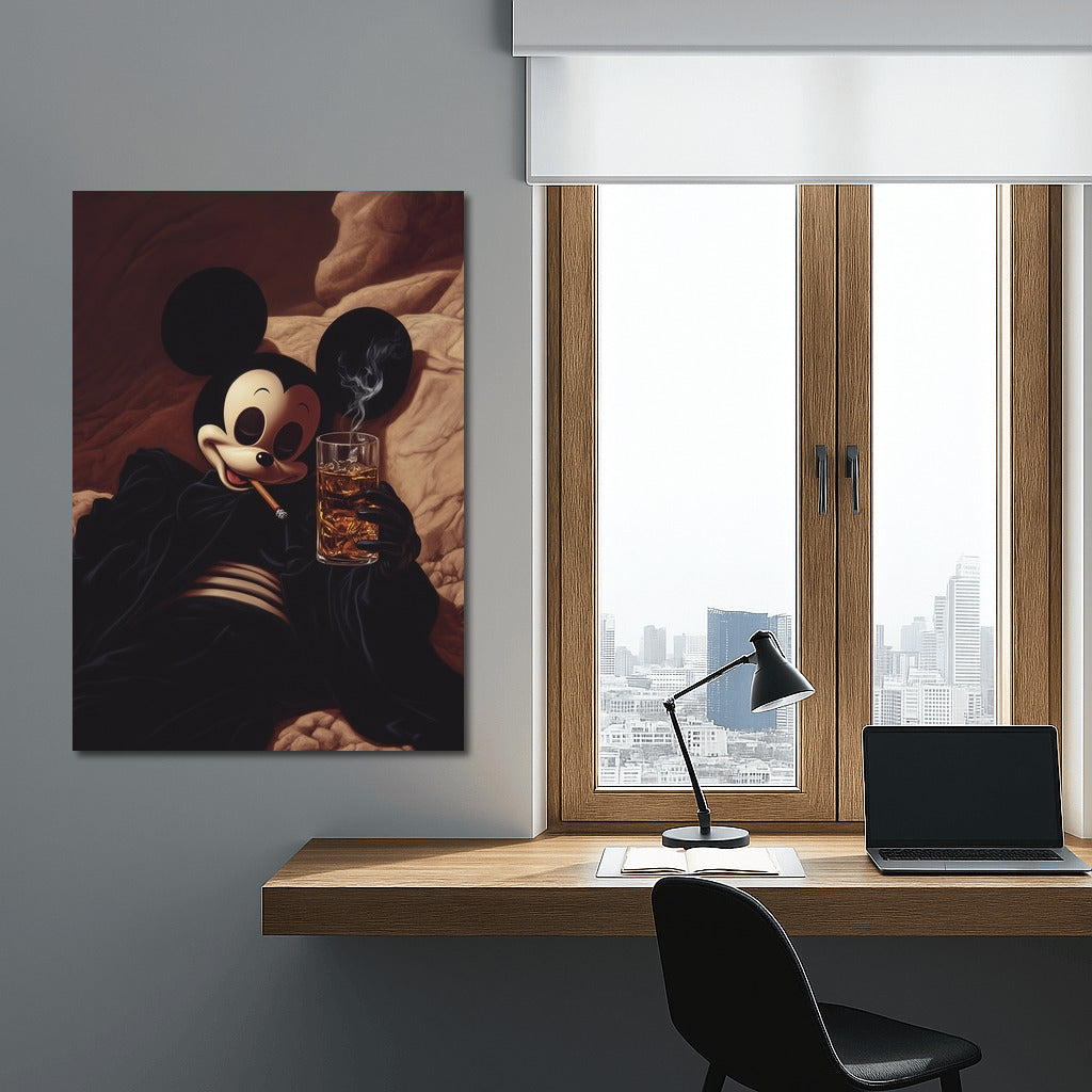 A graceful twist on a classic: a stylish and mysterious painting of a cartoon character wrapped in the smoky coziness of an evening. Wall art with character. See more from the collection: Mixed Wall Art