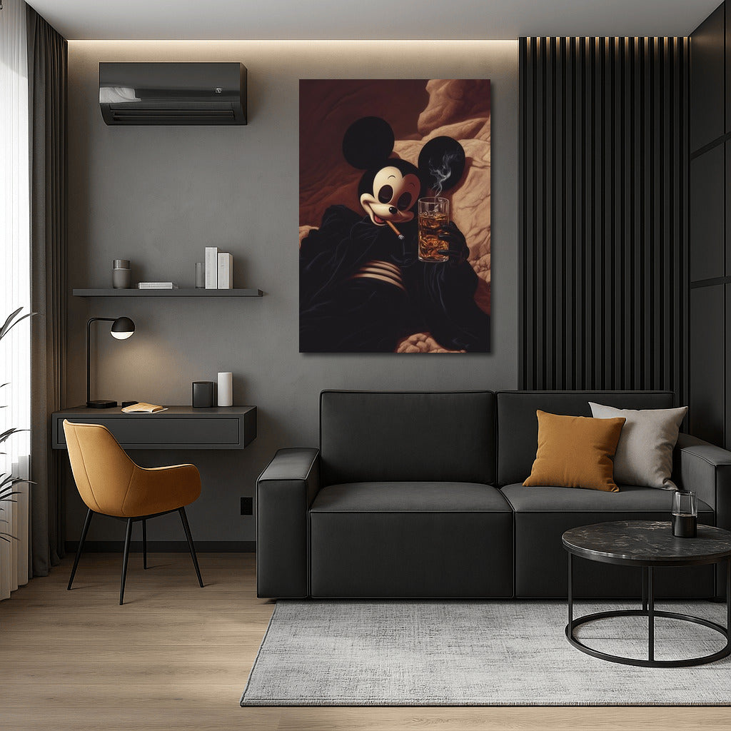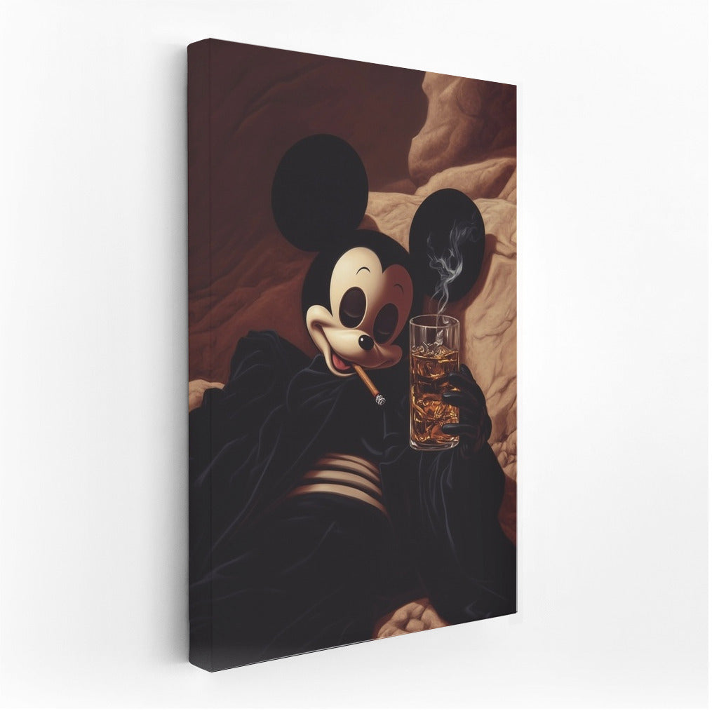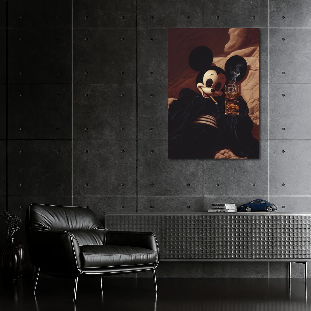 A graceful twist on a classic: a stylish and mysterious painting of a cartoon character wrapped in the smoky coziness of an evening. Wall art with character. See more from the collection: Mixed Wall Art