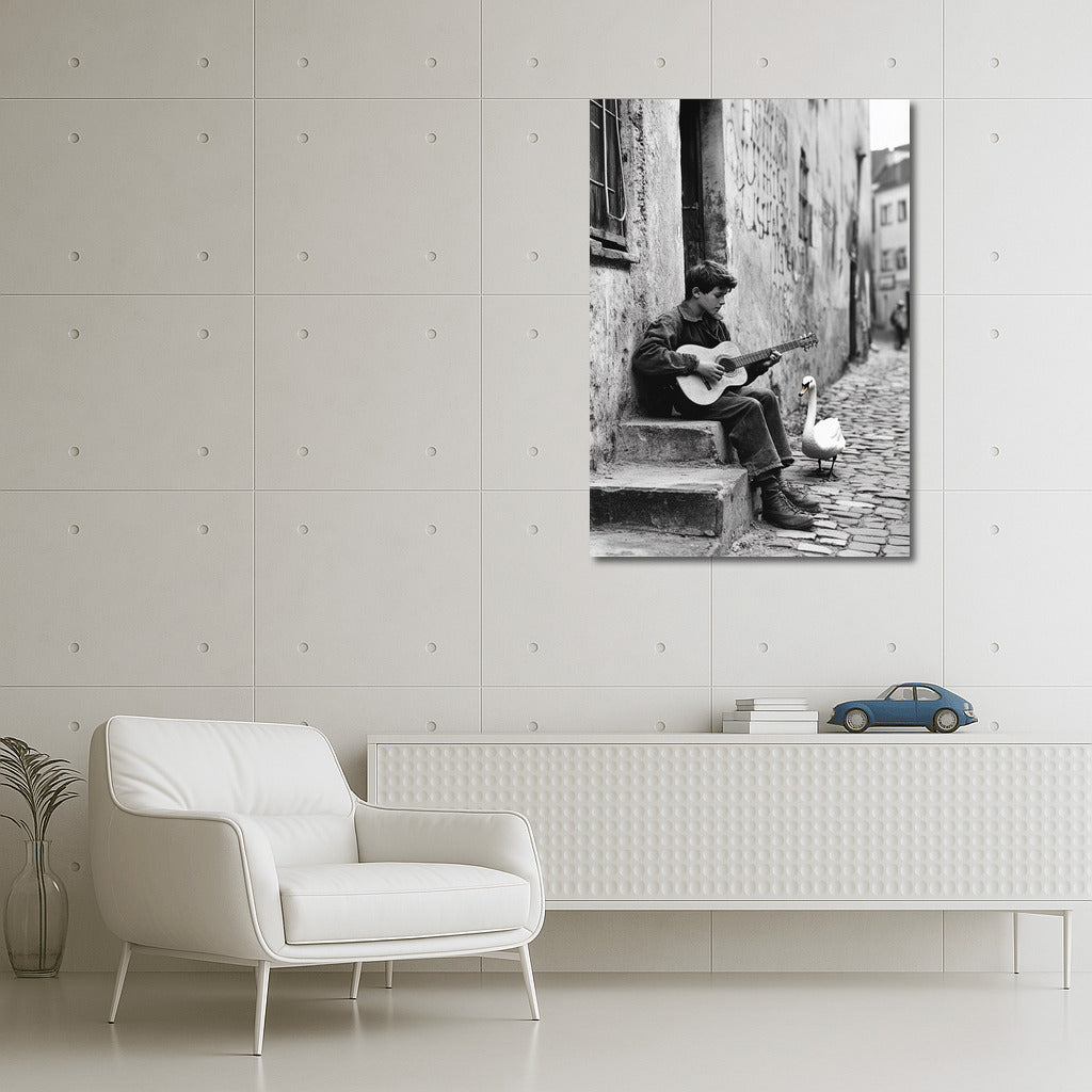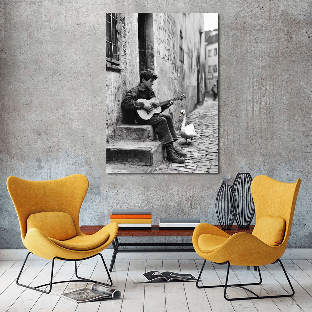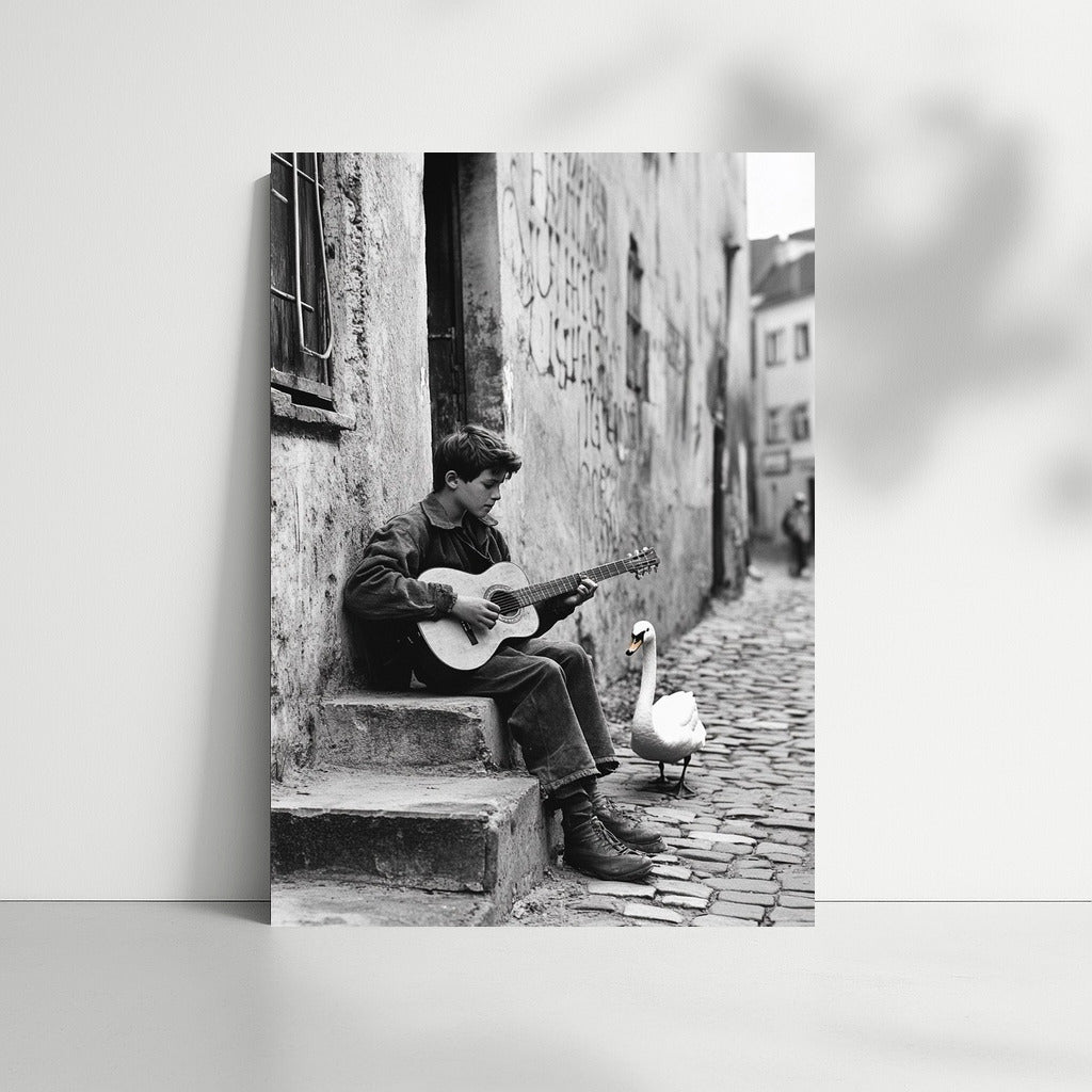The poster brings street melodies to life: a young guitarist and a white swan create an atmosphere of magic among the city walls. See more from the collection: Black and White Art