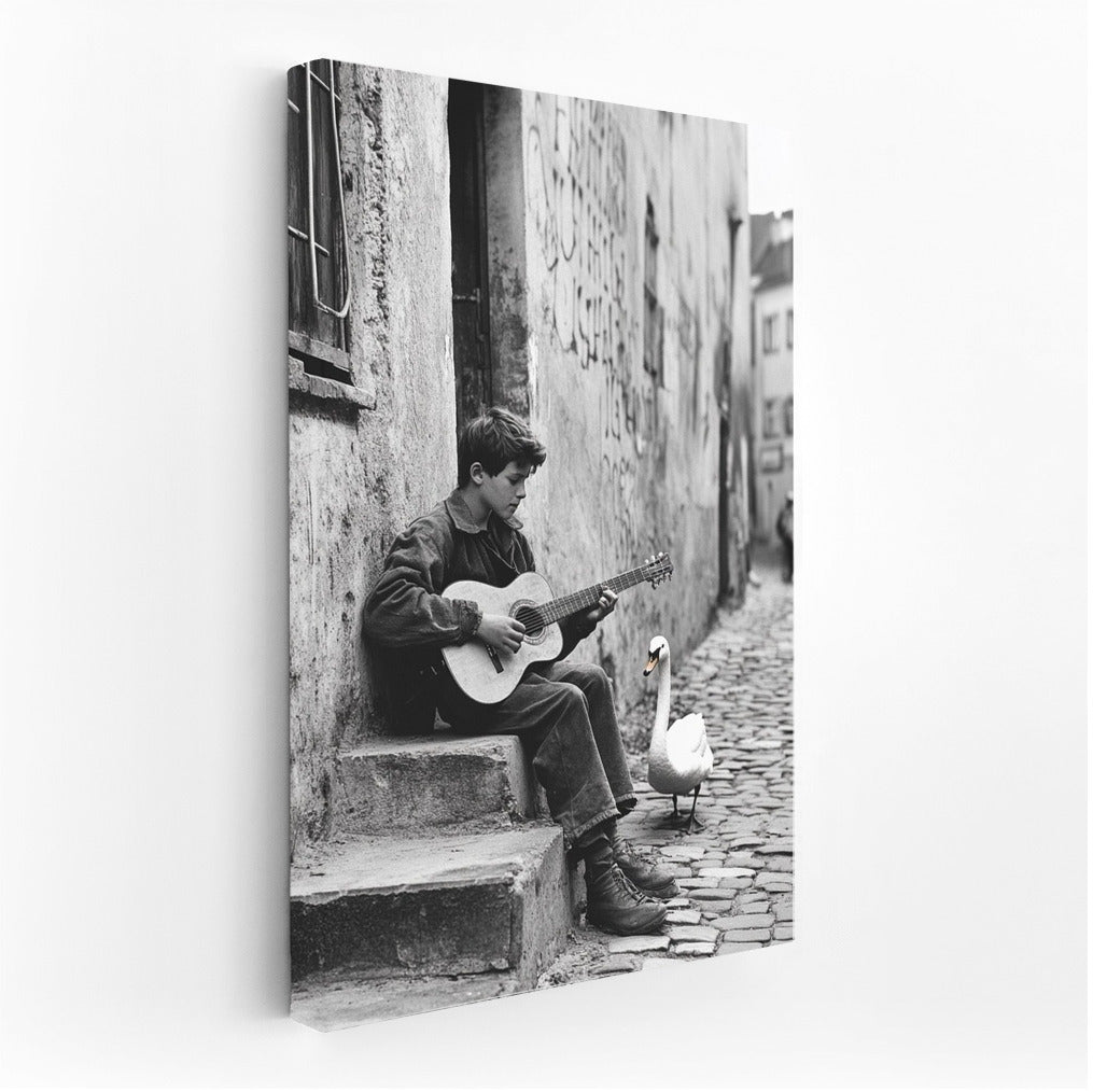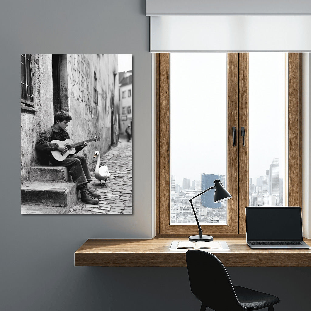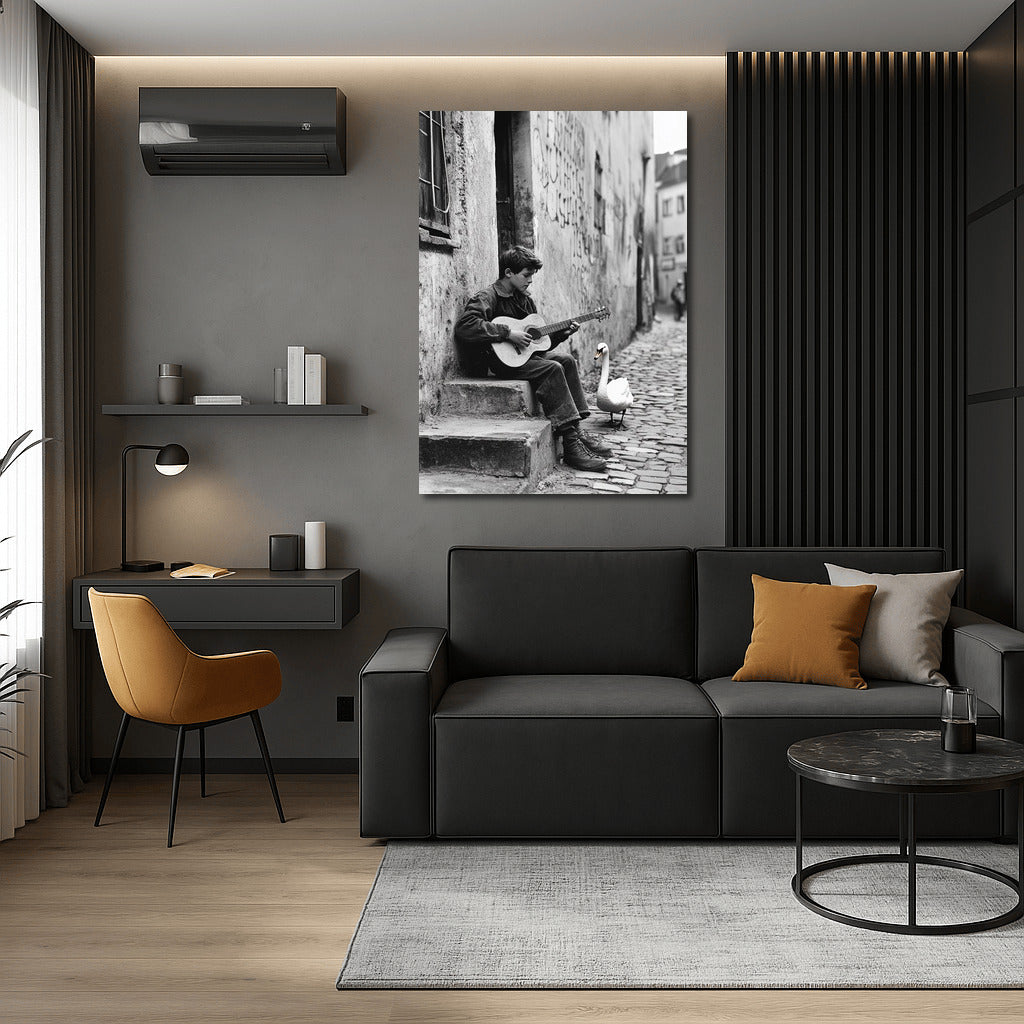 The poster brings street melodies to life: a young guitarist and a white swan create an atmosphere of magic among the city walls. See more from the collection: Black and White Art