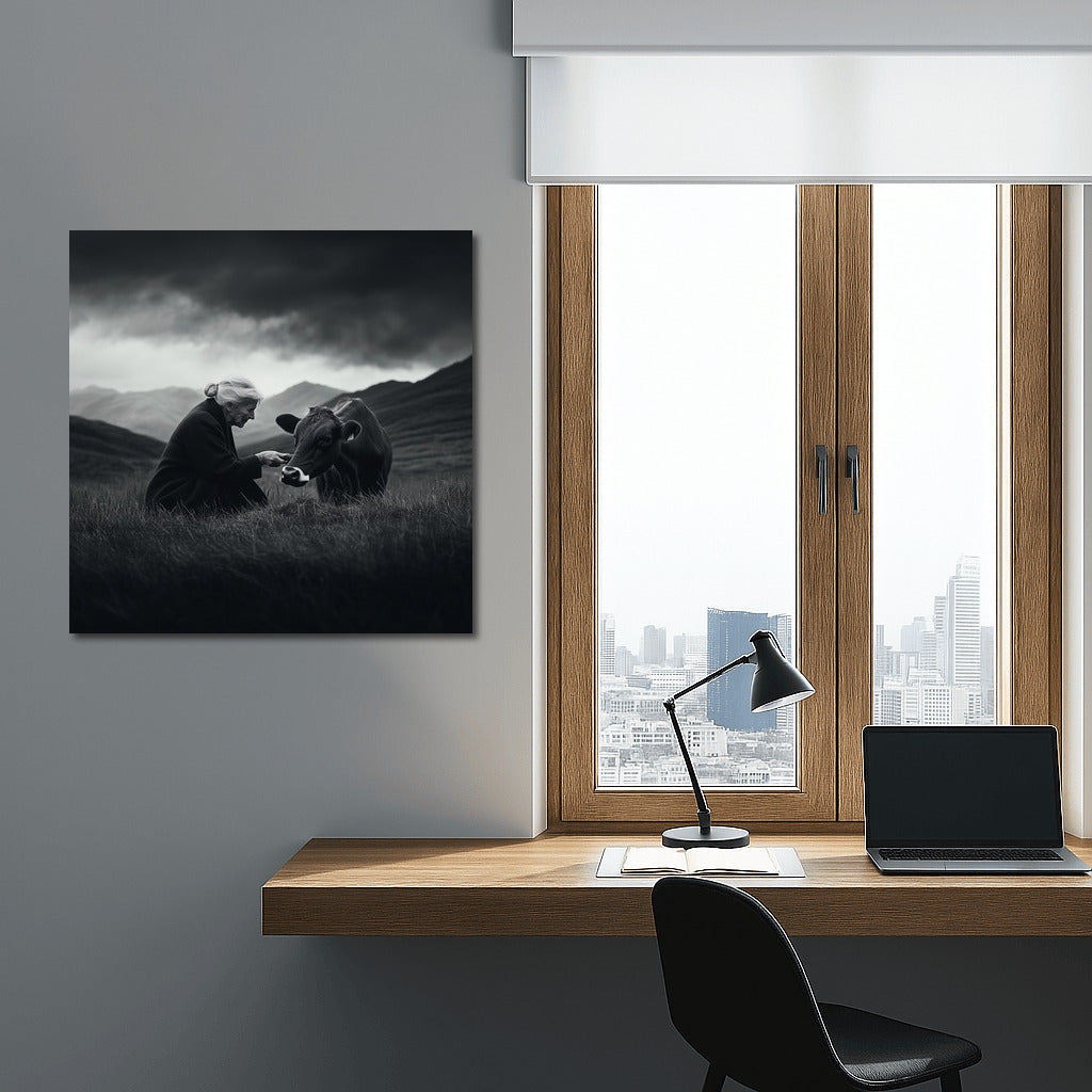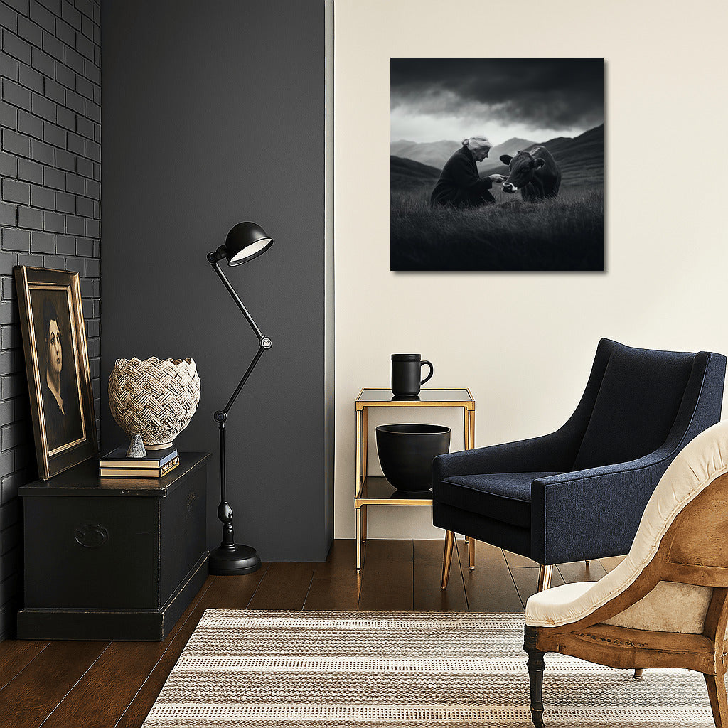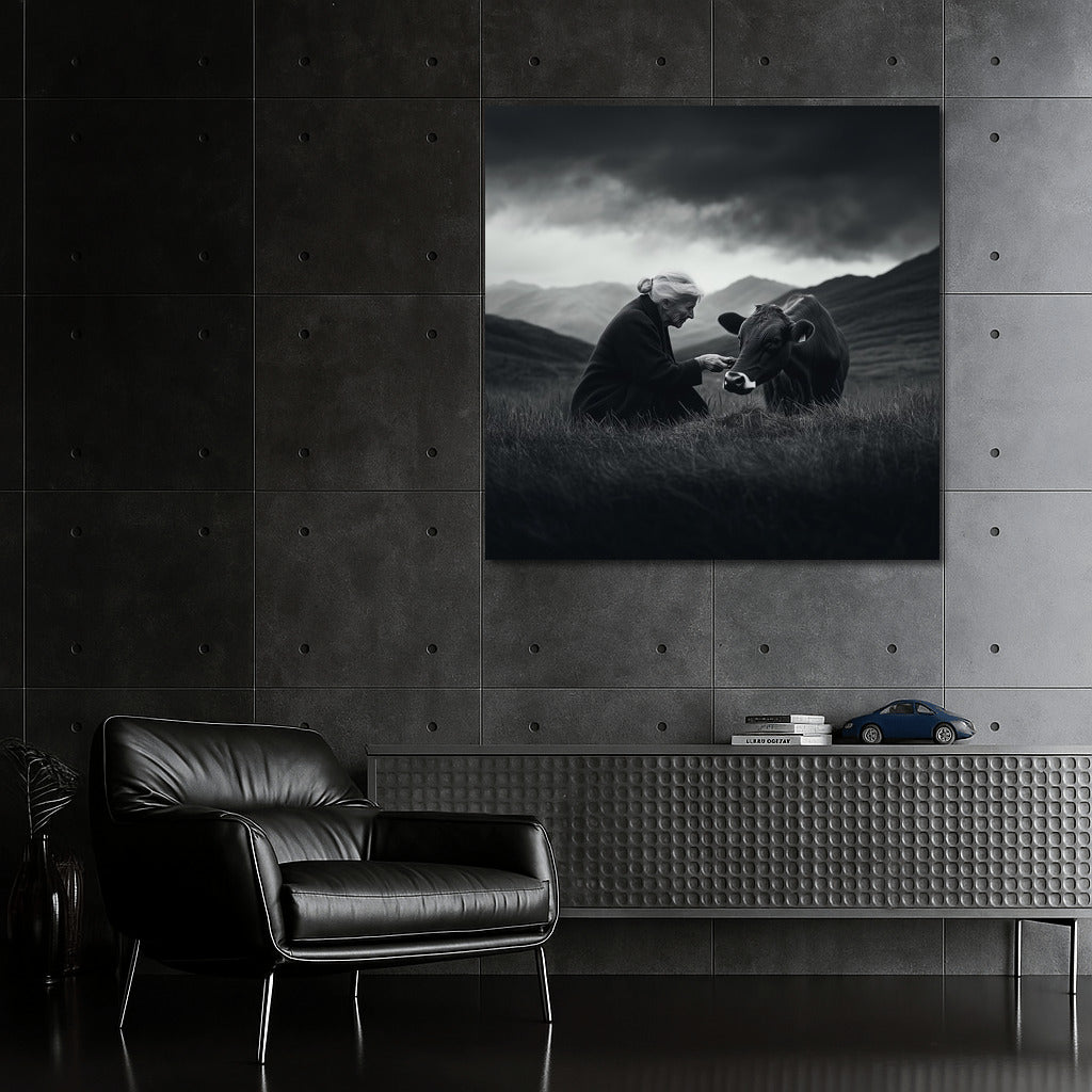 The painting depicts a soft encounter with nature: a man and a cow in a grey landscape. Wall art full of calm and harmony. See more from the collection: Black and White Art