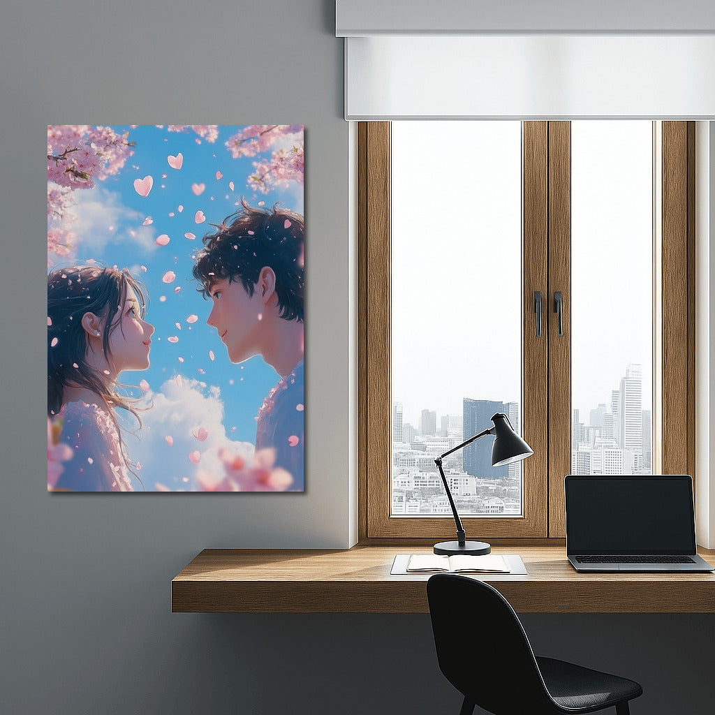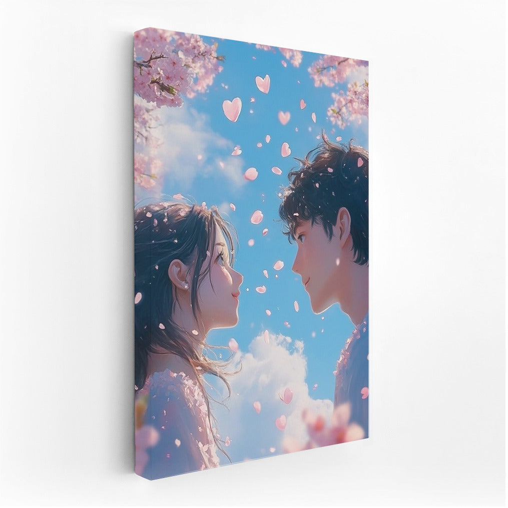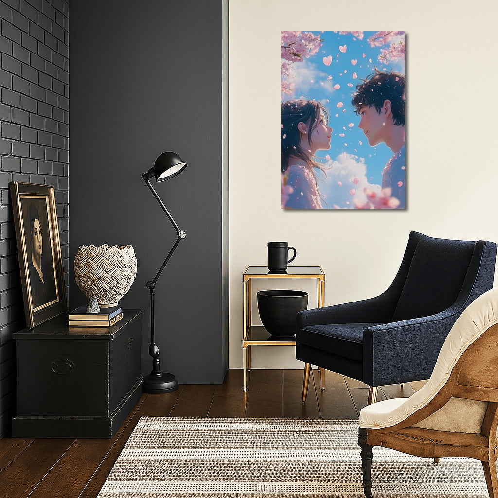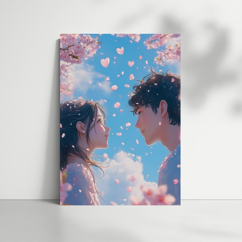Romantic poster with tenderness and flowers: two people under flowering branches against the background of a clear sky and petals of love. See more from the collection: Anime & Manga genres Art