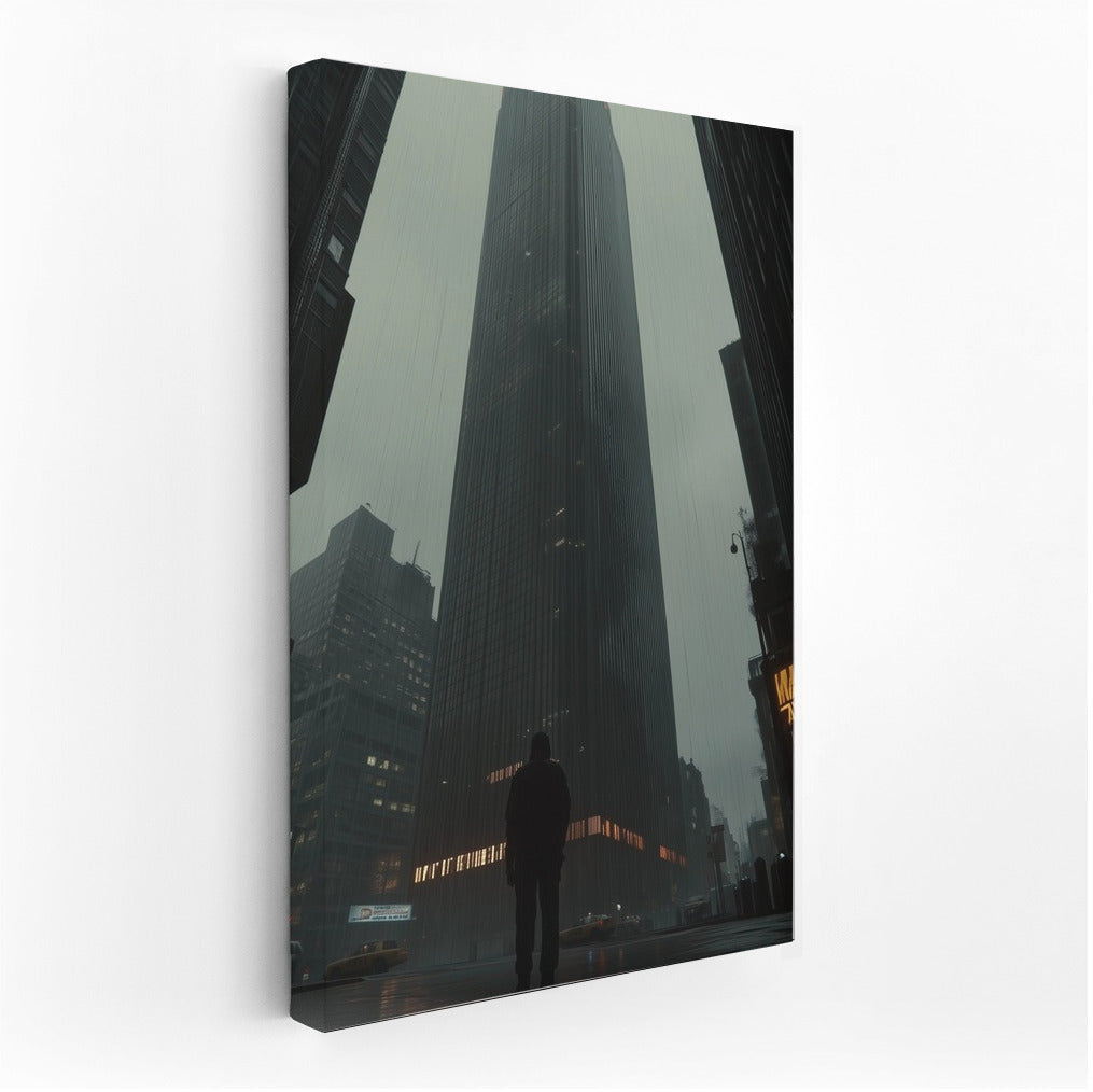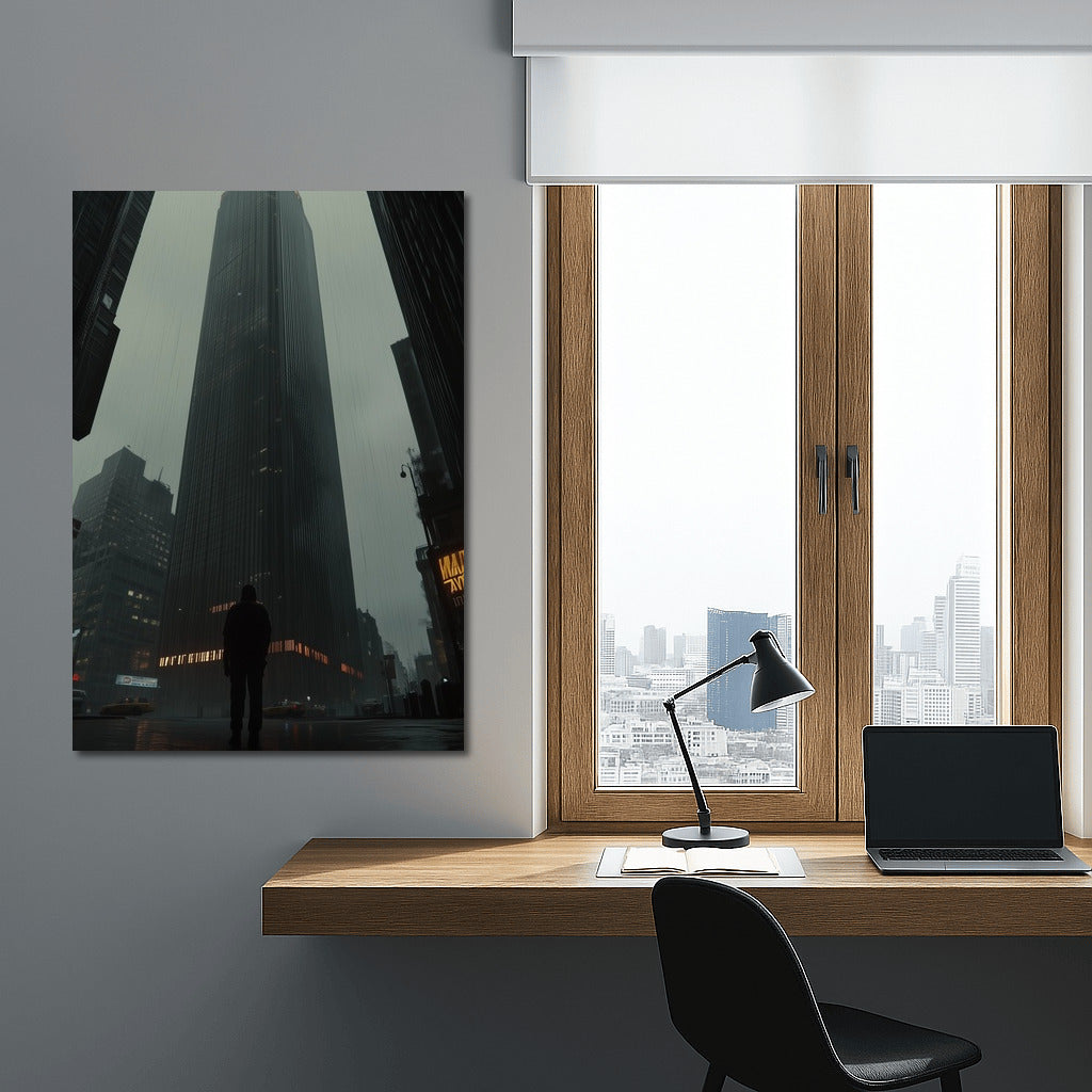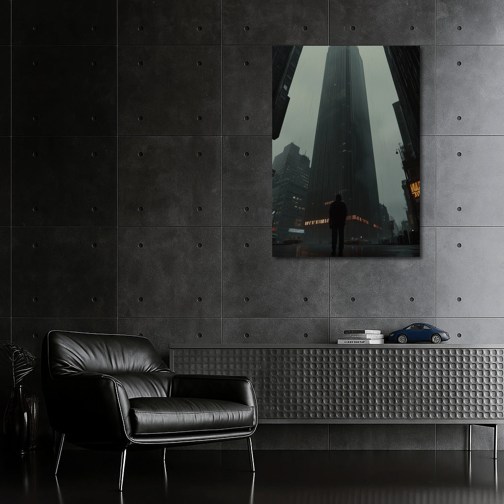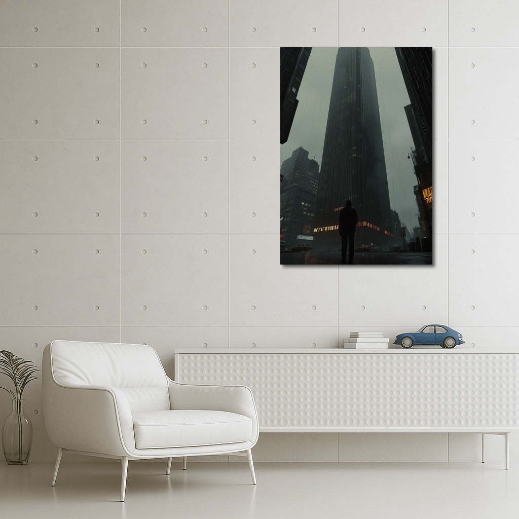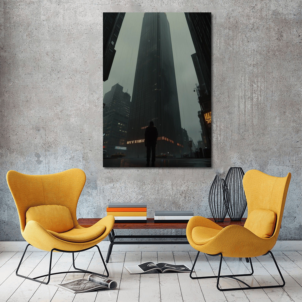 Bold poster: a mysterious figure under a majestic skyscraper. Contemporary wall art that hides the secrets of the metropolis. See more from the collection: Cityscapes & Skylines Art