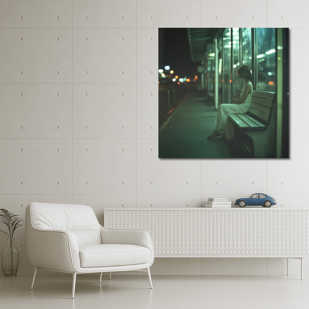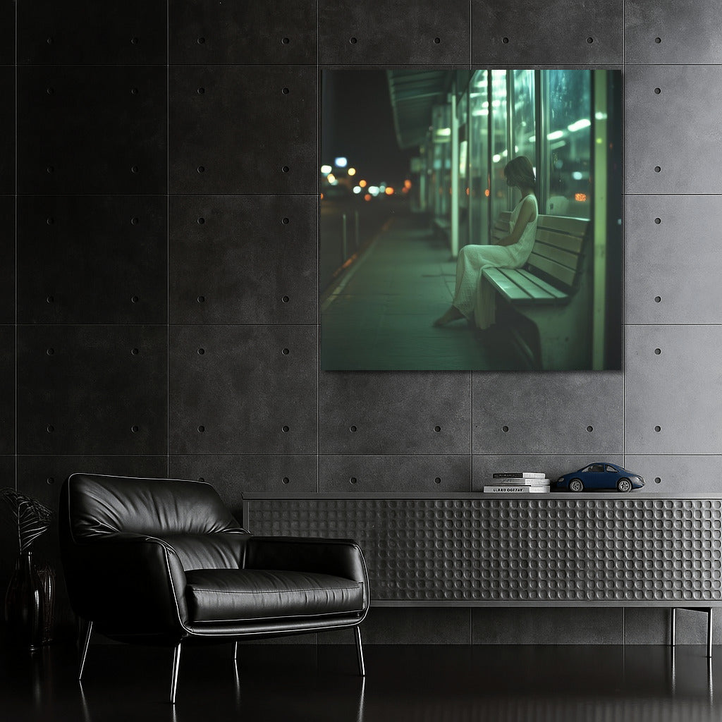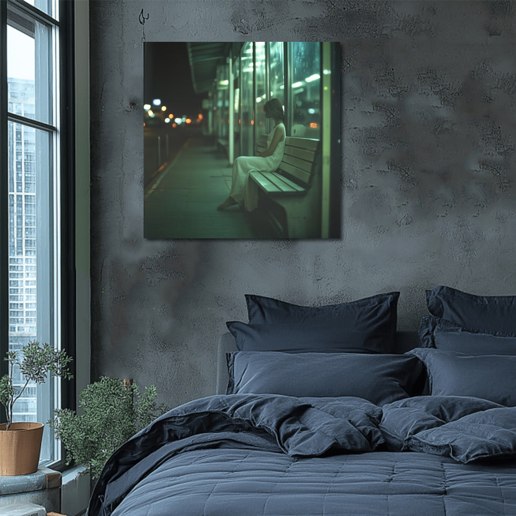 Night loneliness: a mysterious silhouette on a city bench. A poster for lovers of urban melancholy and wall art. See more from the collection: Mixed Wall Art