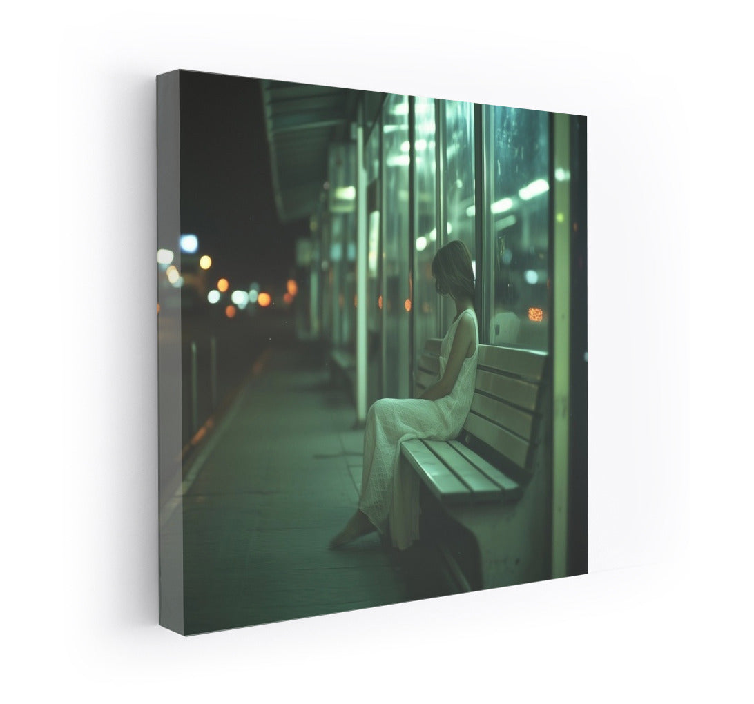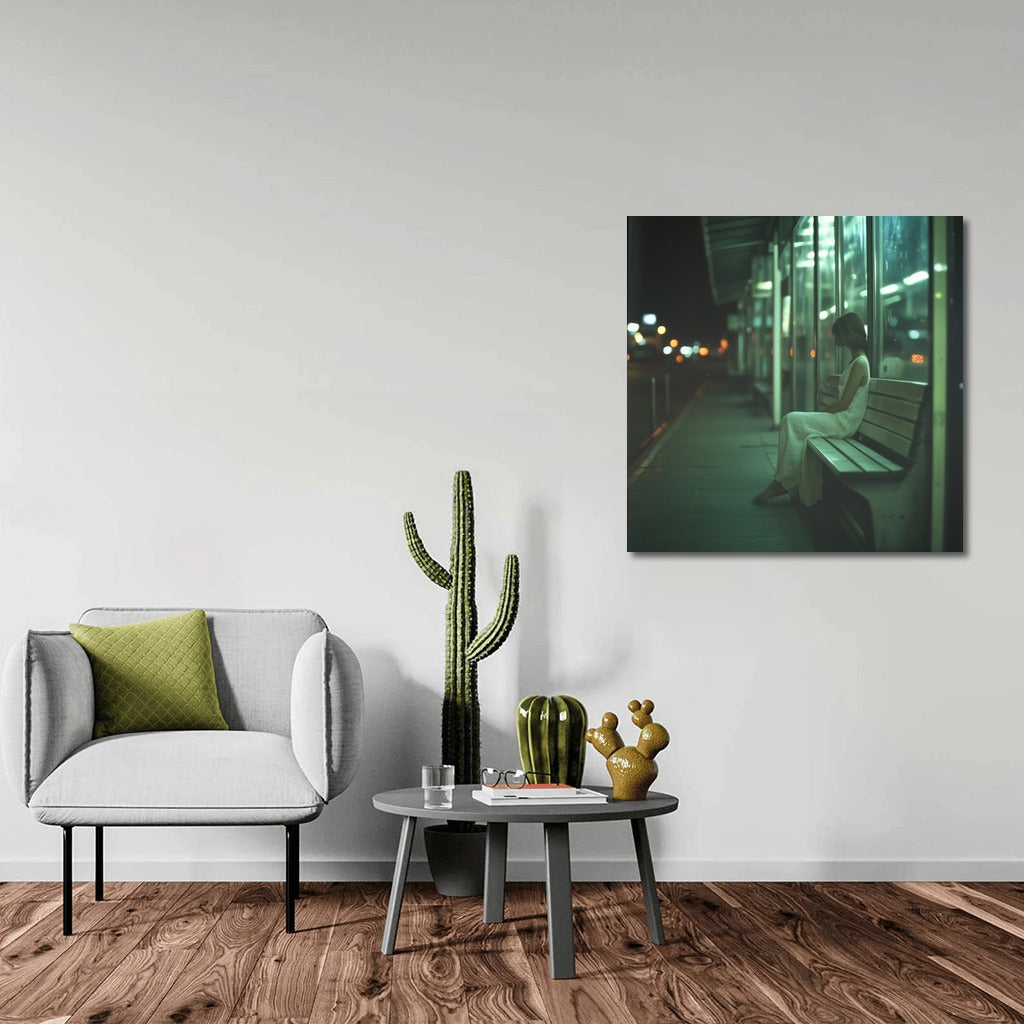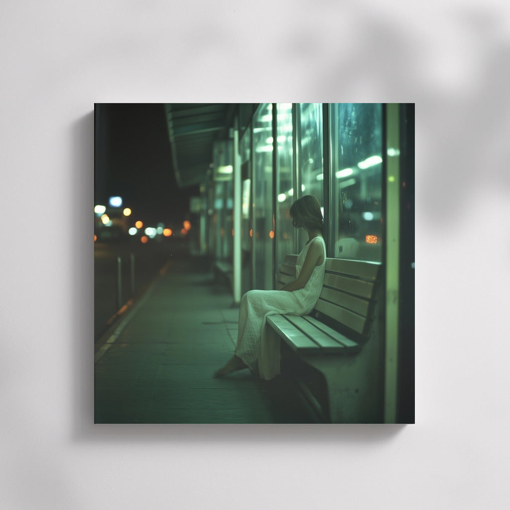 Night loneliness: a mysterious silhouette on a city bench. A poster for lovers of urban melancholy and wall art. See more from the collection: Mixed Wall Art