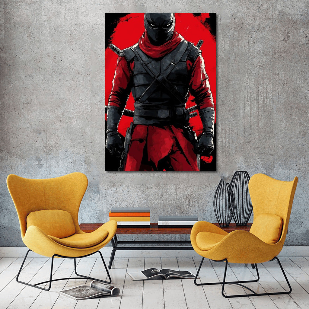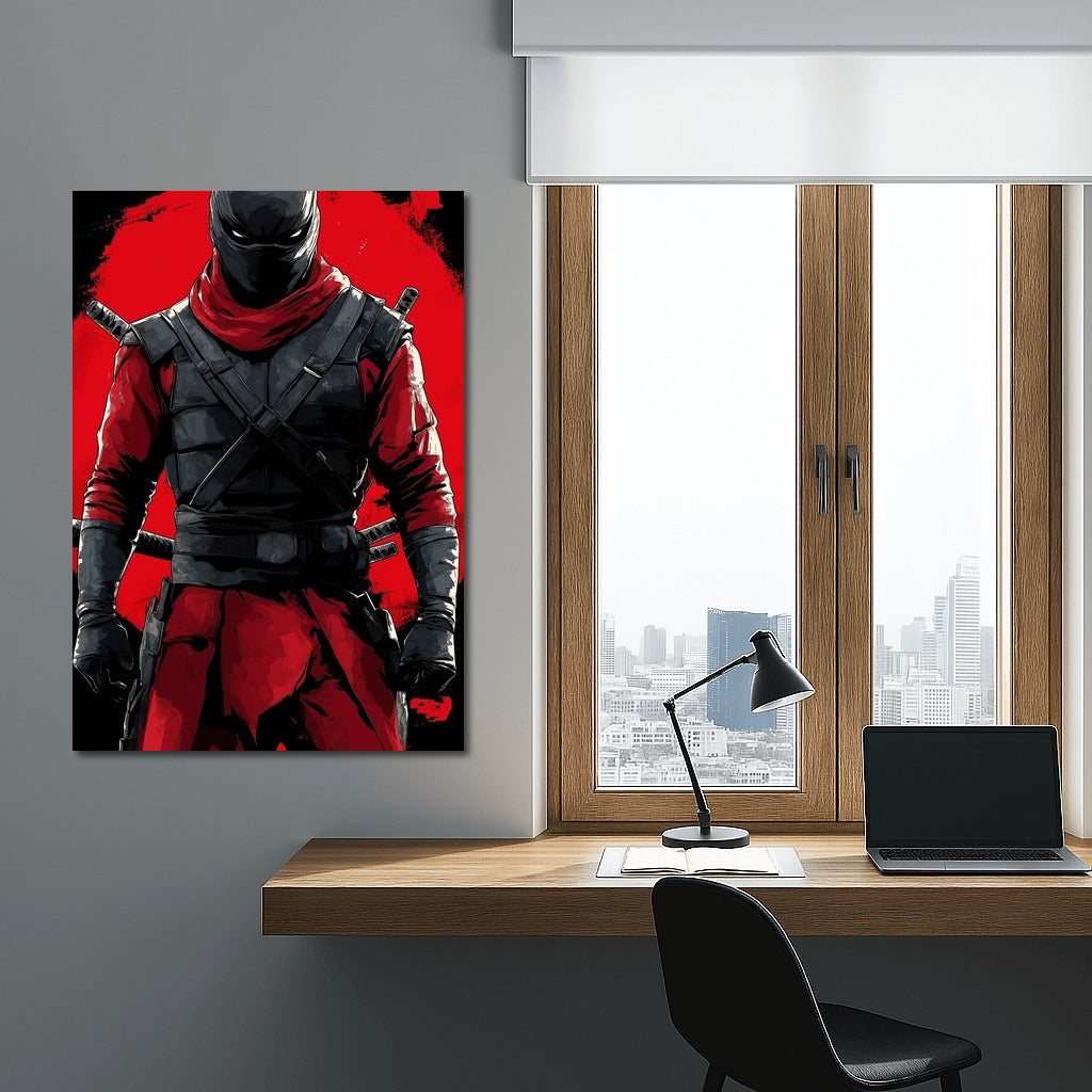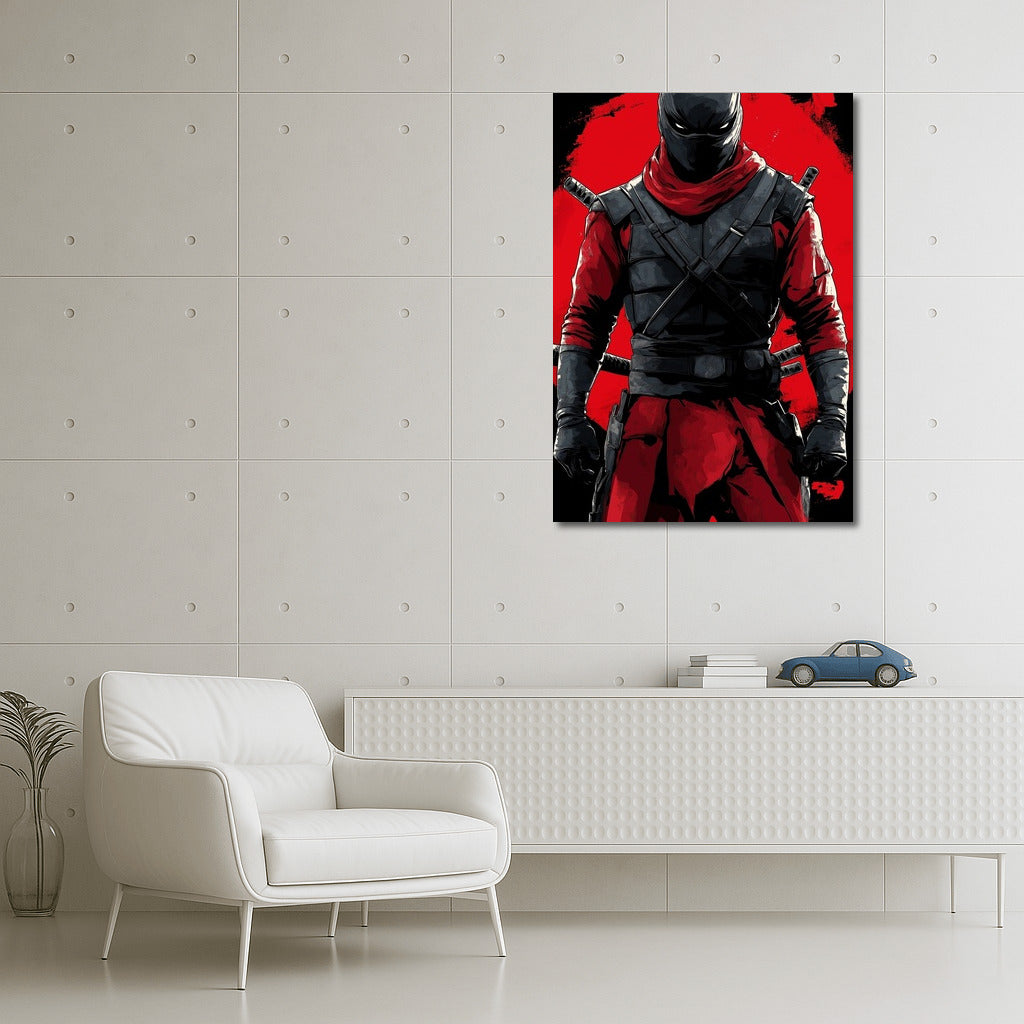 A warrior from the shadows on a red background. This poster will add a touch of drama and energy to your wall art. See more from the collection: Anime & Manga genres Art