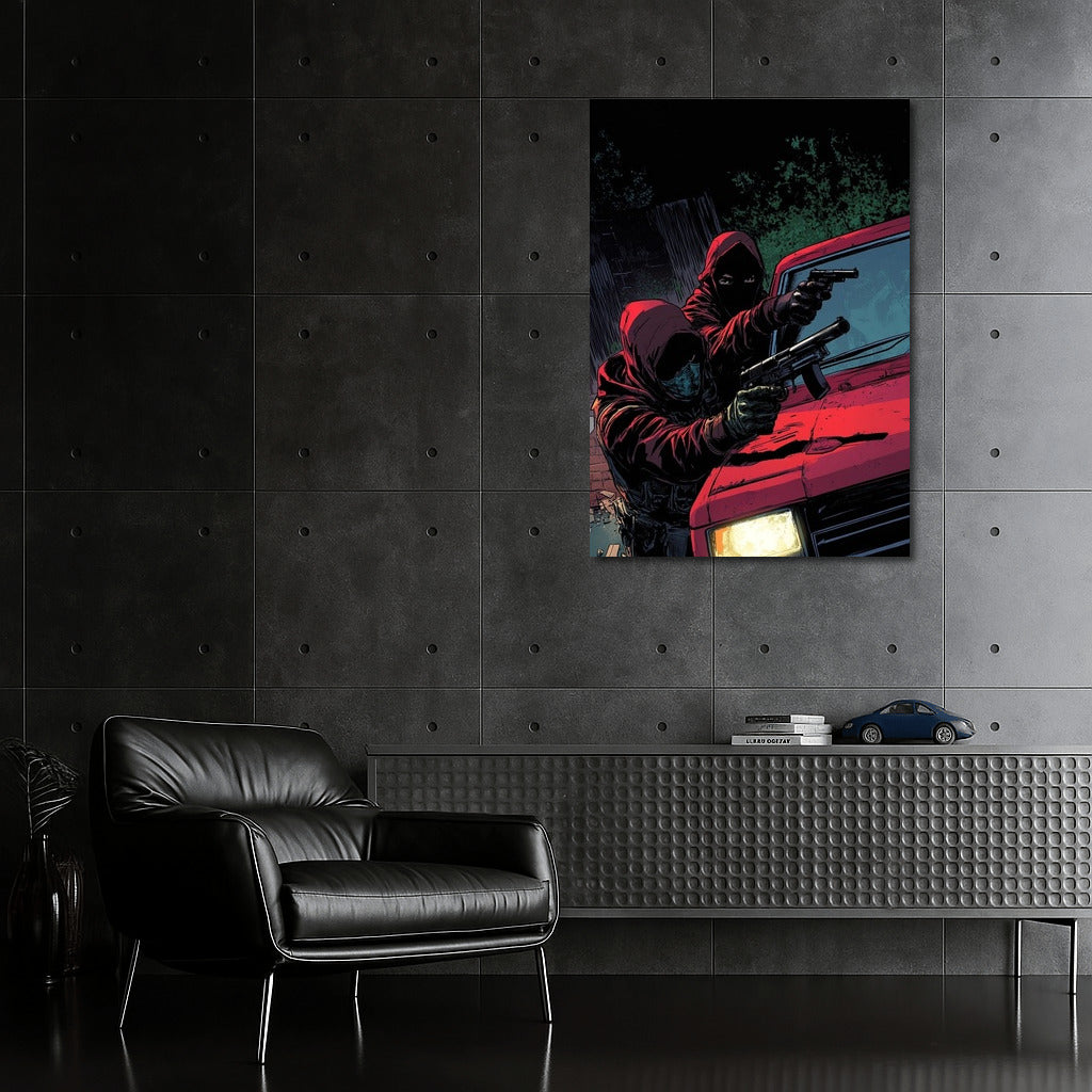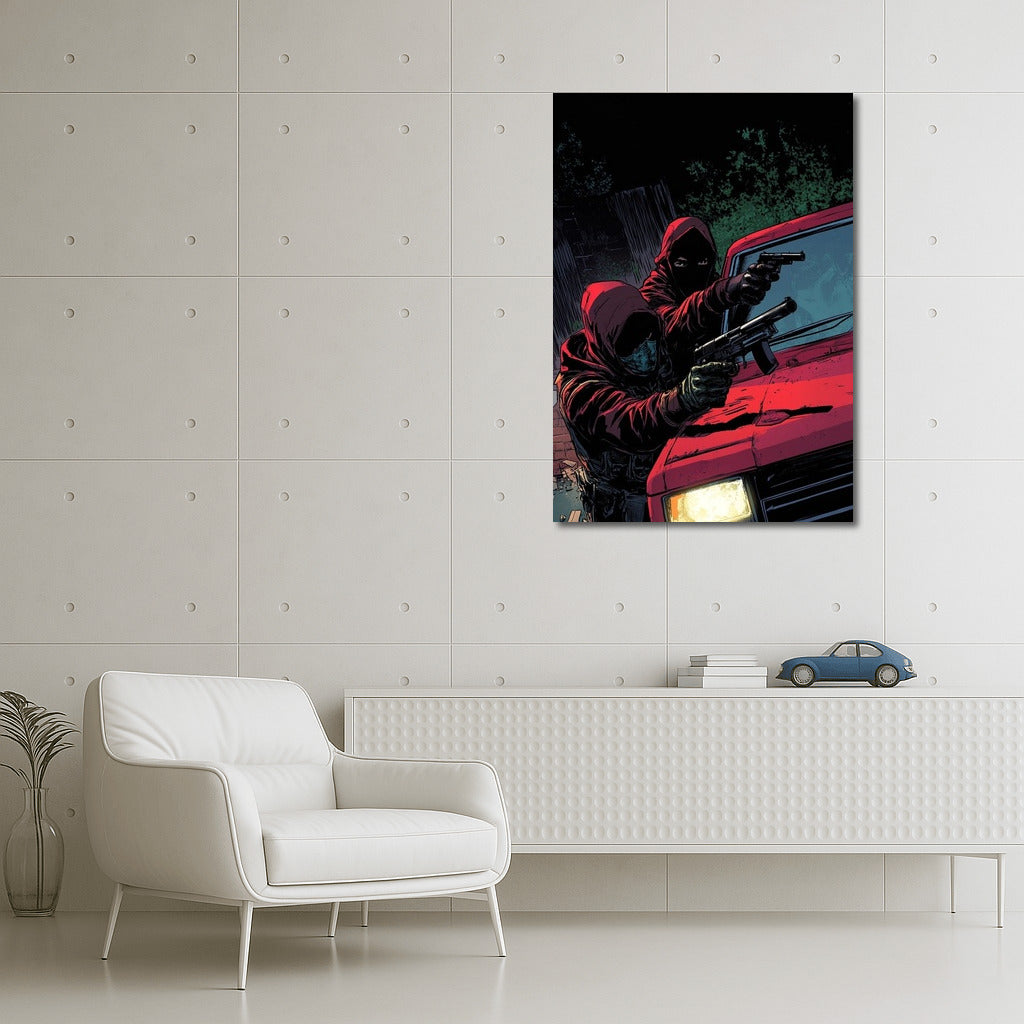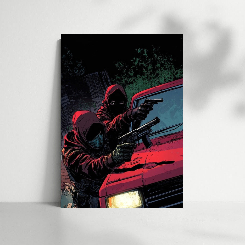 A dynamic poster featuring two hooded figures near a red car. Wall art for lovers of a mysterious atmosphere. See more from the collection: Mixed Wall Art