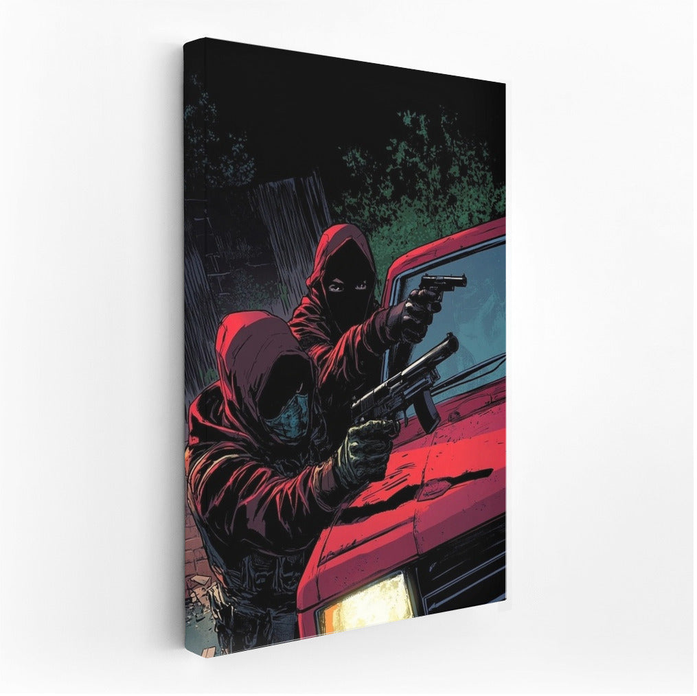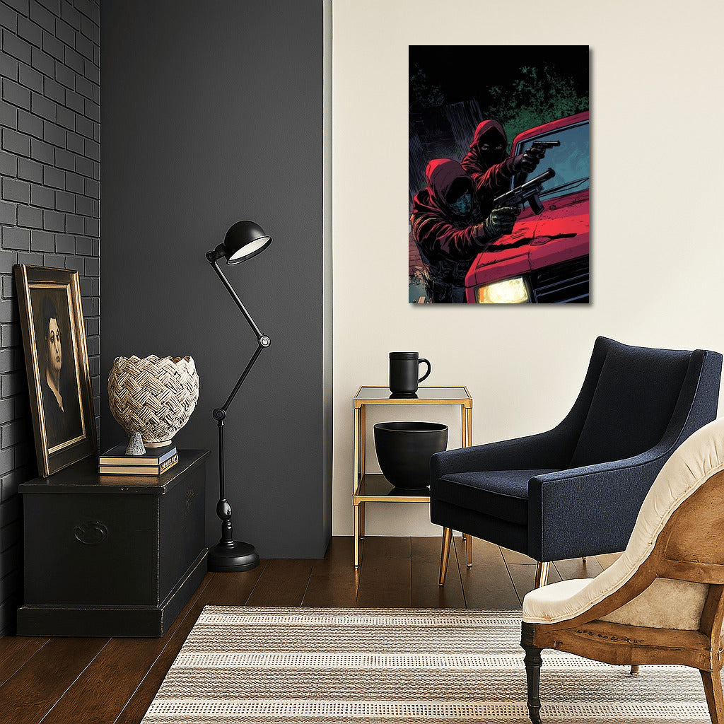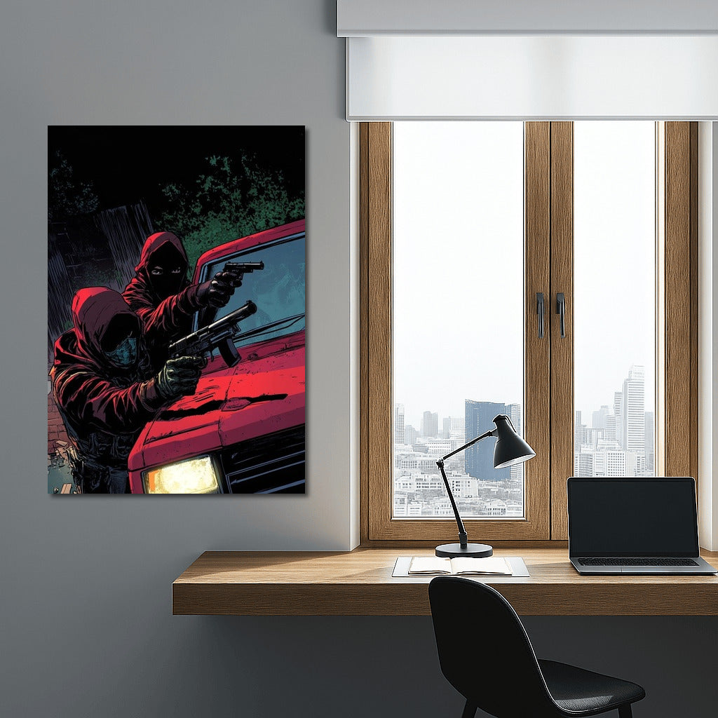 A dynamic poster featuring two hooded figures near a red car. Wall art for lovers of a mysterious atmosphere. See more from the collection: Mixed Wall Art
