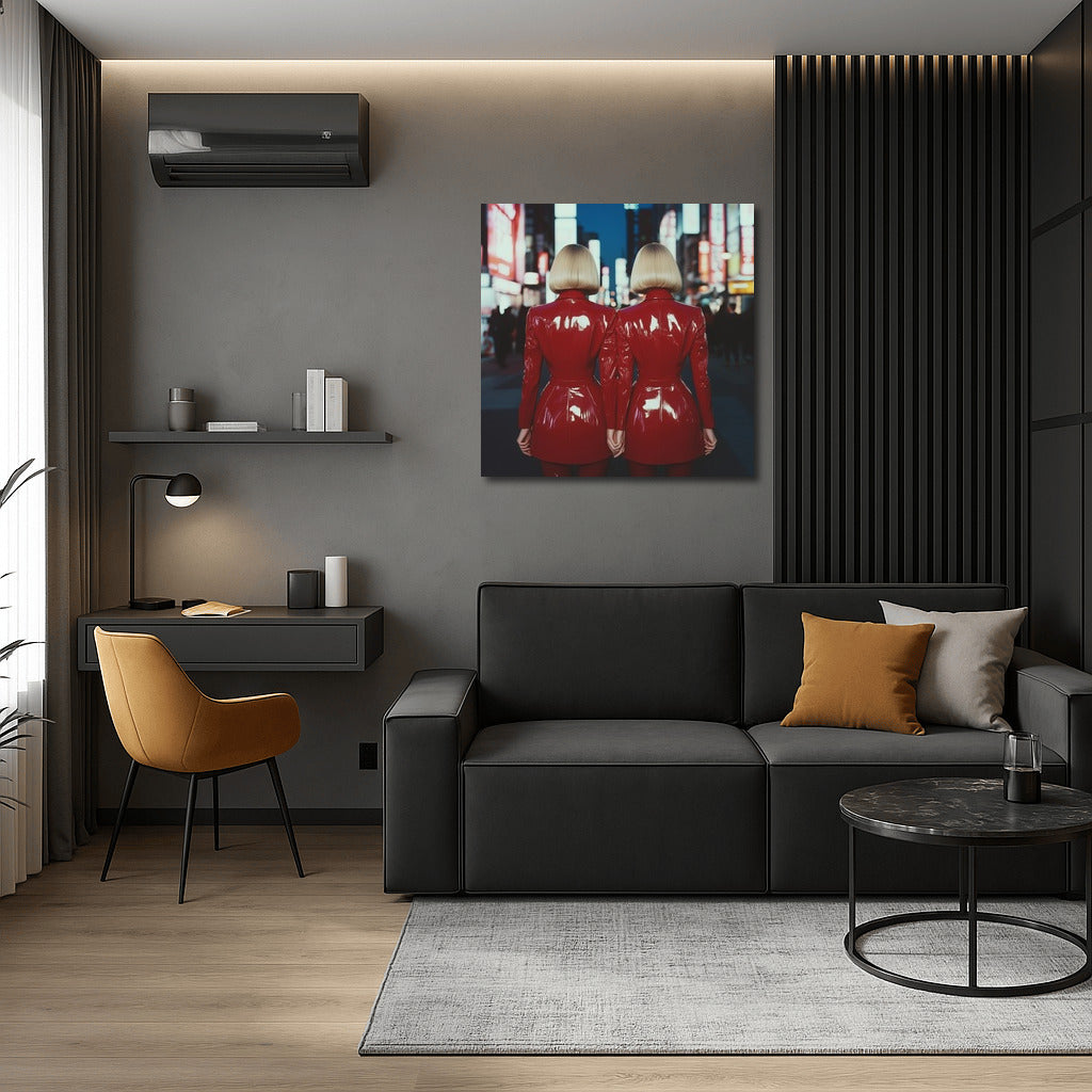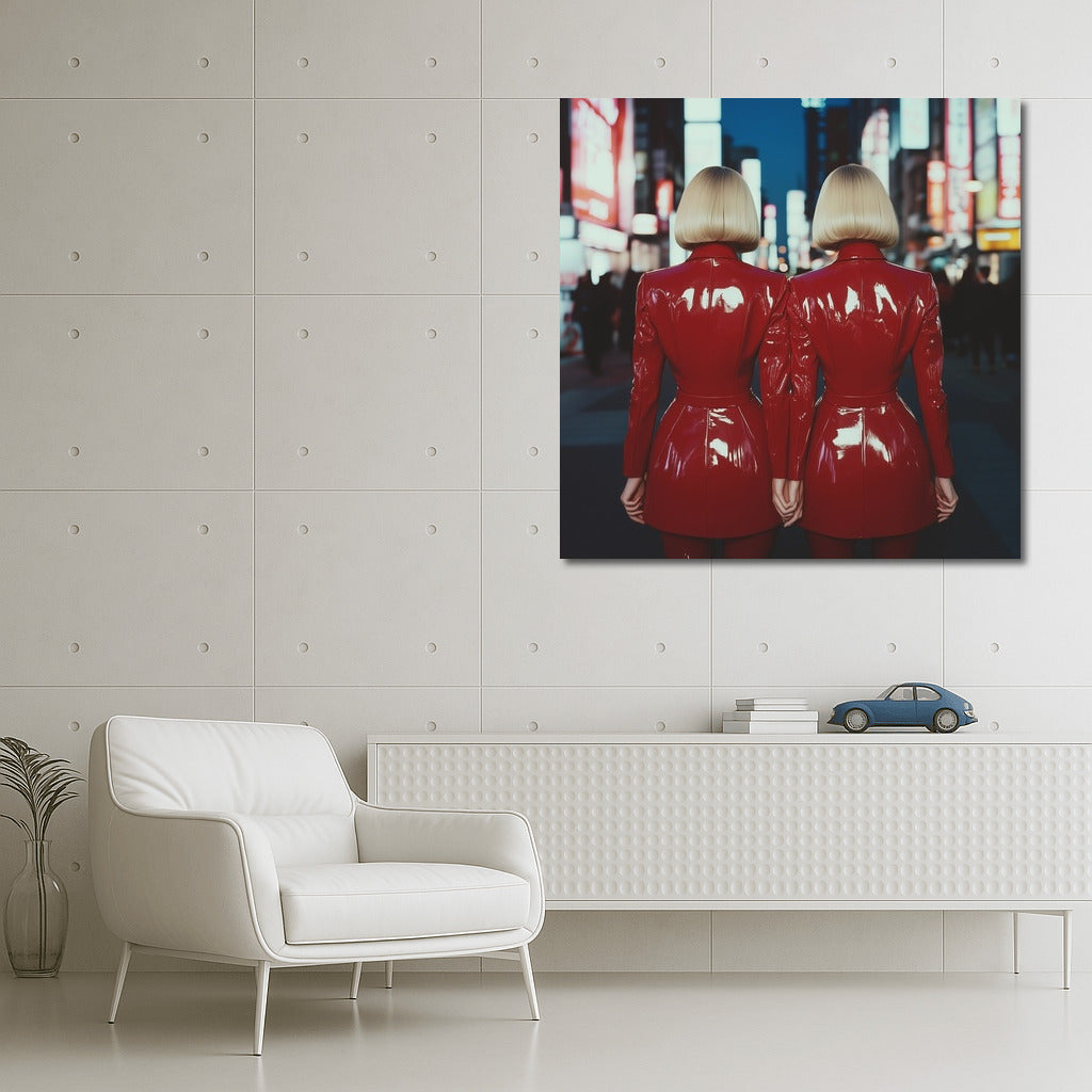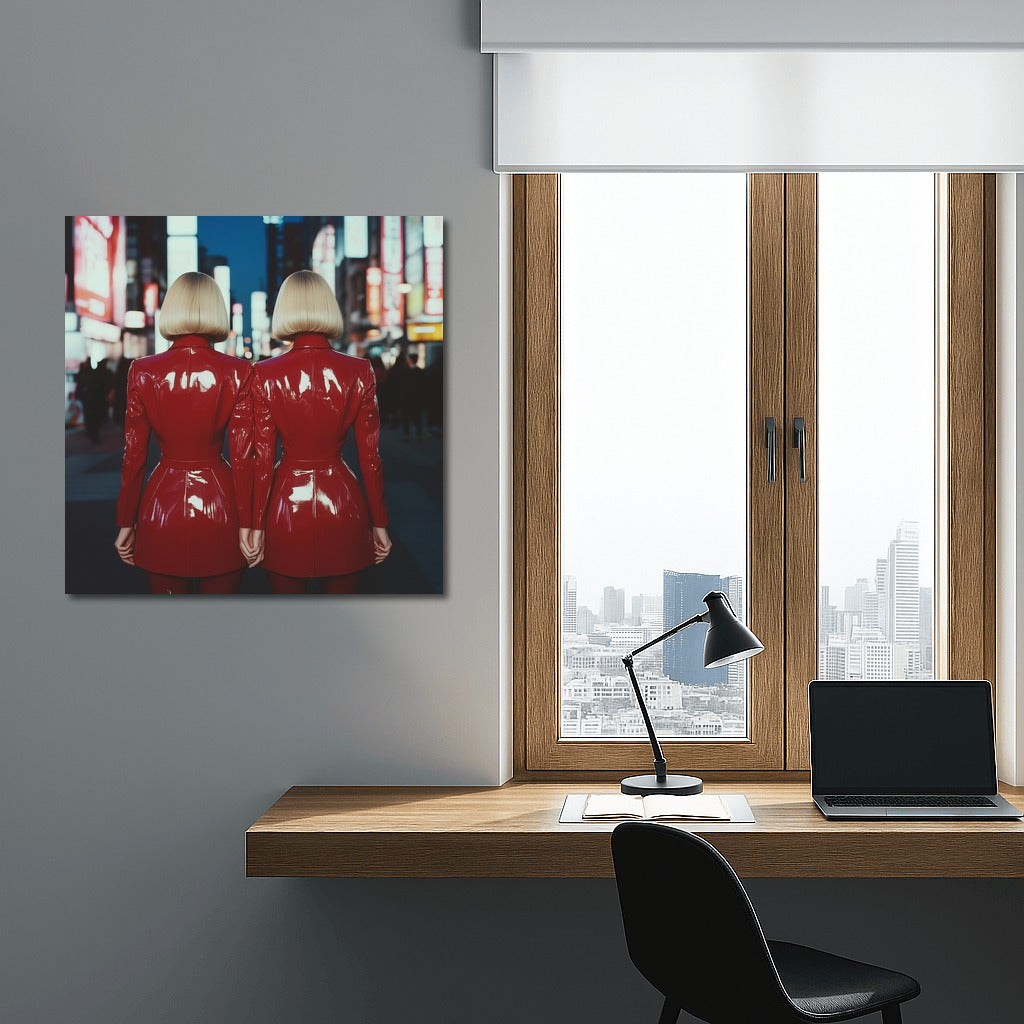 A bright poster with a mysterious atmosphere: two figures in red cloaks among city lights. Contemporary wall art. See more from the collection: Fashion Art