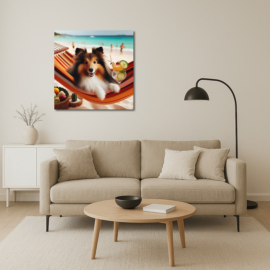 Sheltie on the Beach: Relaxing in a Hammock with a Cocktail Wall Art