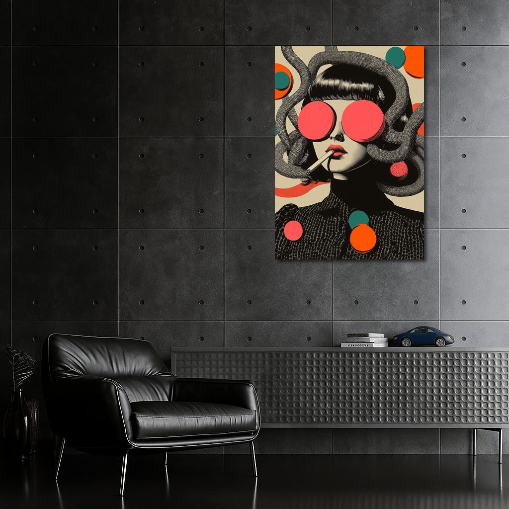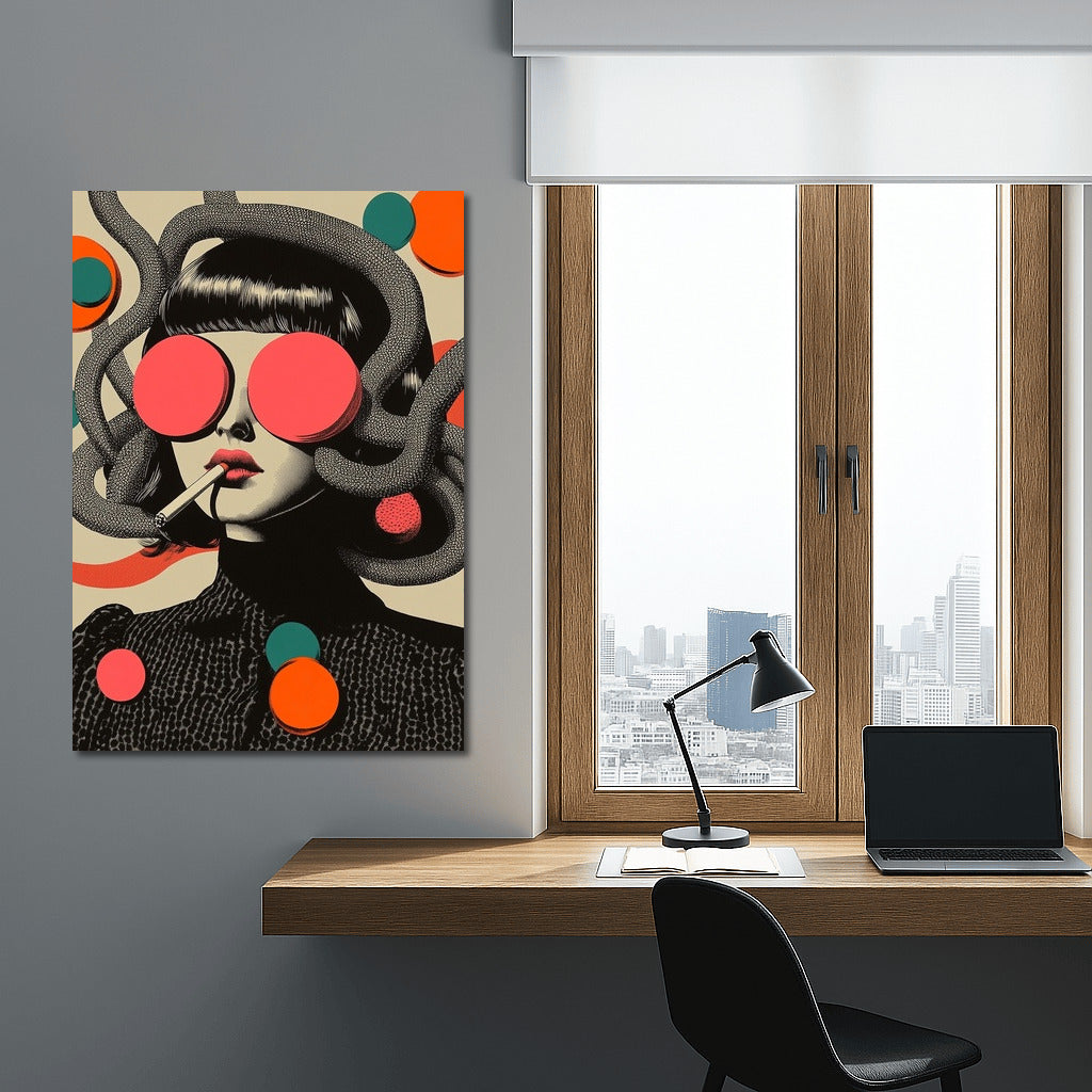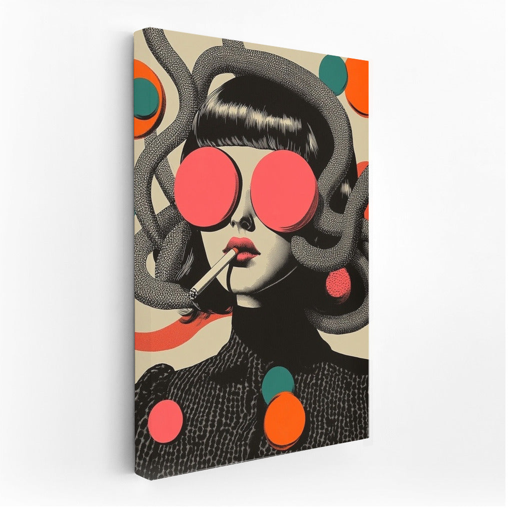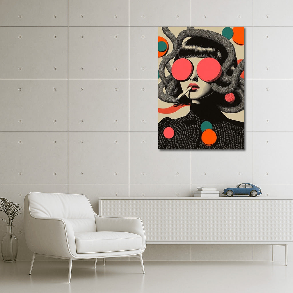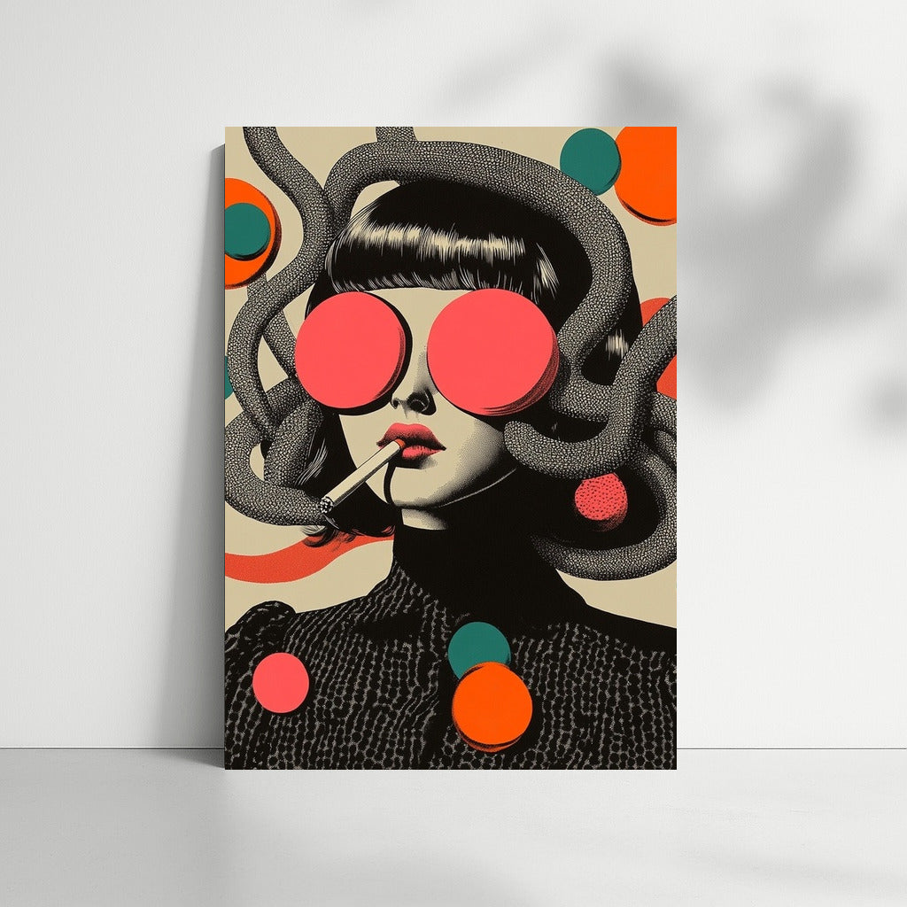 Unique painting: girl in abstract glasses and bright colors. Transform the space with this creative wall art! See more from the collection: Pop Art