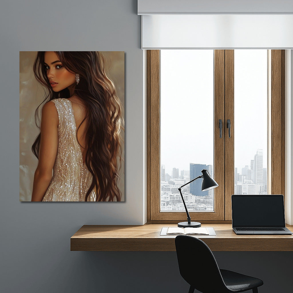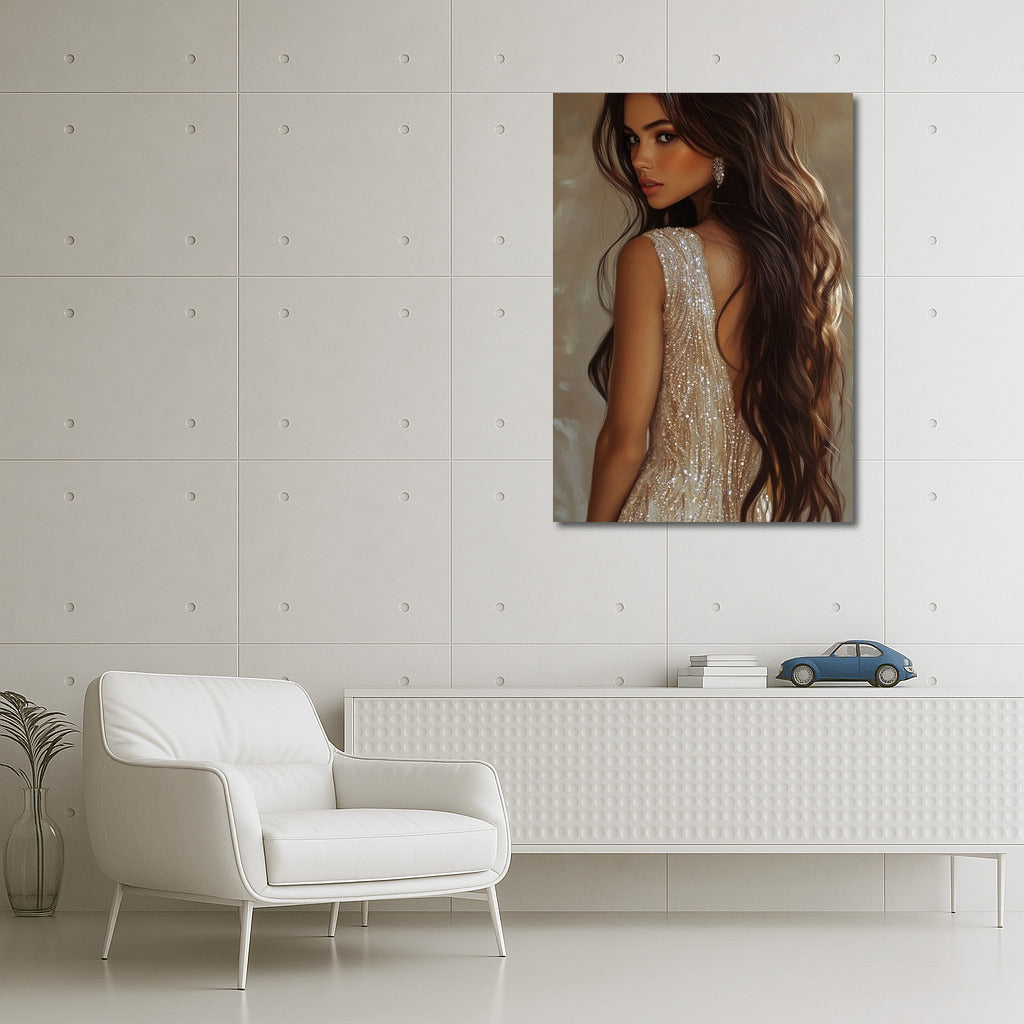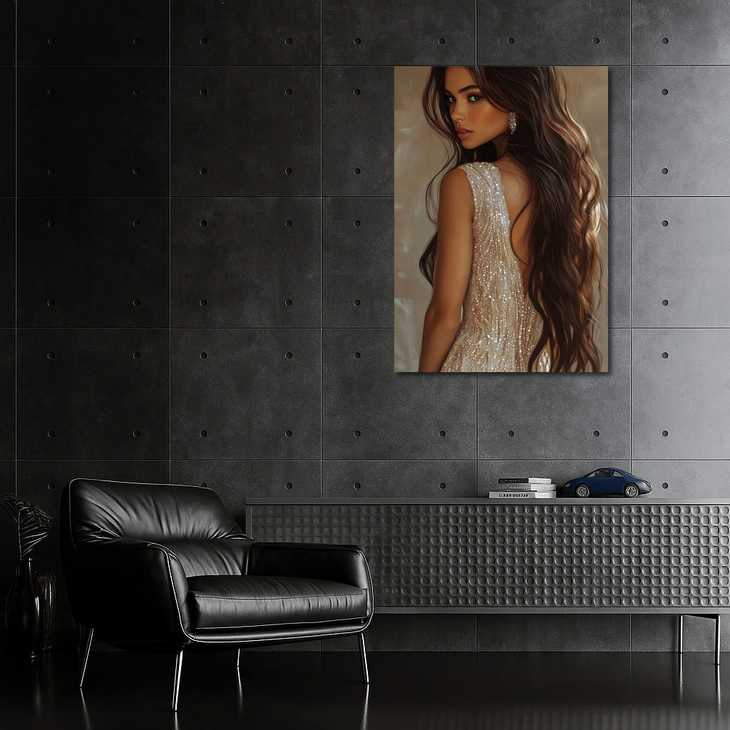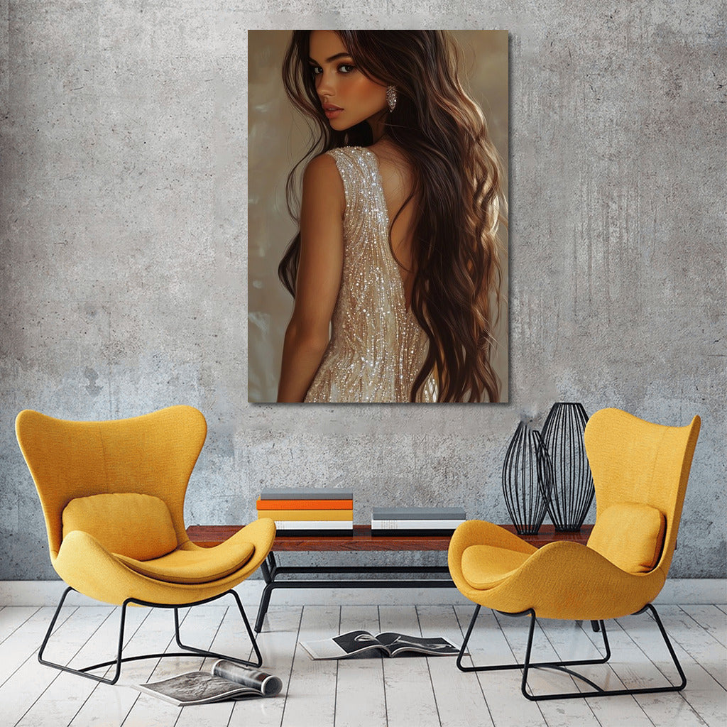 Elegant painting with a mysterious girl in a shiny dress - a stylish poster for your space. Wall art of beauty! See more from the collection: Wall Art with Women