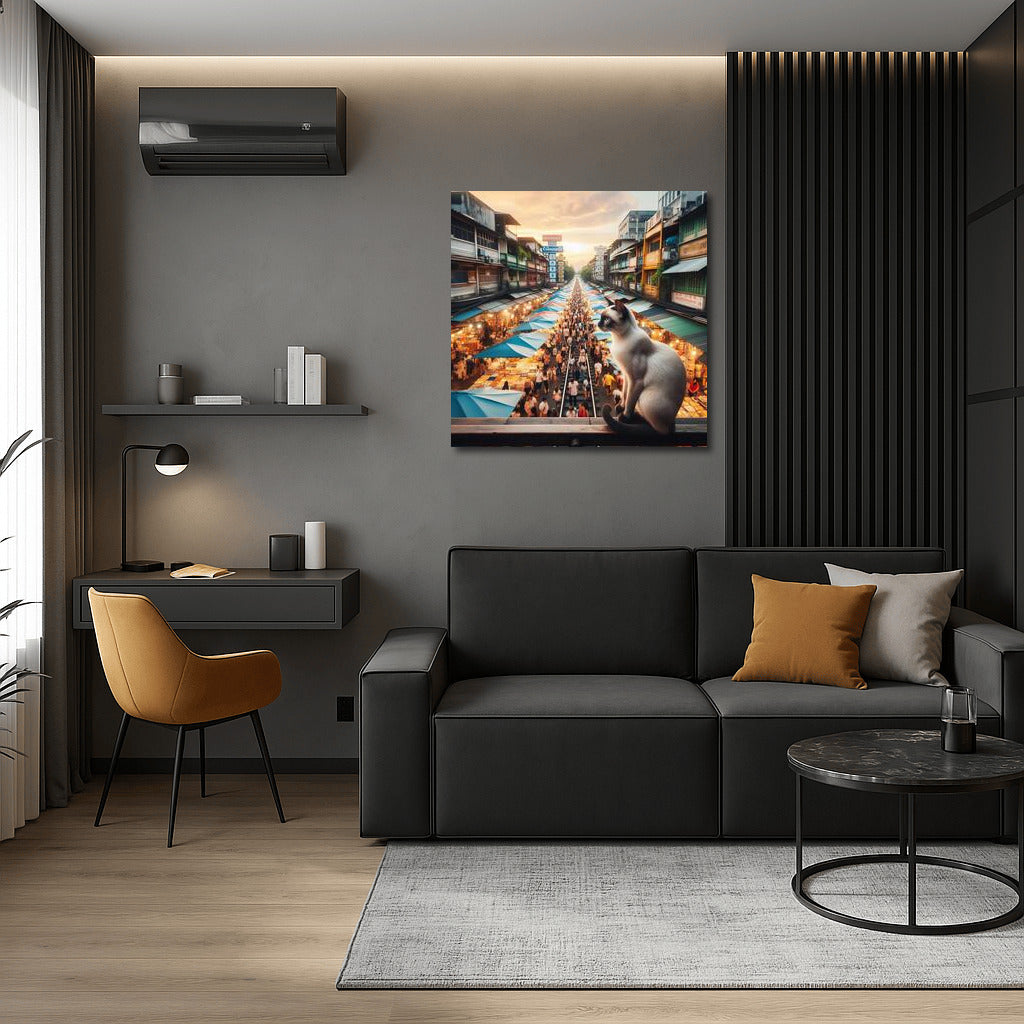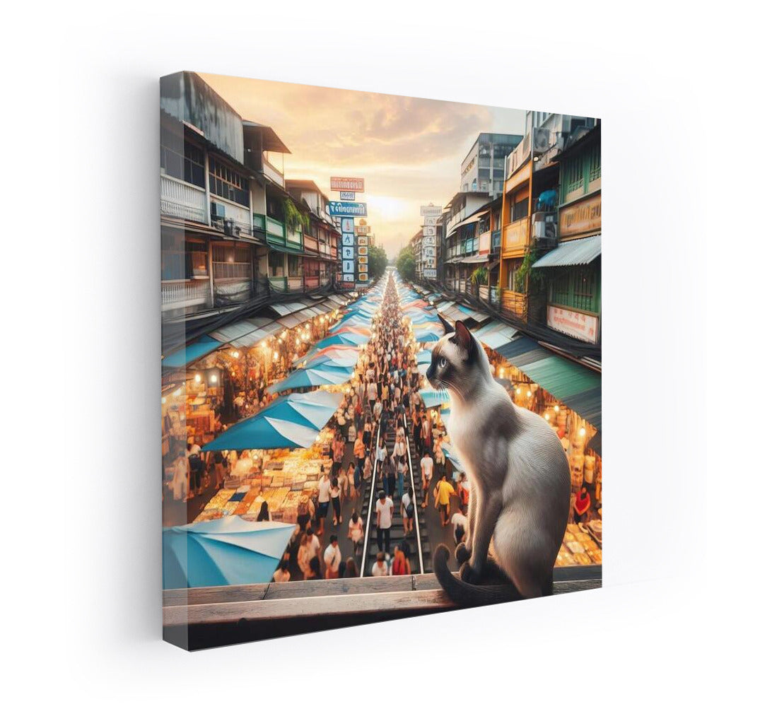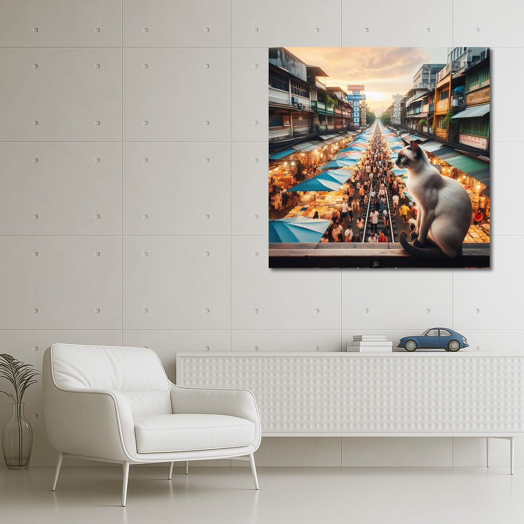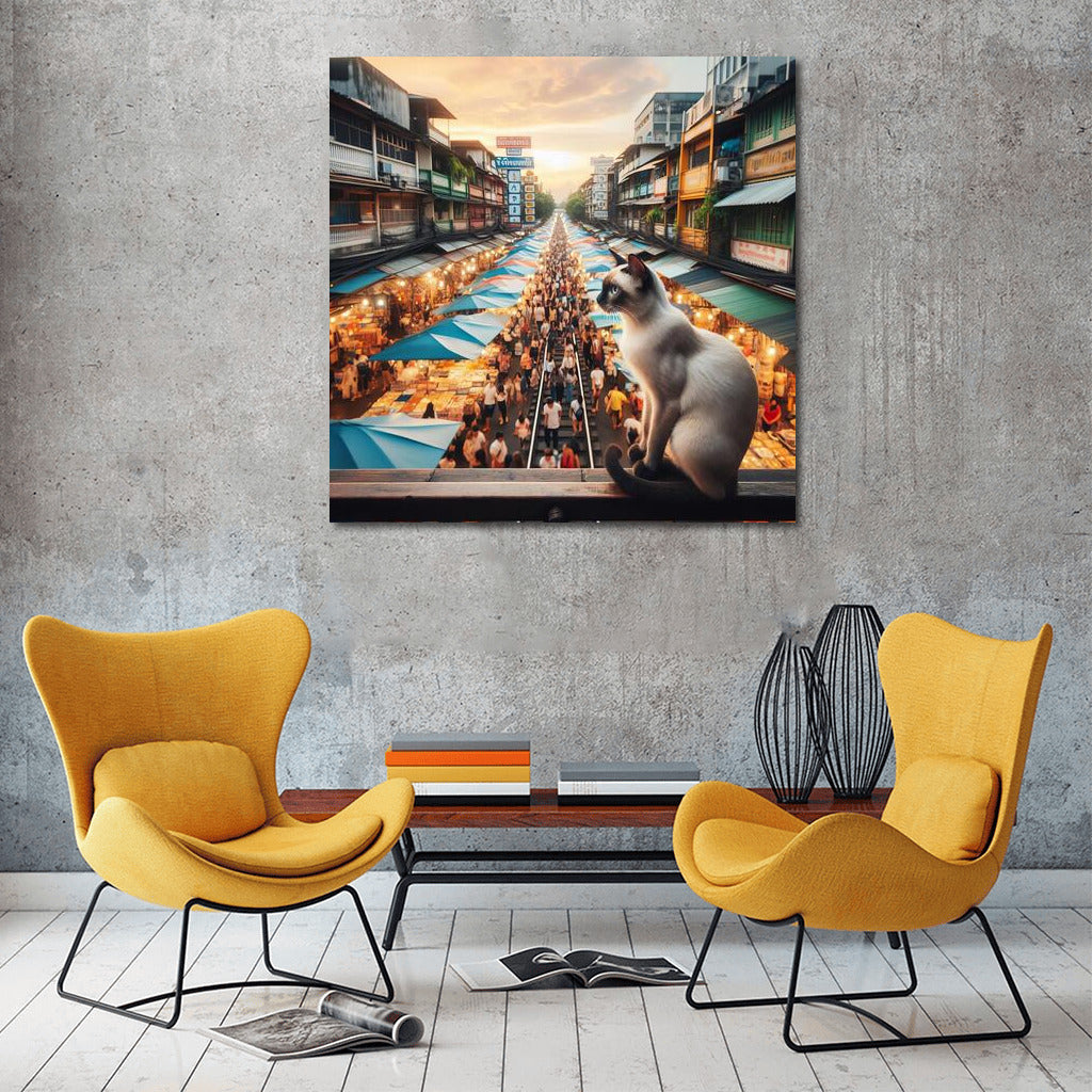 Siamese Cat at Bangkok's Vibrant Market: Vibrant Colours and Movement Wall Art
