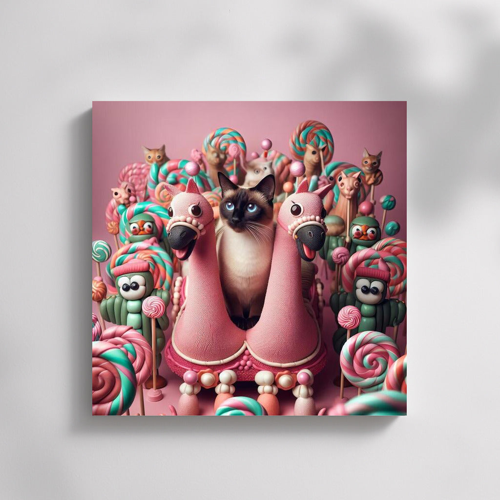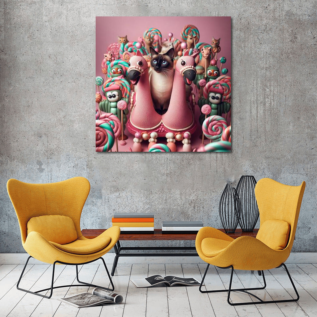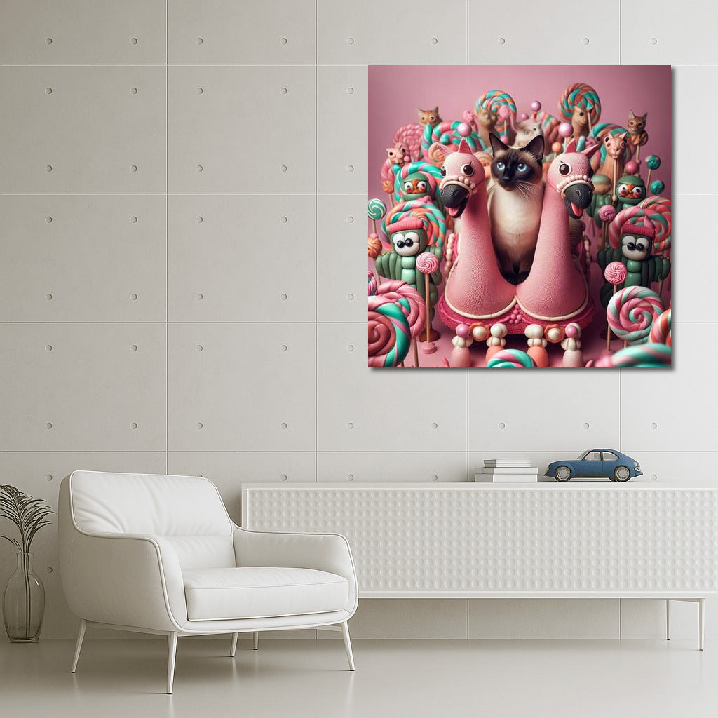 Poster: Siamese Cat on Candy Parade Surrounded by Chocolate and Sweets. Magical Wall Art for Those with a Sweet Tooth! See more from the collection: Animals Art