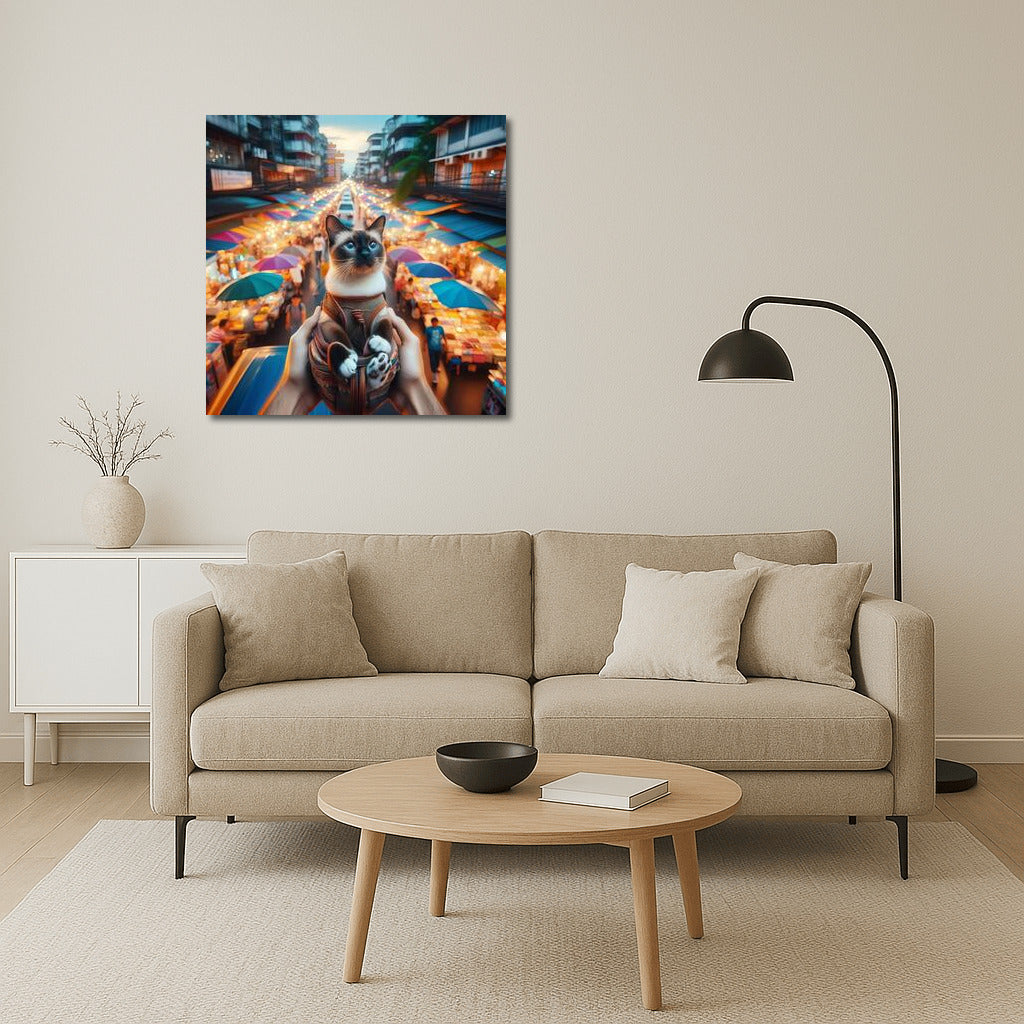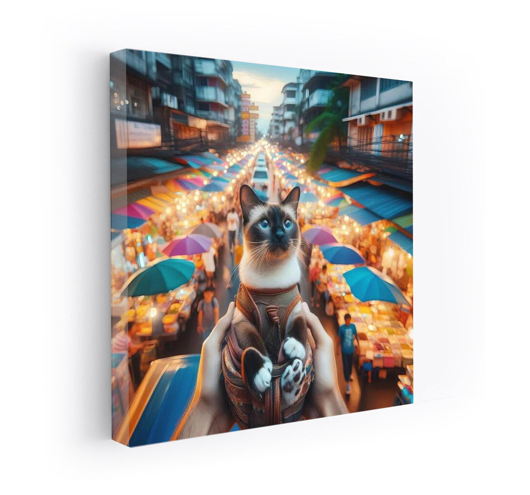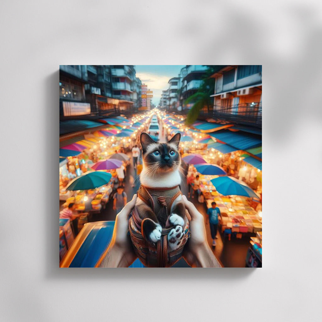 A Siamese cat in a backpack explores a colorful market in Bangkok. Add a unique touch to your home with this colorful wall art! See more from the collection: Animals Art