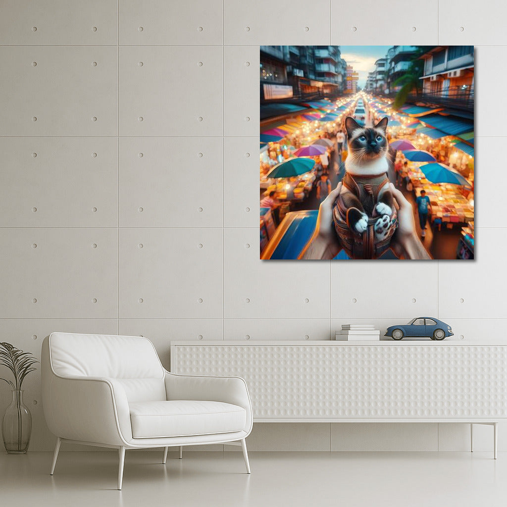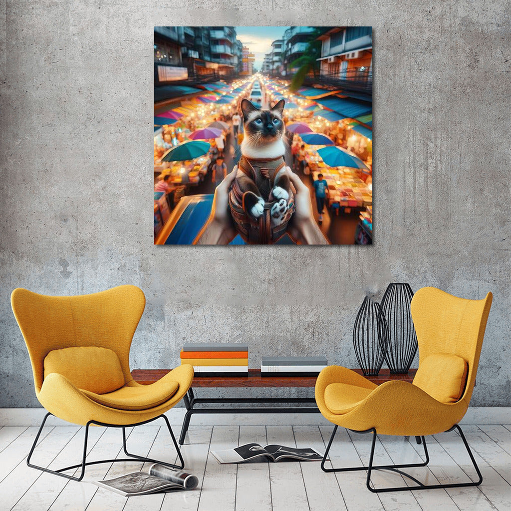 Siamese Cat in a Backpack at Bangkok's Colorful Market Wall Art