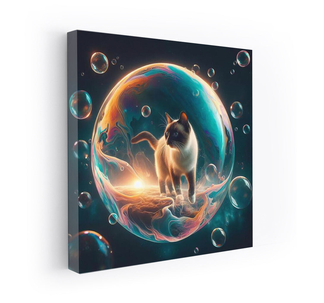 Siamese cat explores the world inside a giant soap bubble in space. Wall art for dreamers! See more from the collection: Animals Art