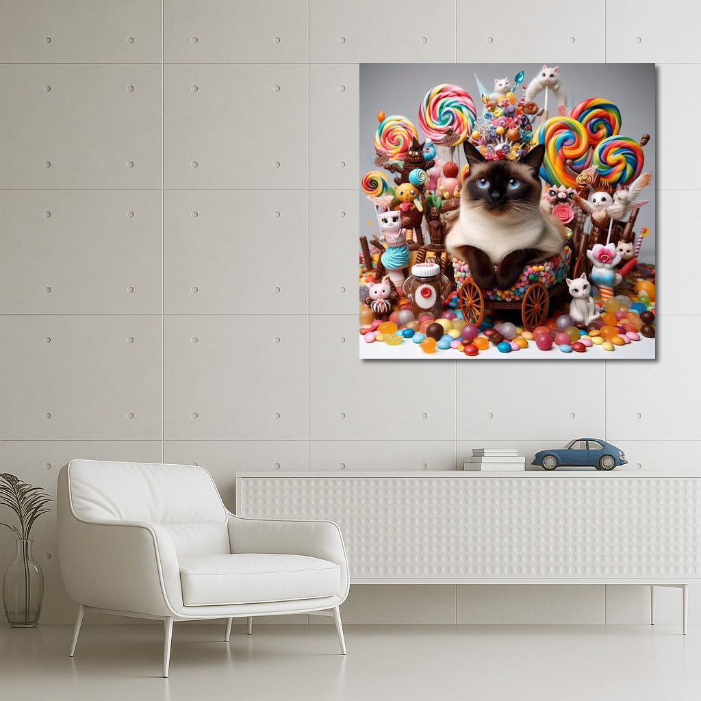 Siamese Cat in Chocolate Parade: An inspiring painting where sweets come to life and create a magical world of wall art. See more from the collection: Animals Art