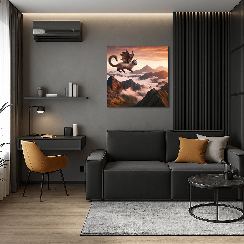 Poster Magic: Siamese Cat Transforms Into Dragon Soaring Above Mountain Tops. Wall Art For Dreamers! See more from the collection: Animals Art