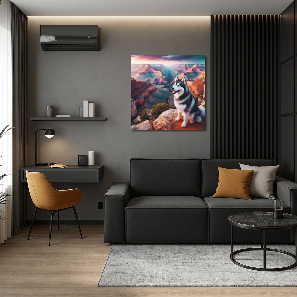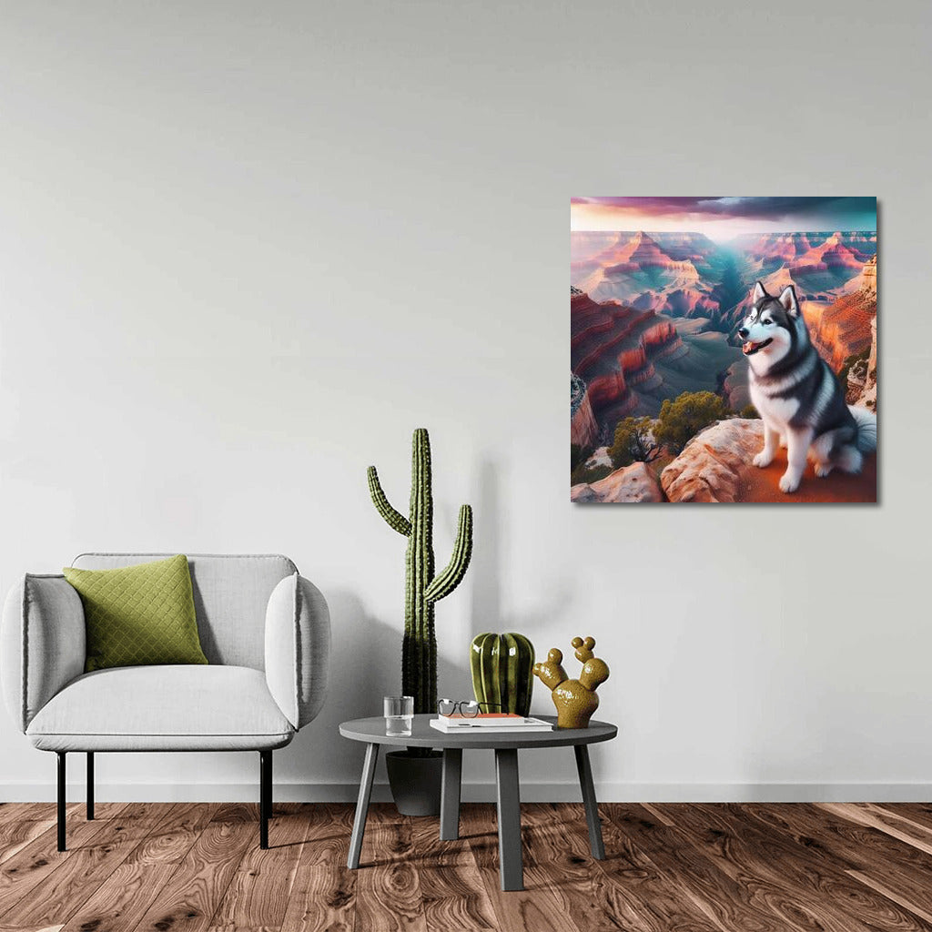 Poster of Siberian Husky enjoying the majestic scenery of Grand Canyon. Wall art for adventure lovers. See more from the collection: Animals Art
