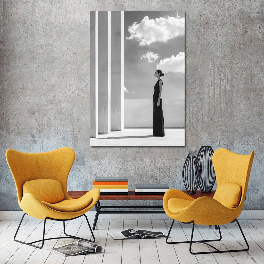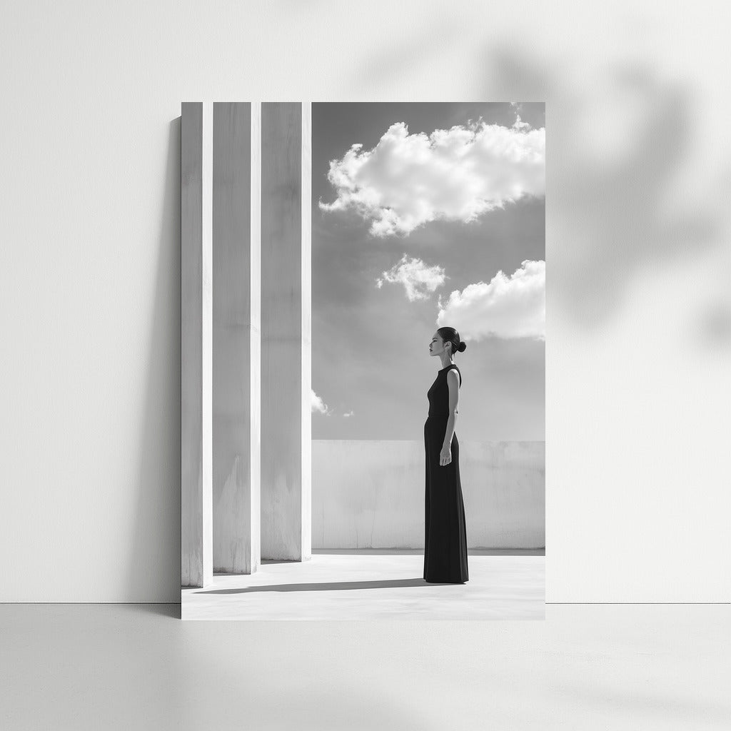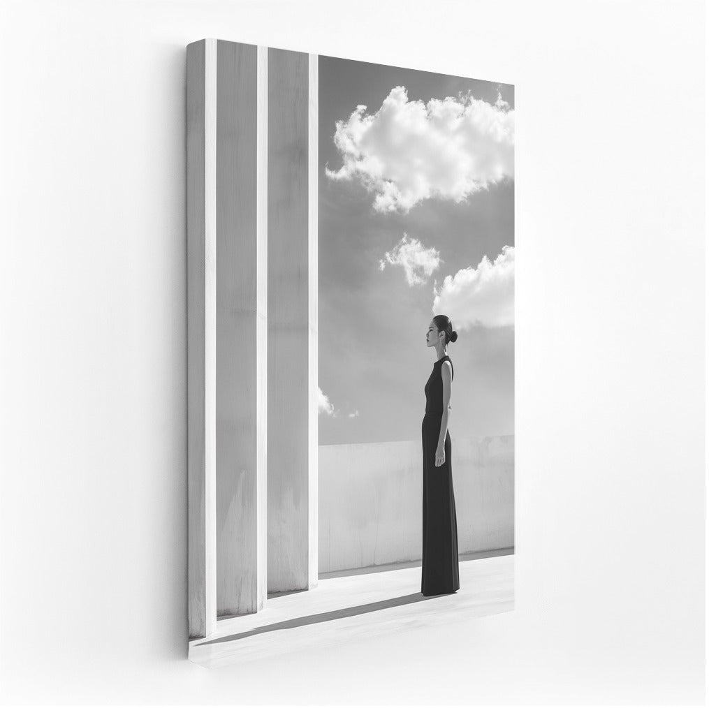 Elegant painting: girl in black, sky and architectural lines. Perfect wall art for minimalism and harmony. See more from the collection: Black and White Art