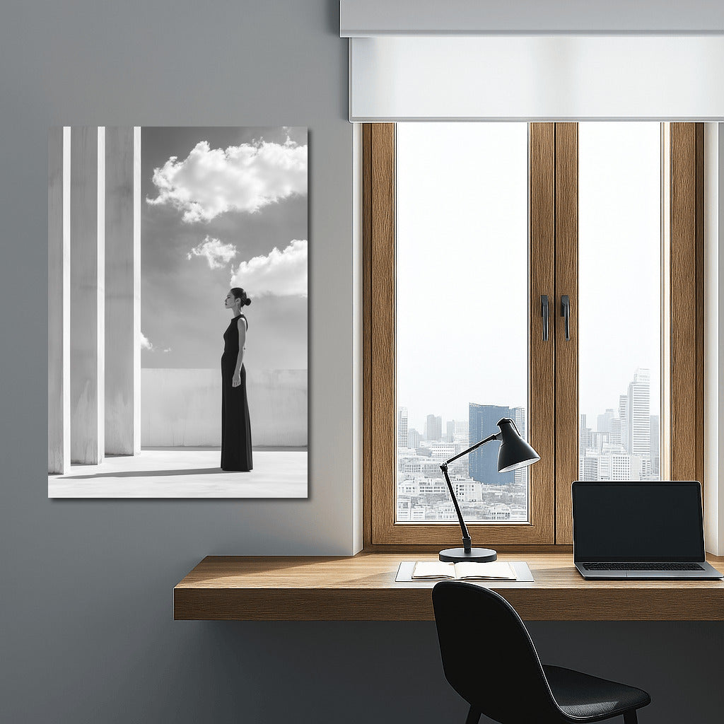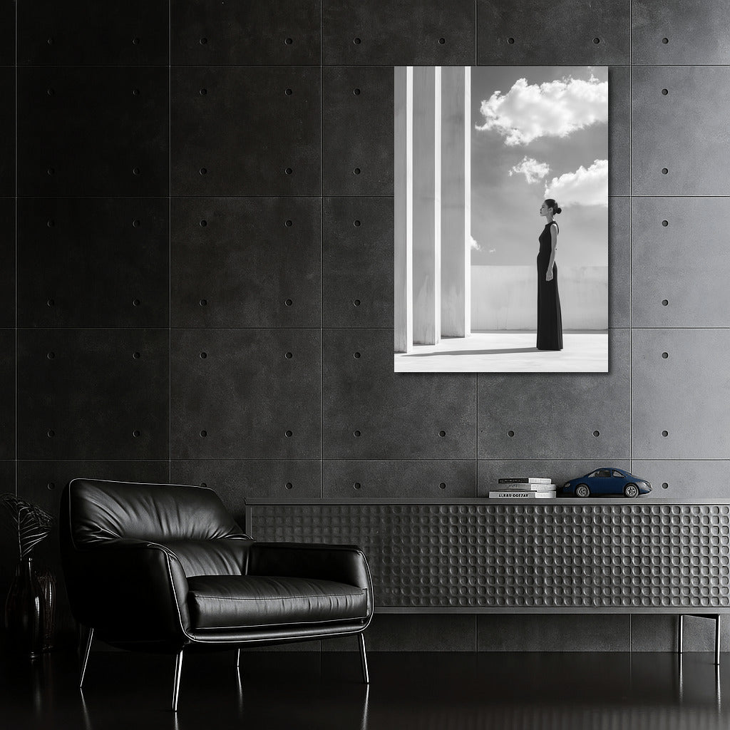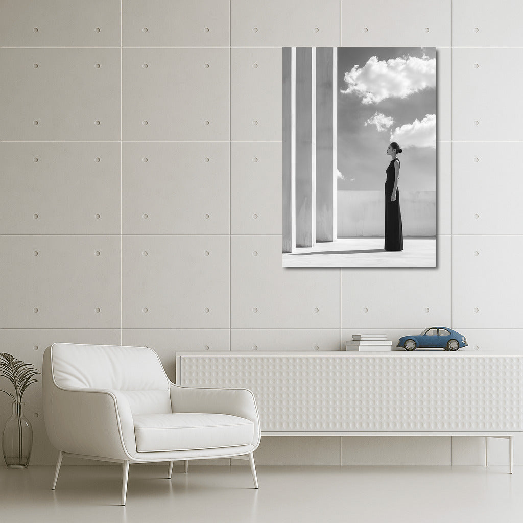 Elegant painting: girl in black, sky and architectural lines. Perfect wall art for minimalism and harmony. See more from the collection: Black and White Art