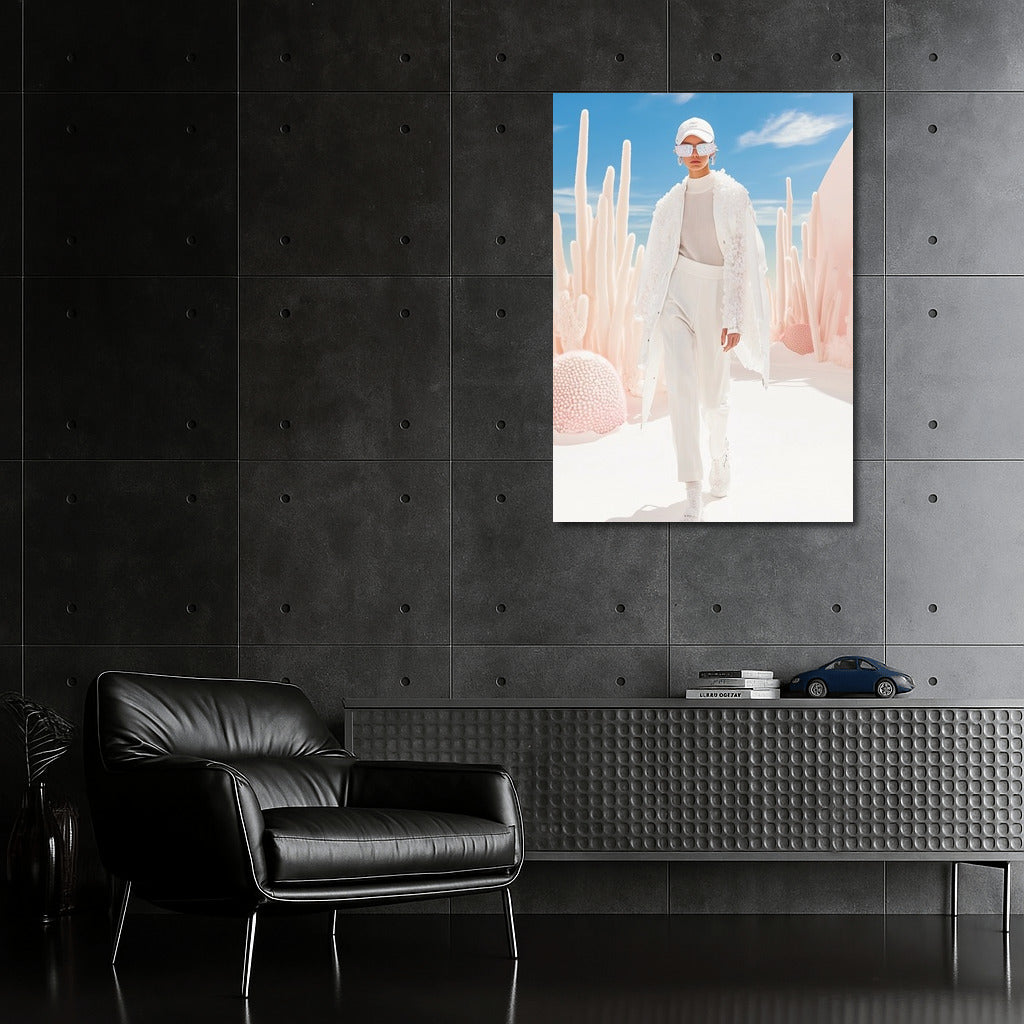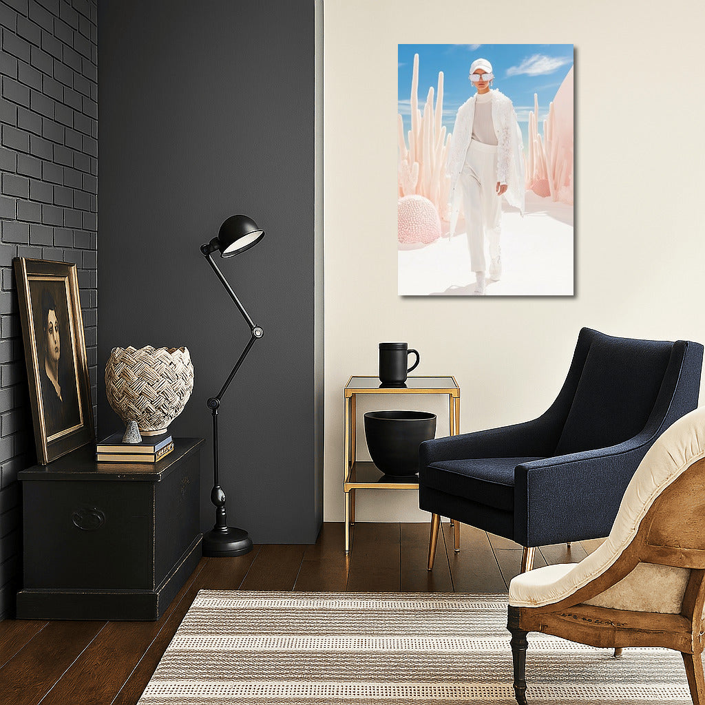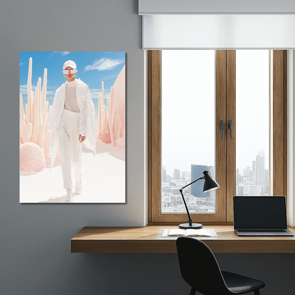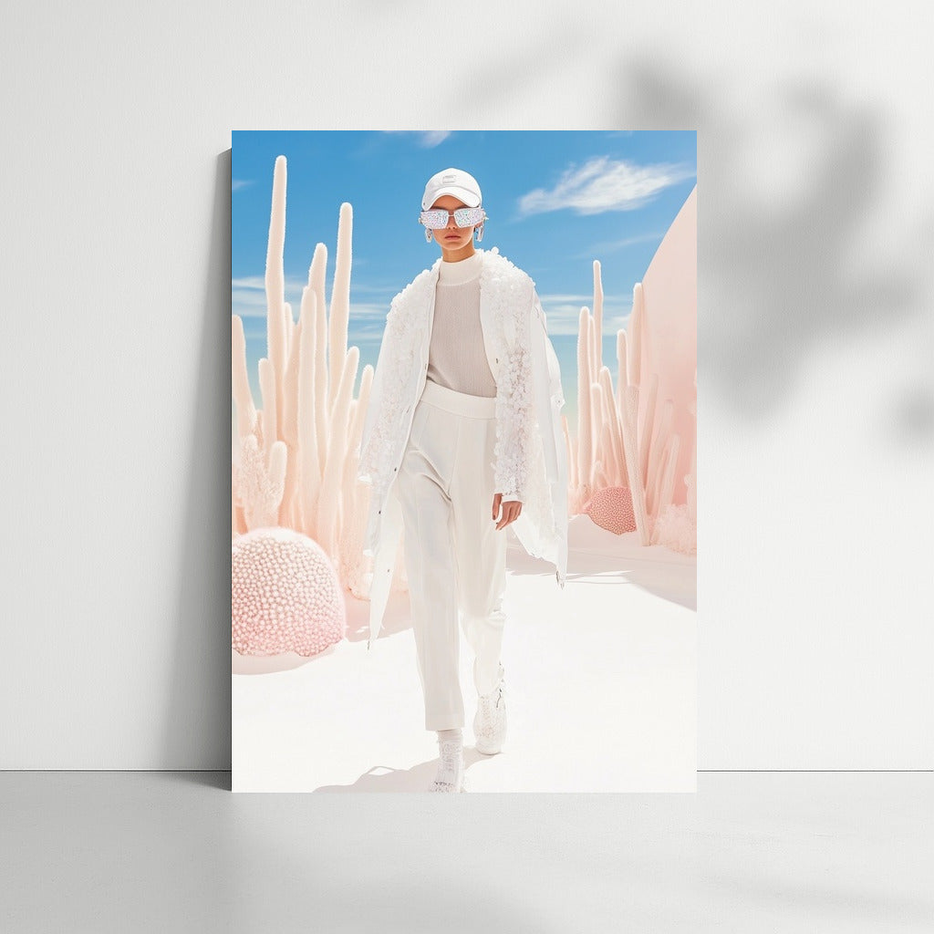Futuristic painting: stylish figure among pink corals and snow-white shades. Will decorate any interior as unique wall art! See more from the collection: Fashion Art