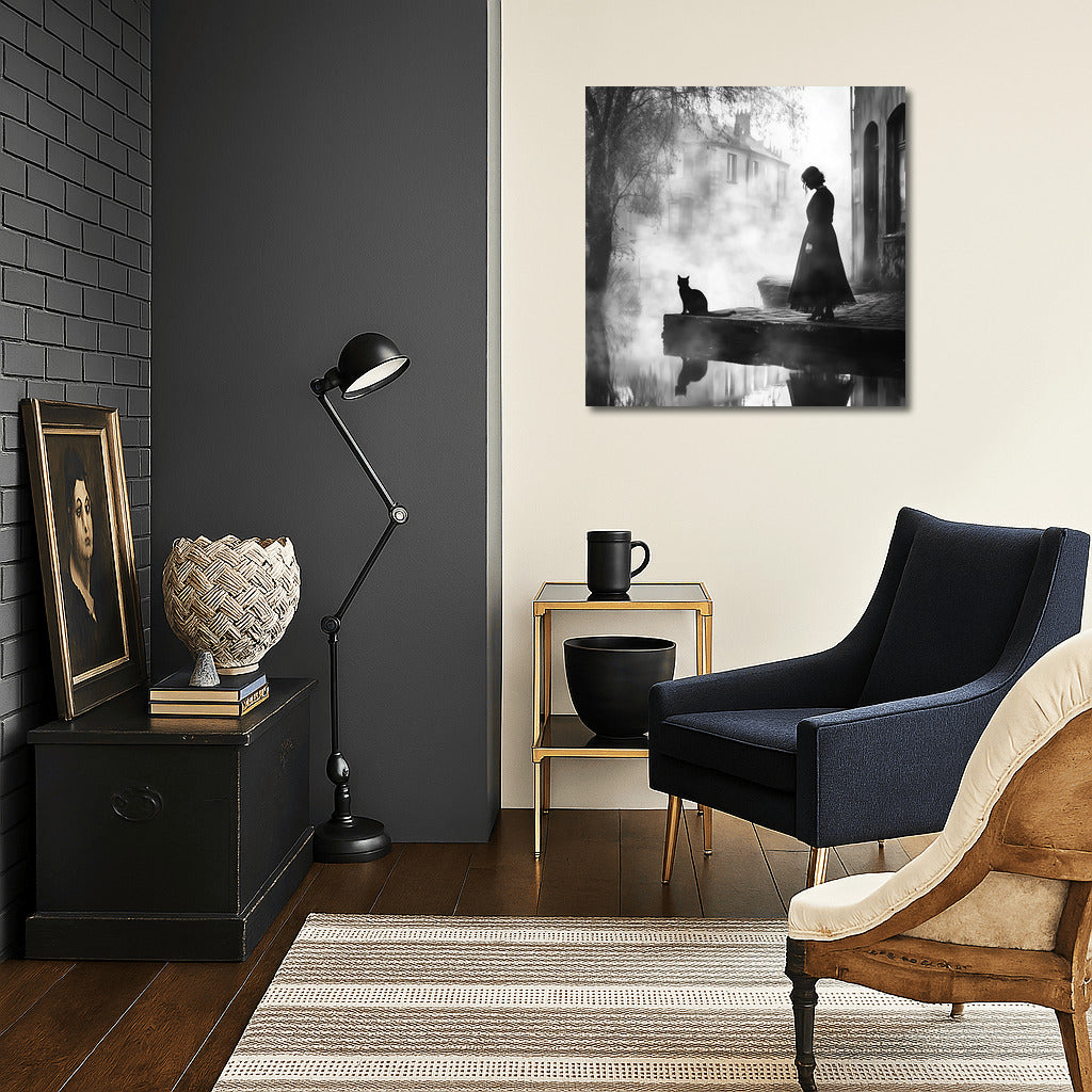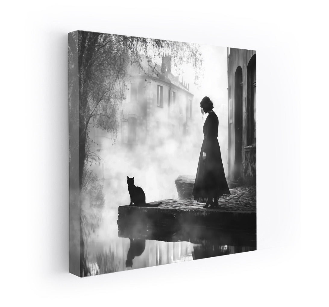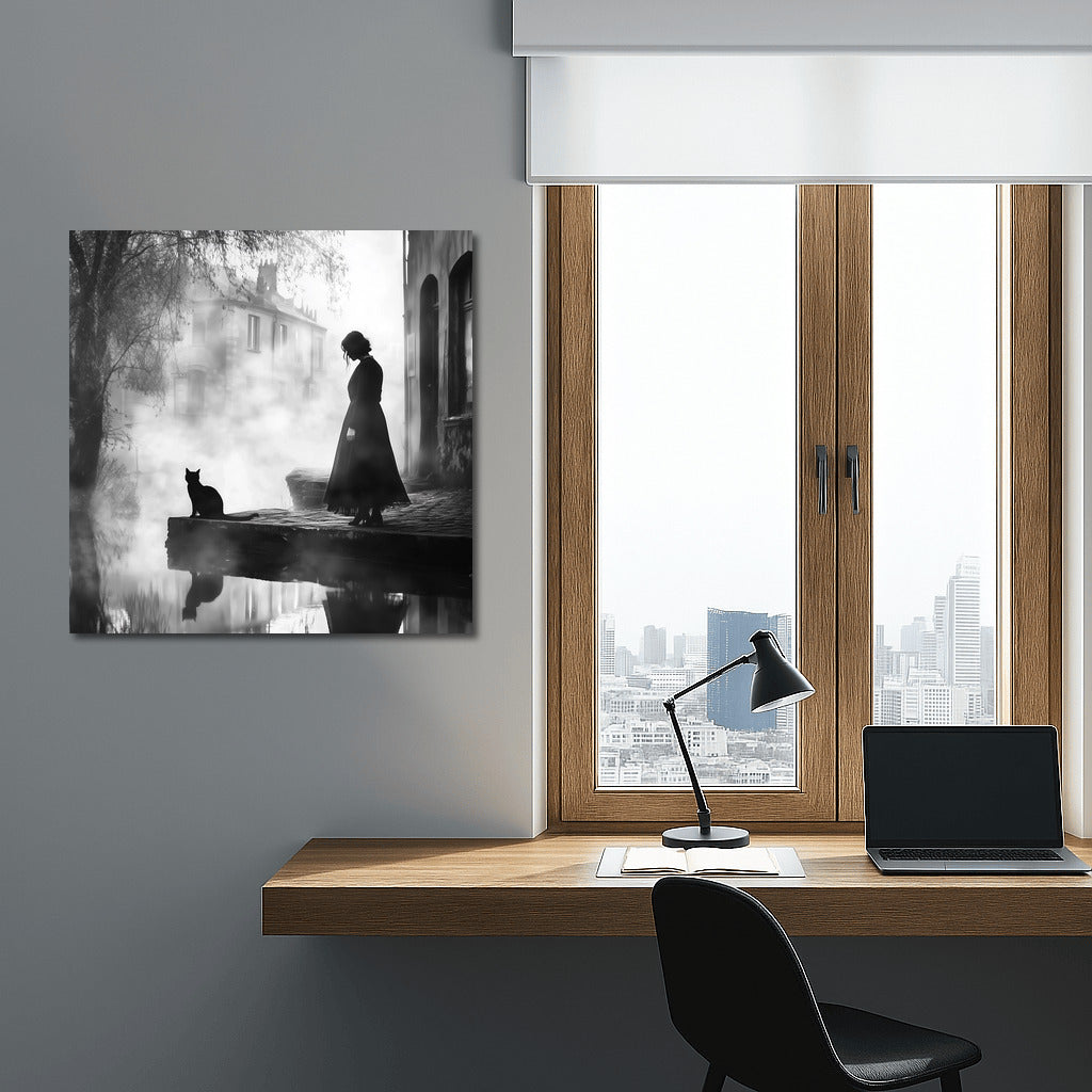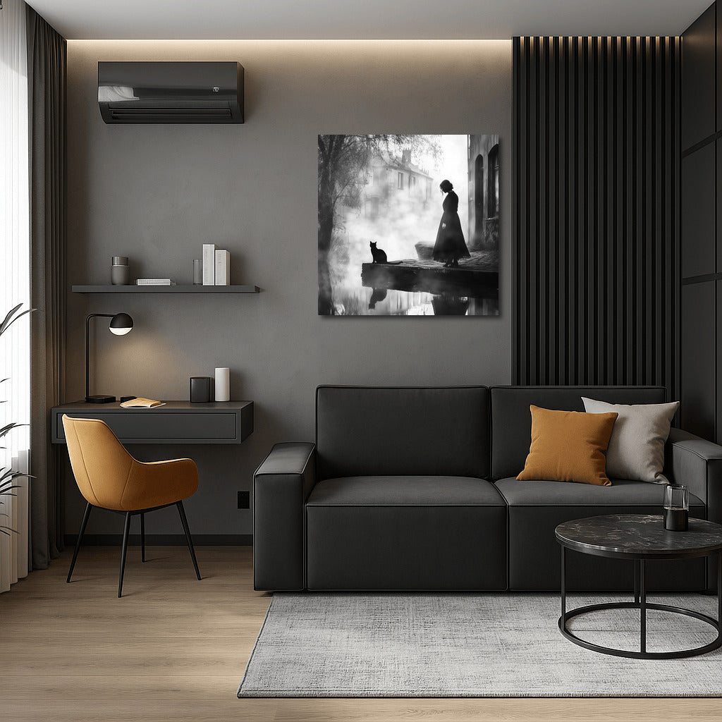 Misty insight into the world of mystery: silhouette and cat against the backdrop of a foggy city. Wall art for lovers of mysticism. See more from the collection: Black and White Art