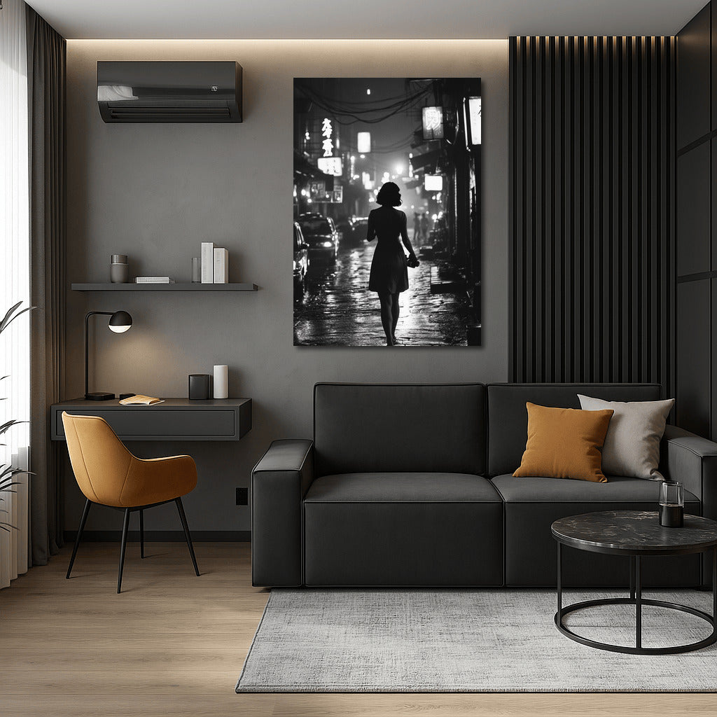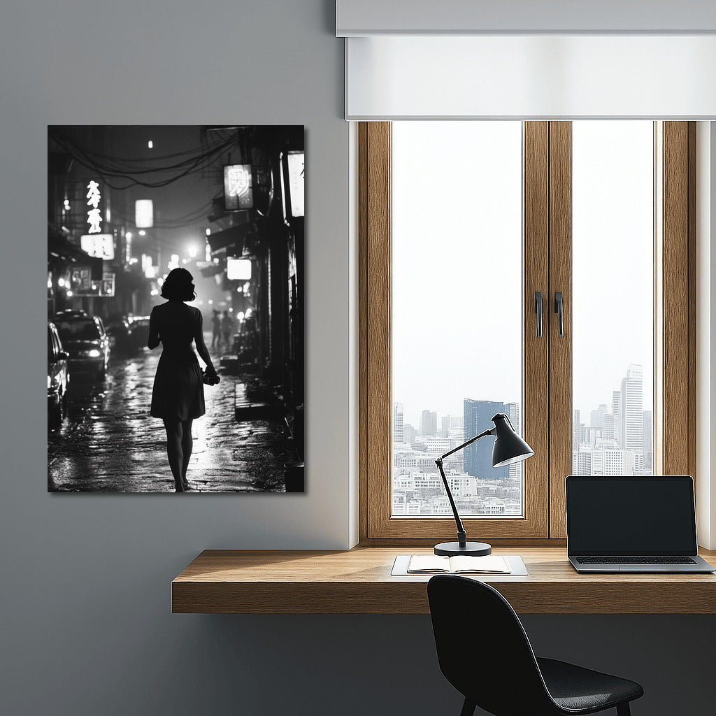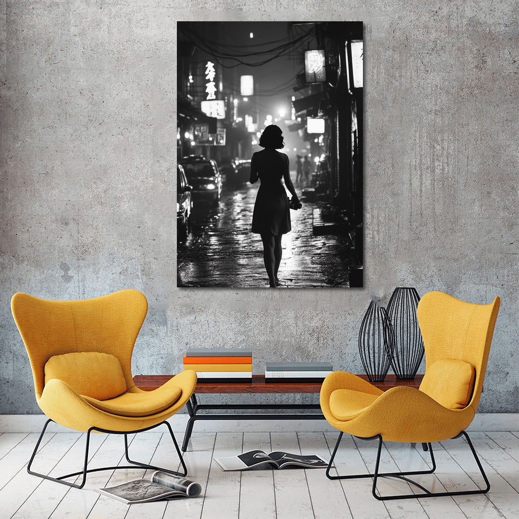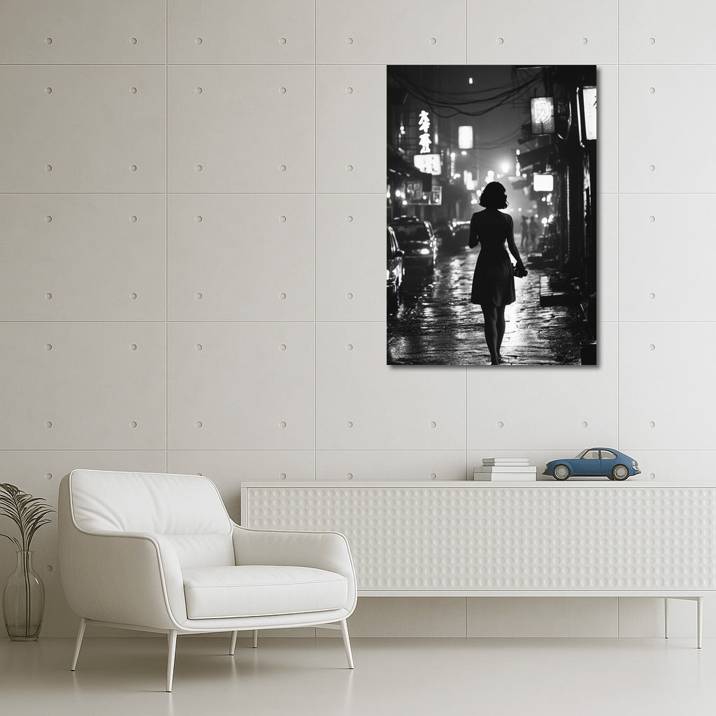 The secrets of the city at night come to life in this poster: a silhouette on a wet pavement leads the gaze into the depths of the glowing metropolis. See more from the collection: Black and White Art
