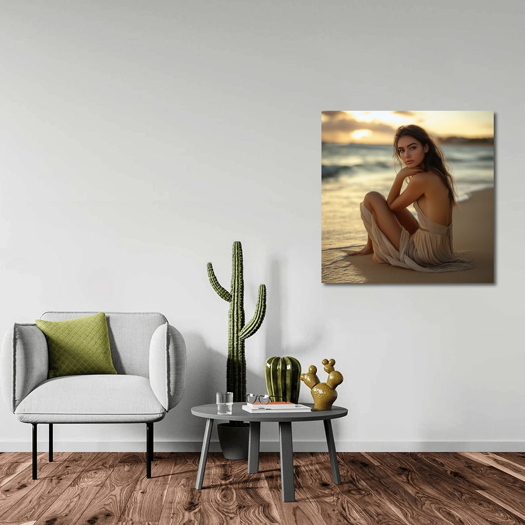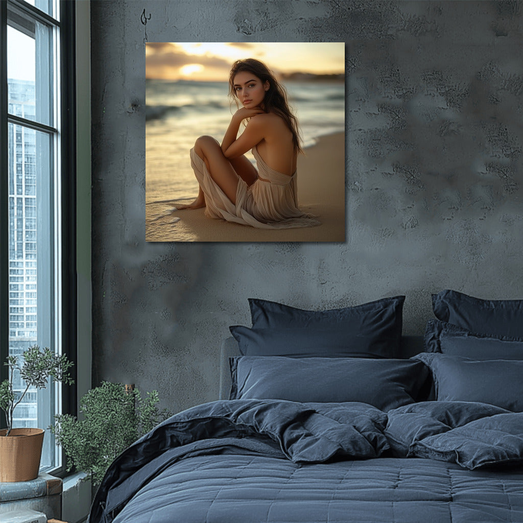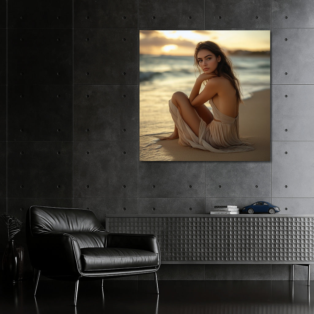 Poster: Mysterious figure by the ocean at sunset. Wall art filled with warm tones and a dreamy mood. See more from the collection: Wall Art with Women