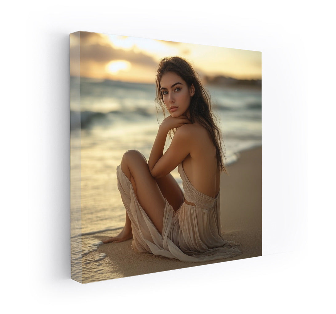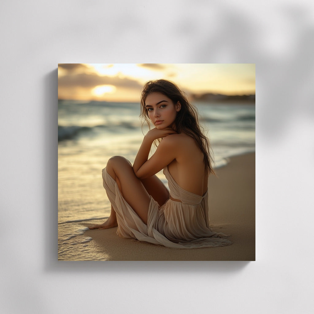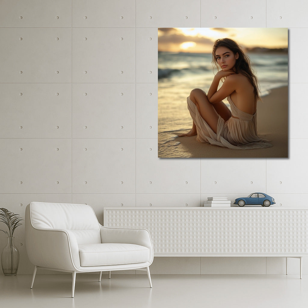 Poster: Mysterious figure by the ocean at sunset. Wall art filled with warm tones and a dreamy mood. See more from the collection: Wall Art with Women