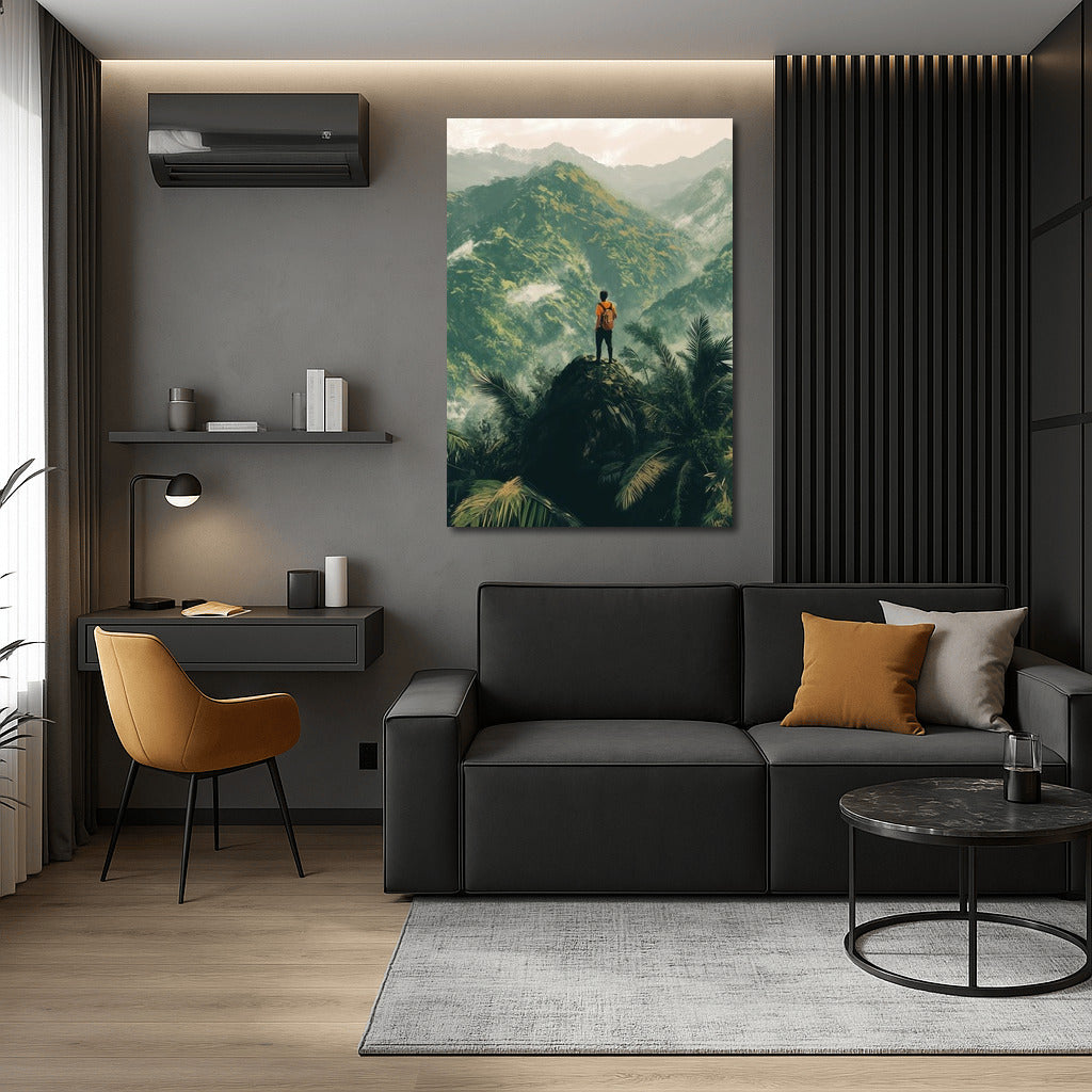 Immerse yourself in a world of adventure with this breathtaking painting: a mysterious silhouette in front of endless mountains. Dream wall art! See more from the collection: Mountains & Hills Art