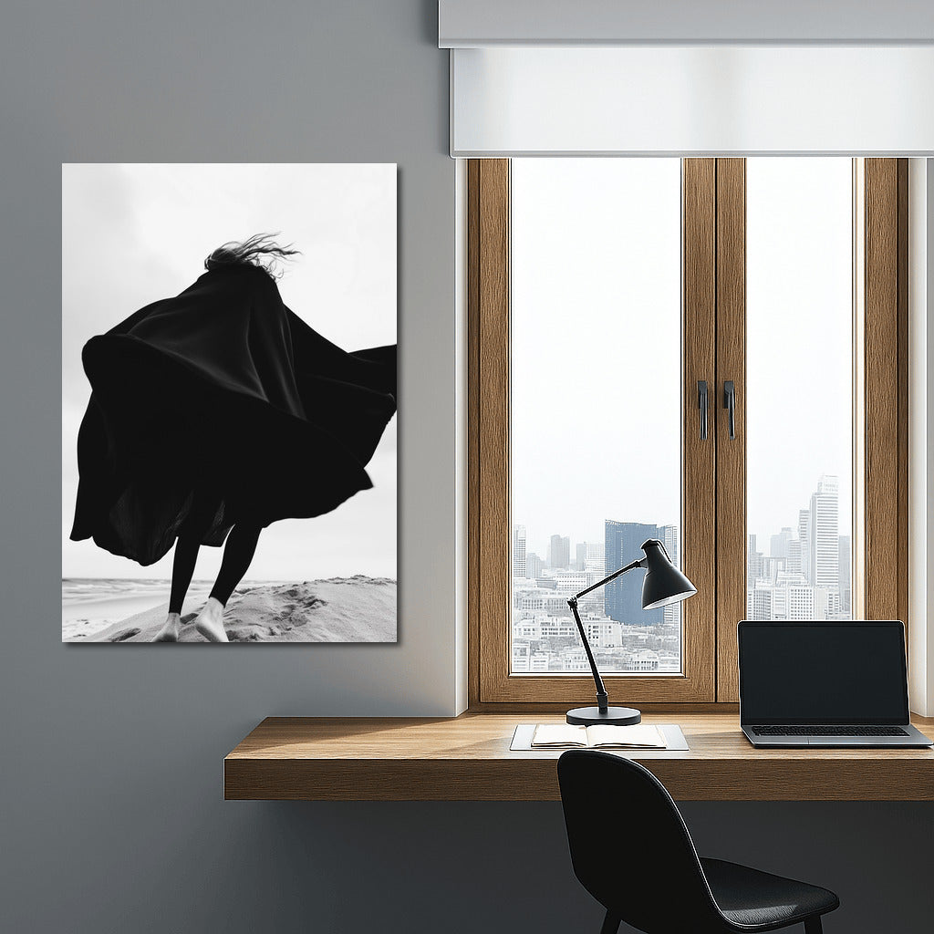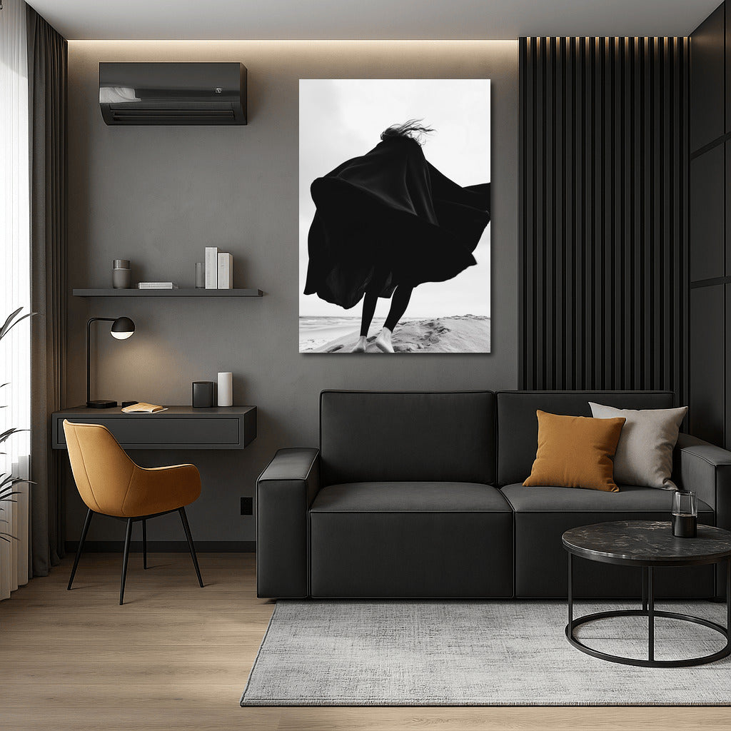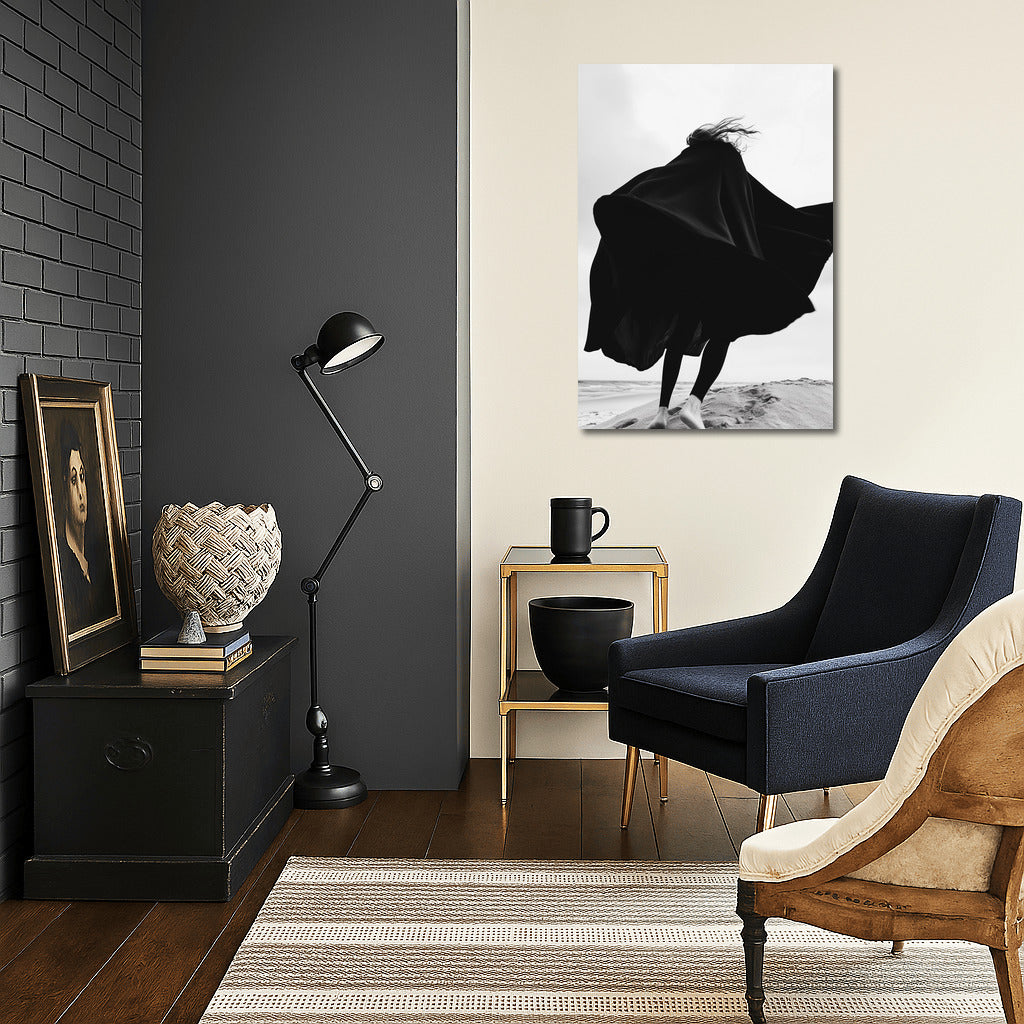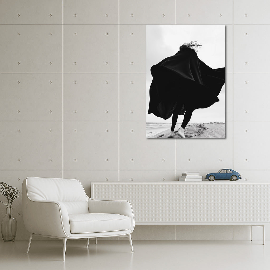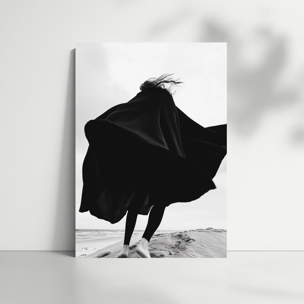 Silhouette dancing in the wind against the beach. Black and white painting that gives freedom and inspiration. Wall art in motion. See more from the collection: Black and White Art