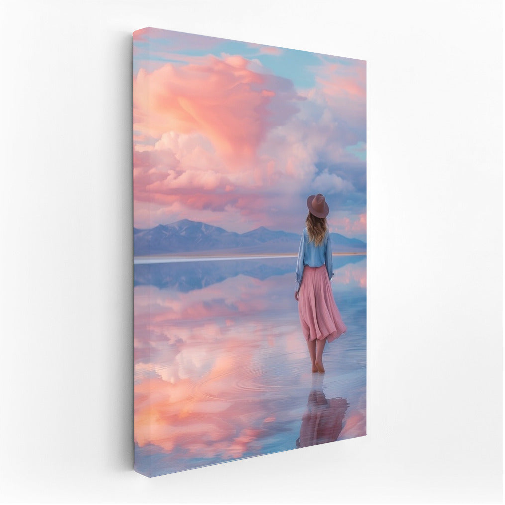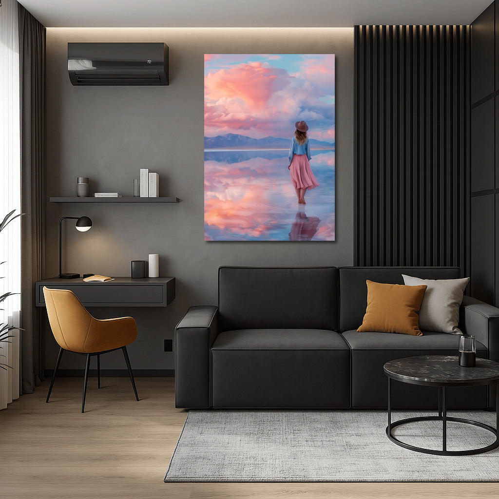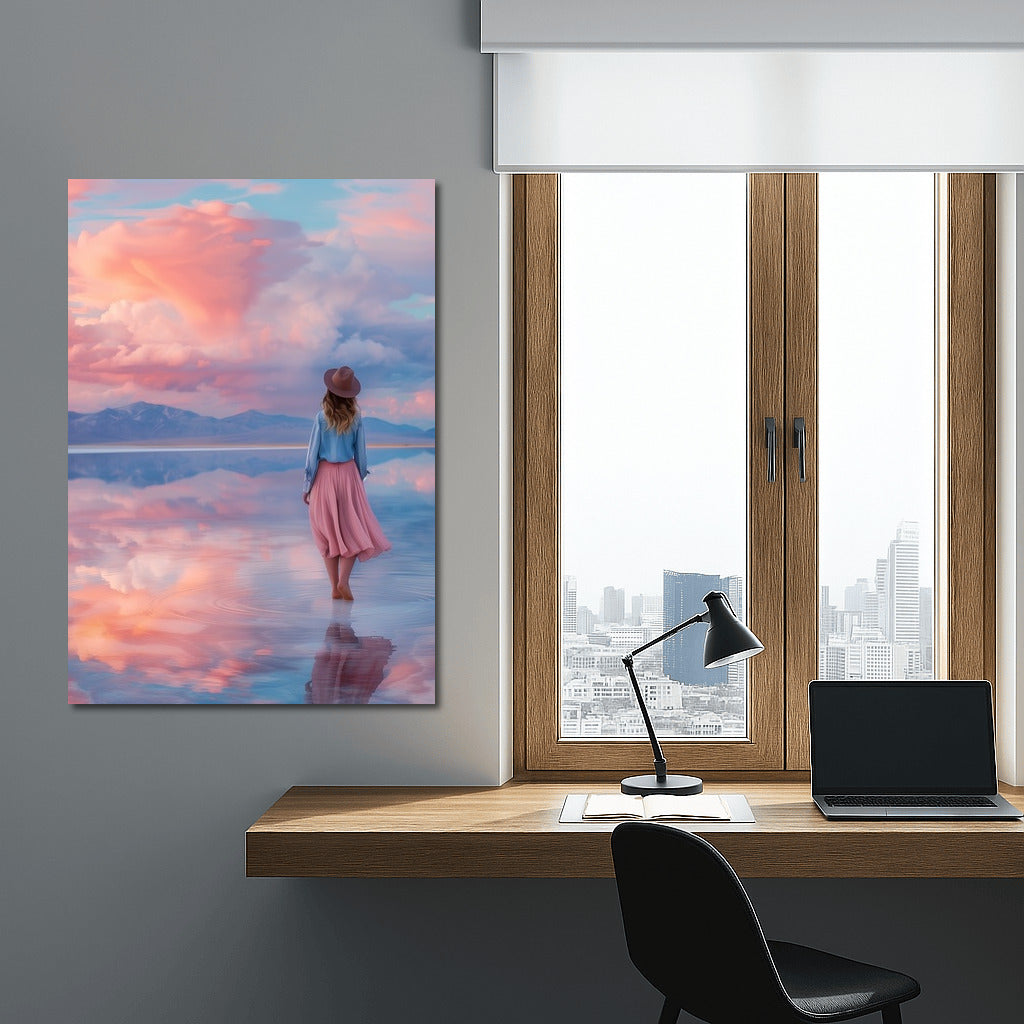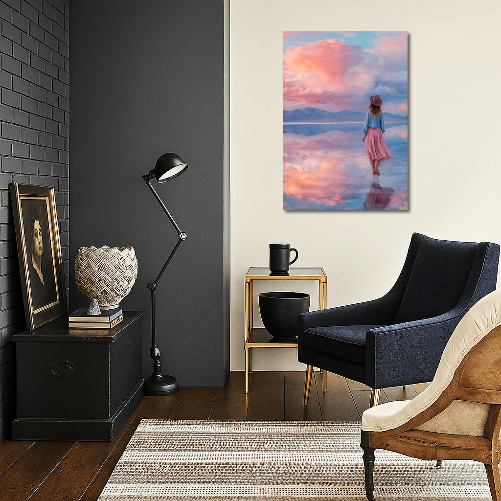 Dive into a dreamy atmosphere: a poster with a sunset reflection and a mysterious figure over a serene water surface. Wall art! See more from the collection: Mixed Wall Art