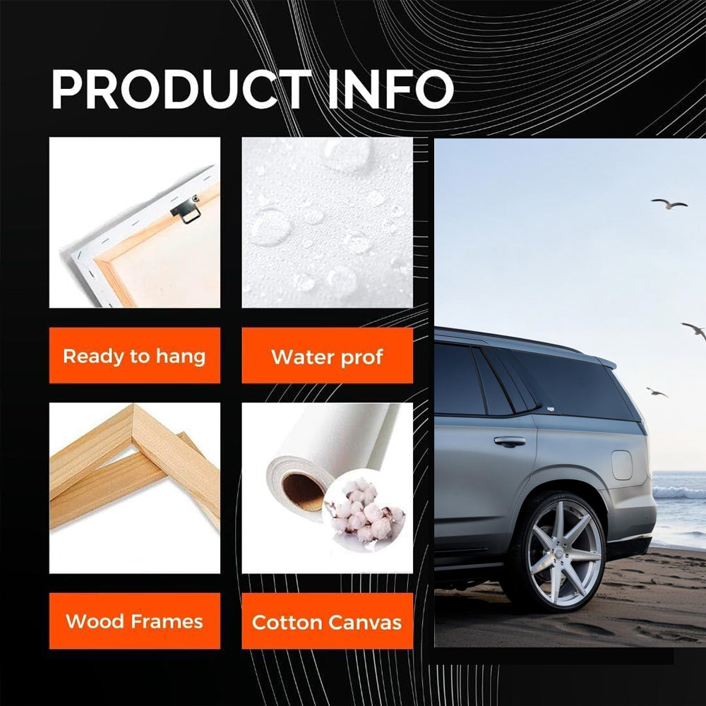 This painting is pure adrenaline for car lovers. The Cadillac in gray looks like it came straight out of a dream poster. It sits on the beach as if it just came out of a wave. This is wall art for those who live life in the fast lane. See more from the collection: Cadillac Art