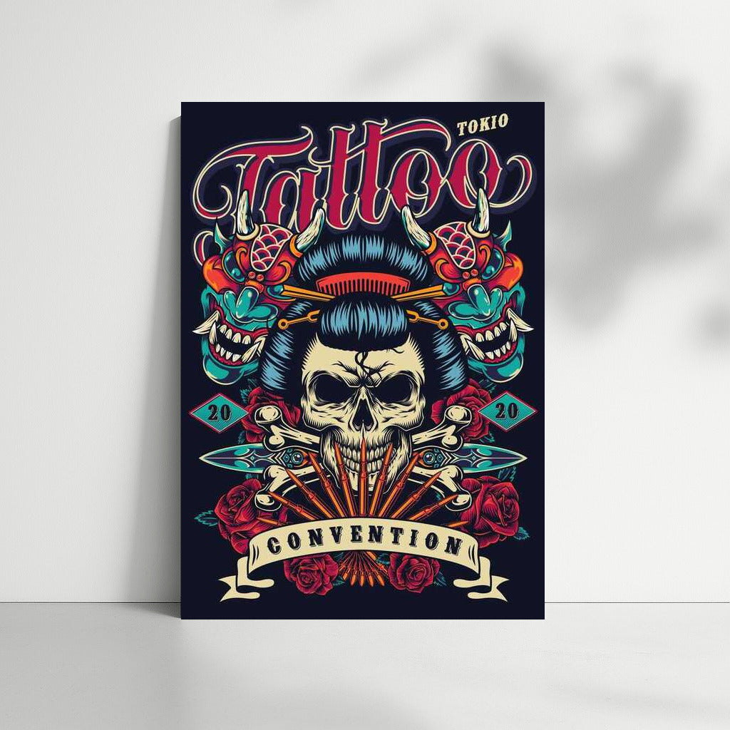 A vibrant poster with skull and masks inspired by tattoo culture. Bold wall art for true tattoo lovers. See more from the collection: Tattoo Art