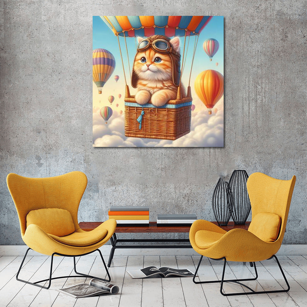 Dive into a dream with the Hot Air Balloon Cat 2 poster. The pilot kitten is going on a sky journey! Wall magic. See more from the collection: Animals Art