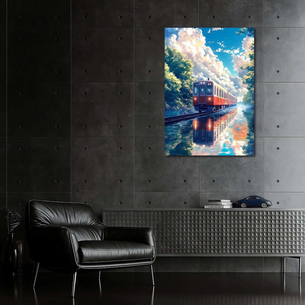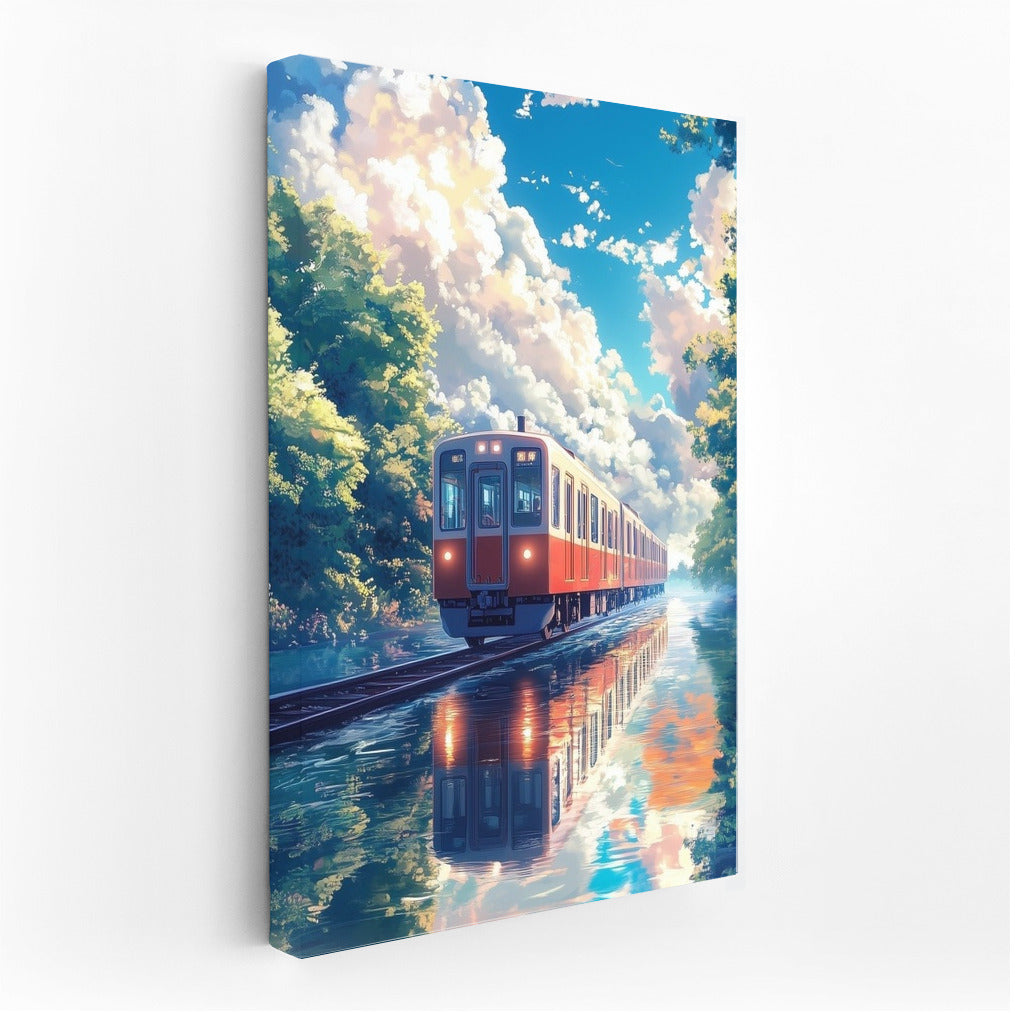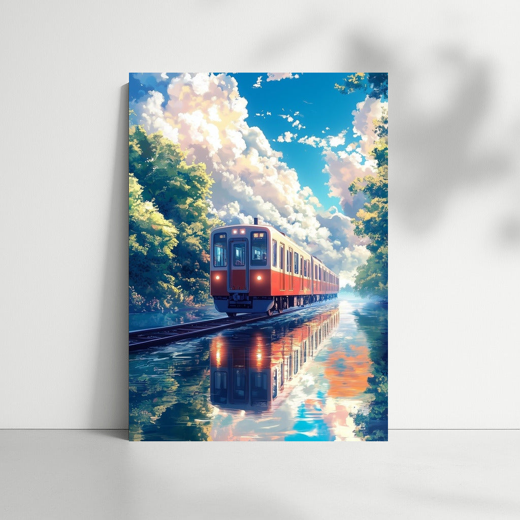 Dream train glides over the water surface, reflecting the sky and clouds. Amazing wall art for a bright interior. See more from the collection: Anime & Manga genres Art