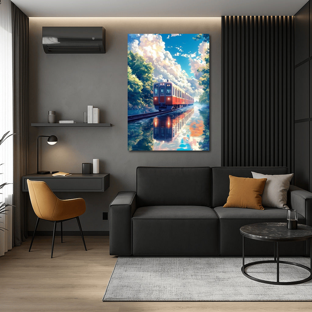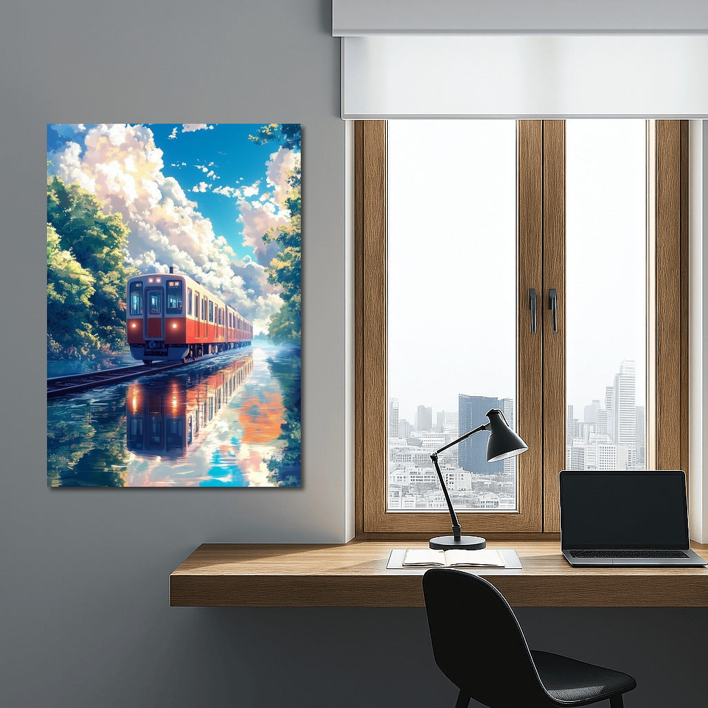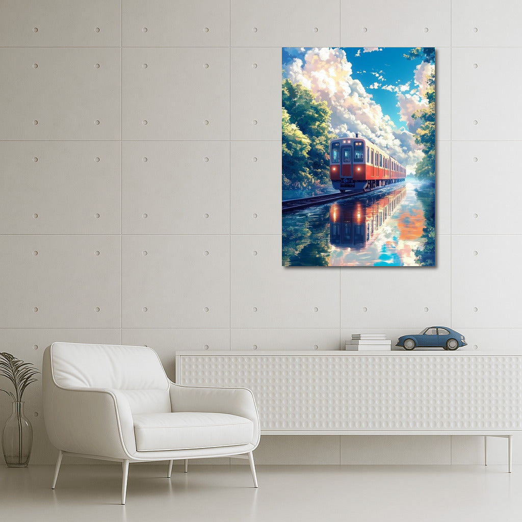 Dream train glides over the water surface, reflecting the sky and clouds. Amazing wall art for a bright interior. See more from the collection: Anime & Manga genres Art